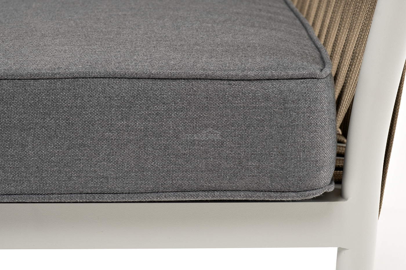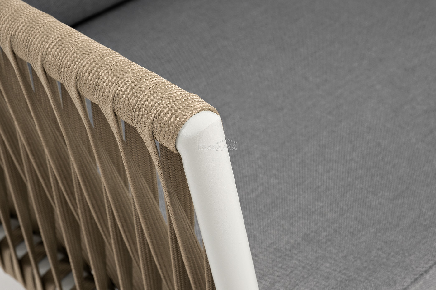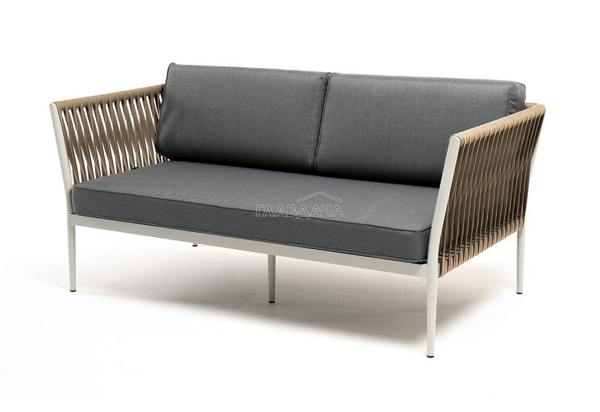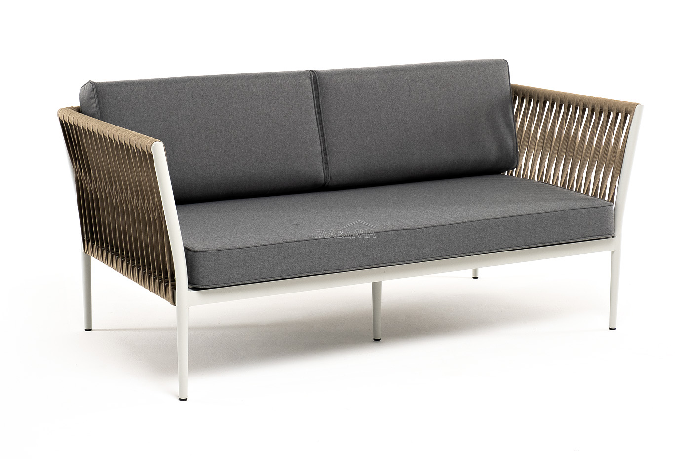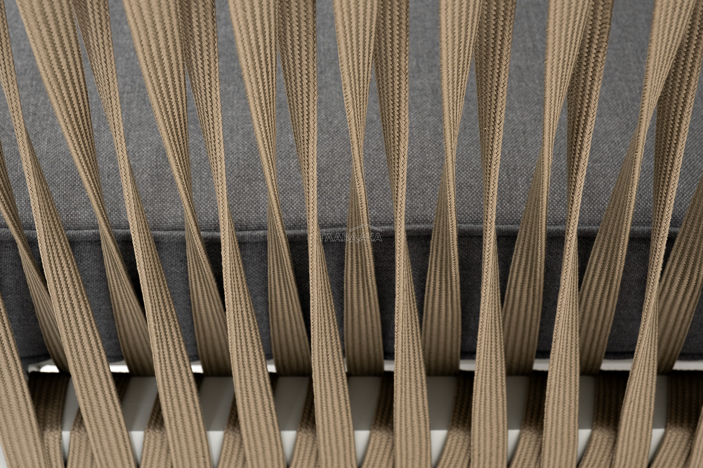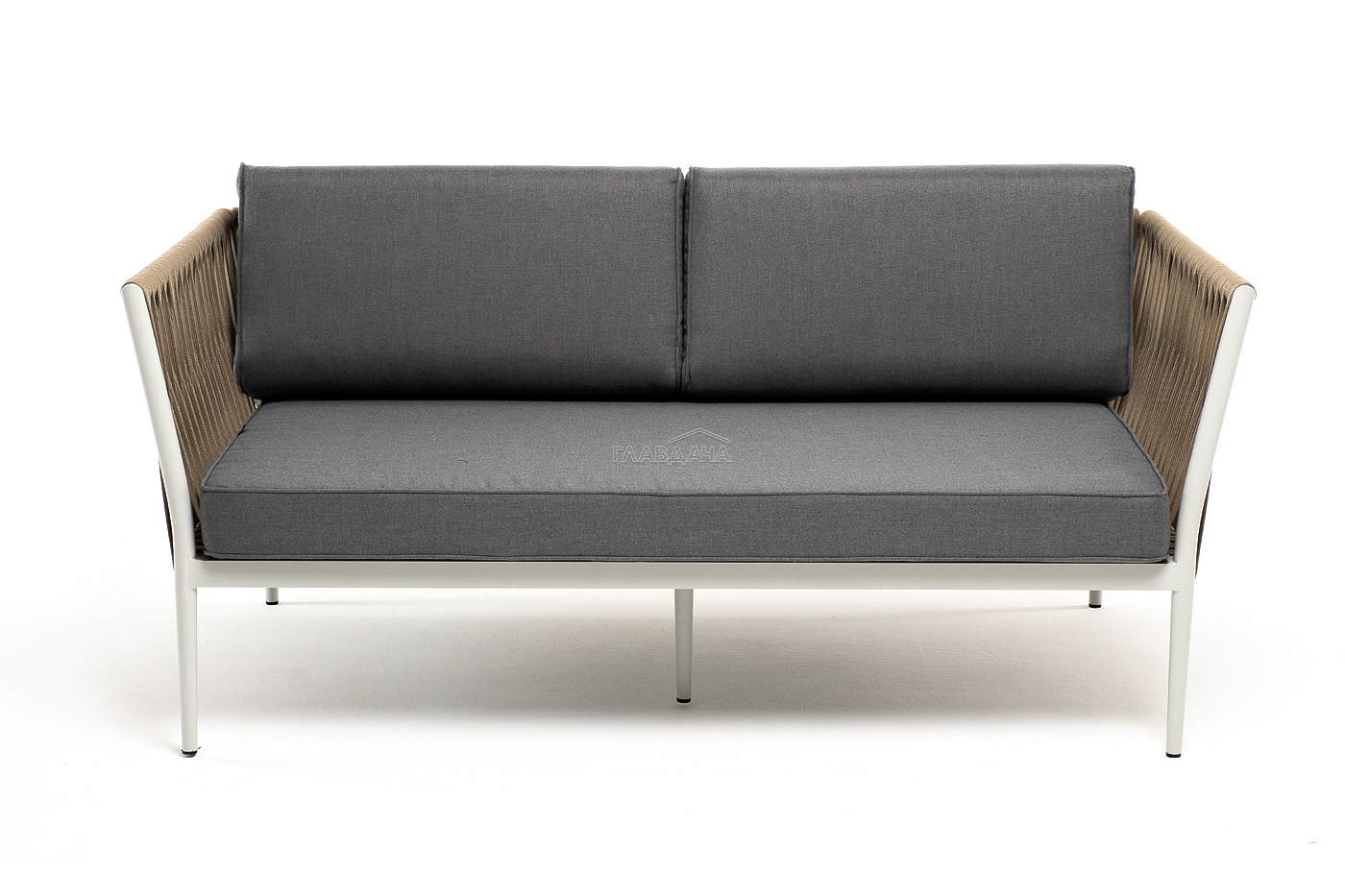 Диван имеет алюминиевый каркас, окрашенный порошковой краской в светло-серый (RAL7035) цвет. Боковины каркаса вручную оплетены роупом - эластичными синтетическими лентами, изготовленными из высокопрочных полиэфирных волокон. Цвет оплетки - серо-коричневый.