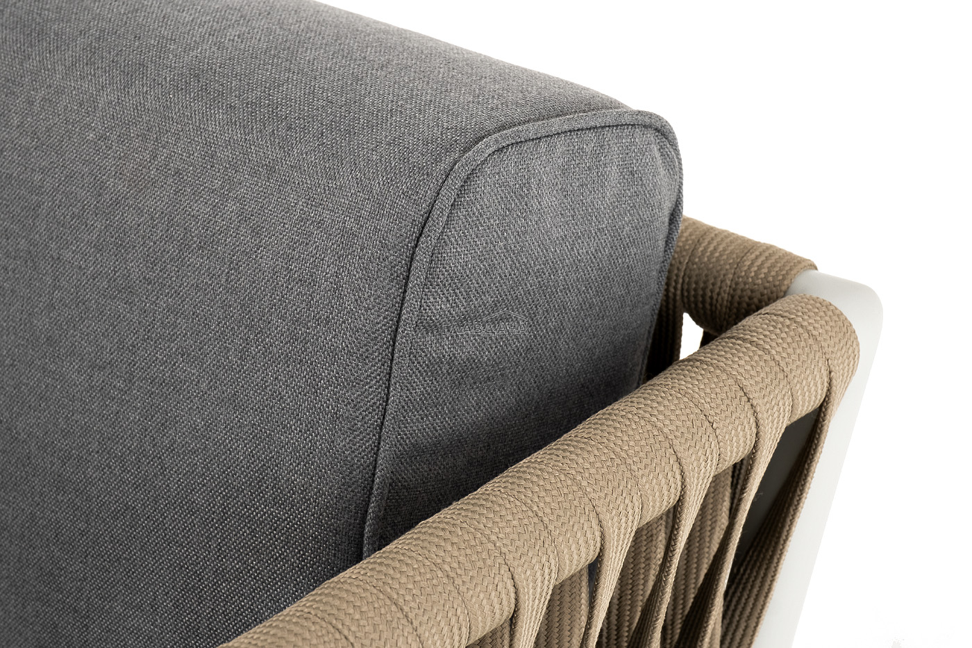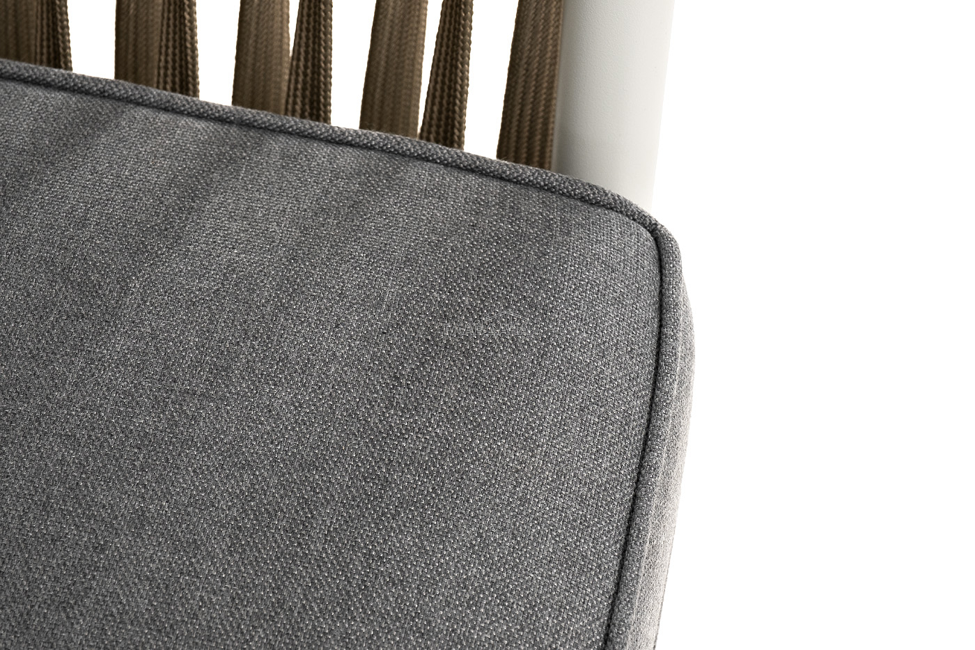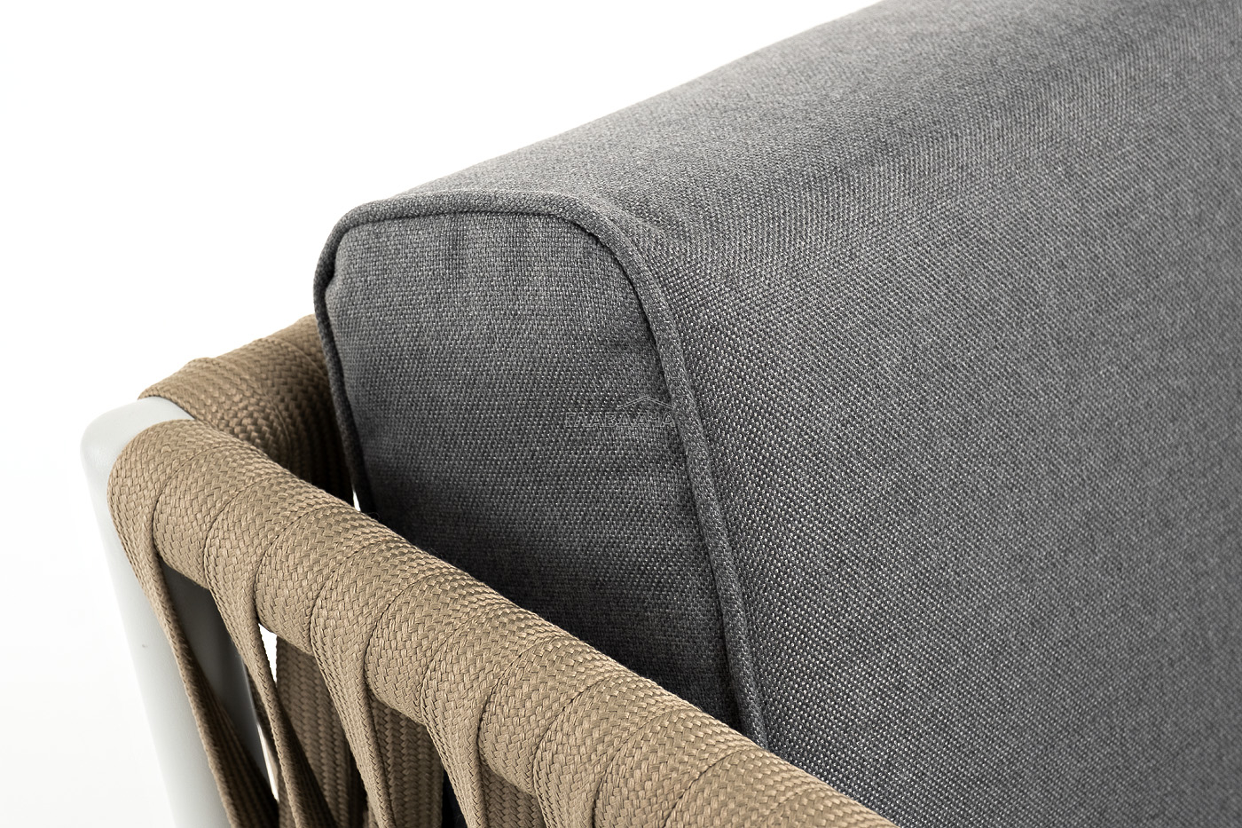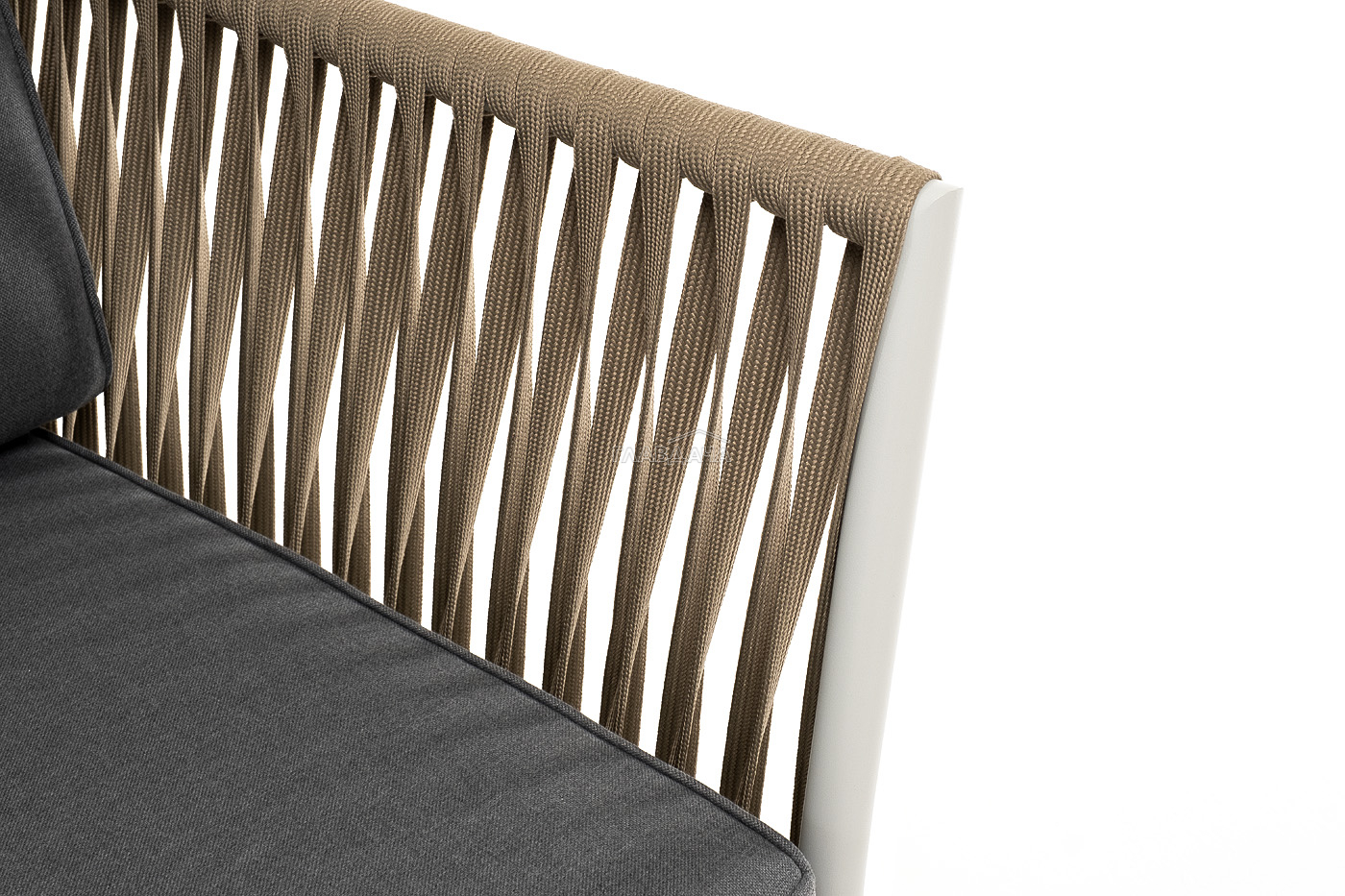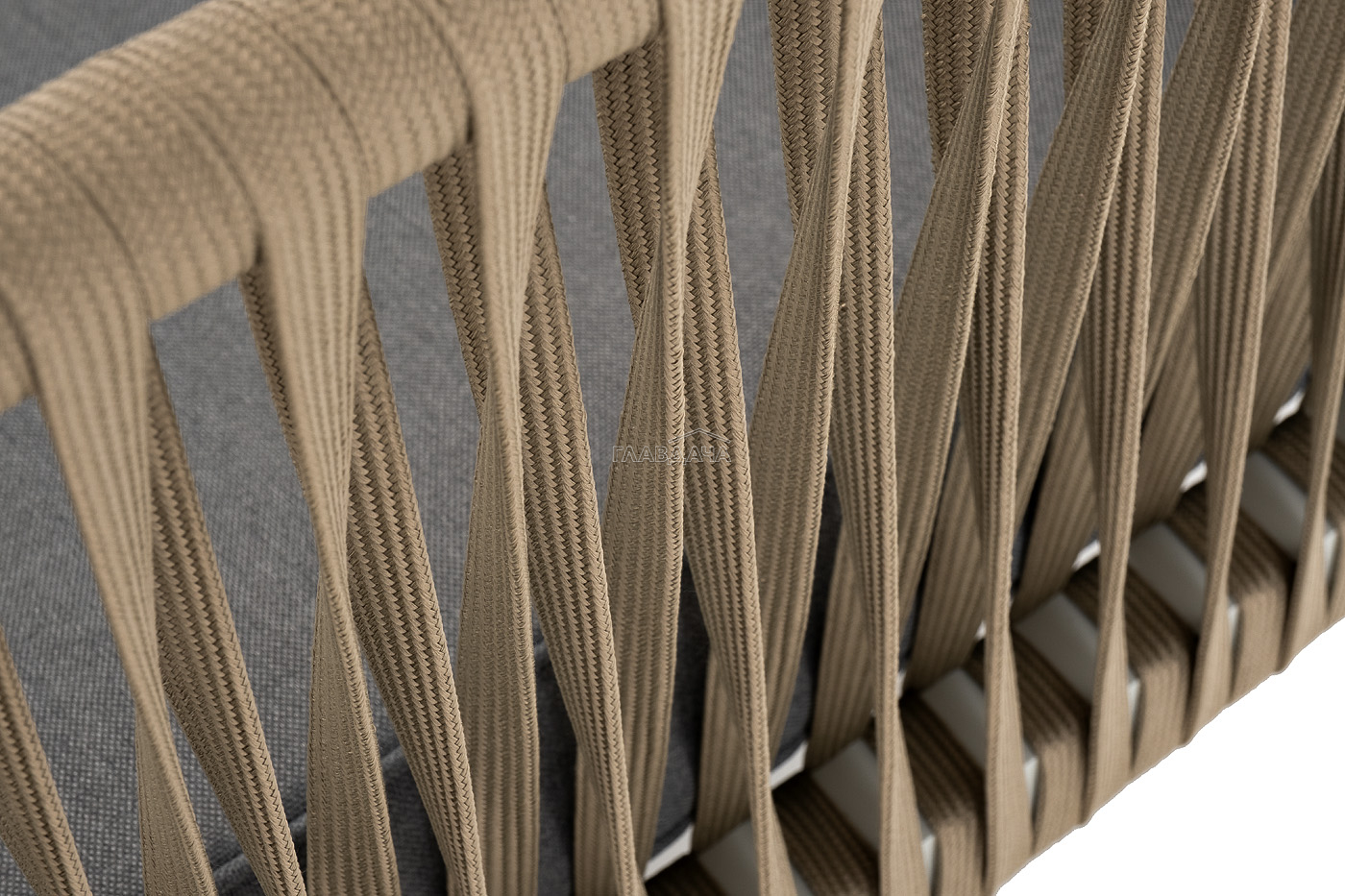 Диван имеет алюминиевый каркас, окрашенный порошковой краской в светло-серый (RAL7035) цвет. Боковины каркаса вручную оплетены роупом - эластичными синтетическими лентами, изготовленными из высокопрочных полиэфирных волокон. Цвет оплетки - серо-коричневый.