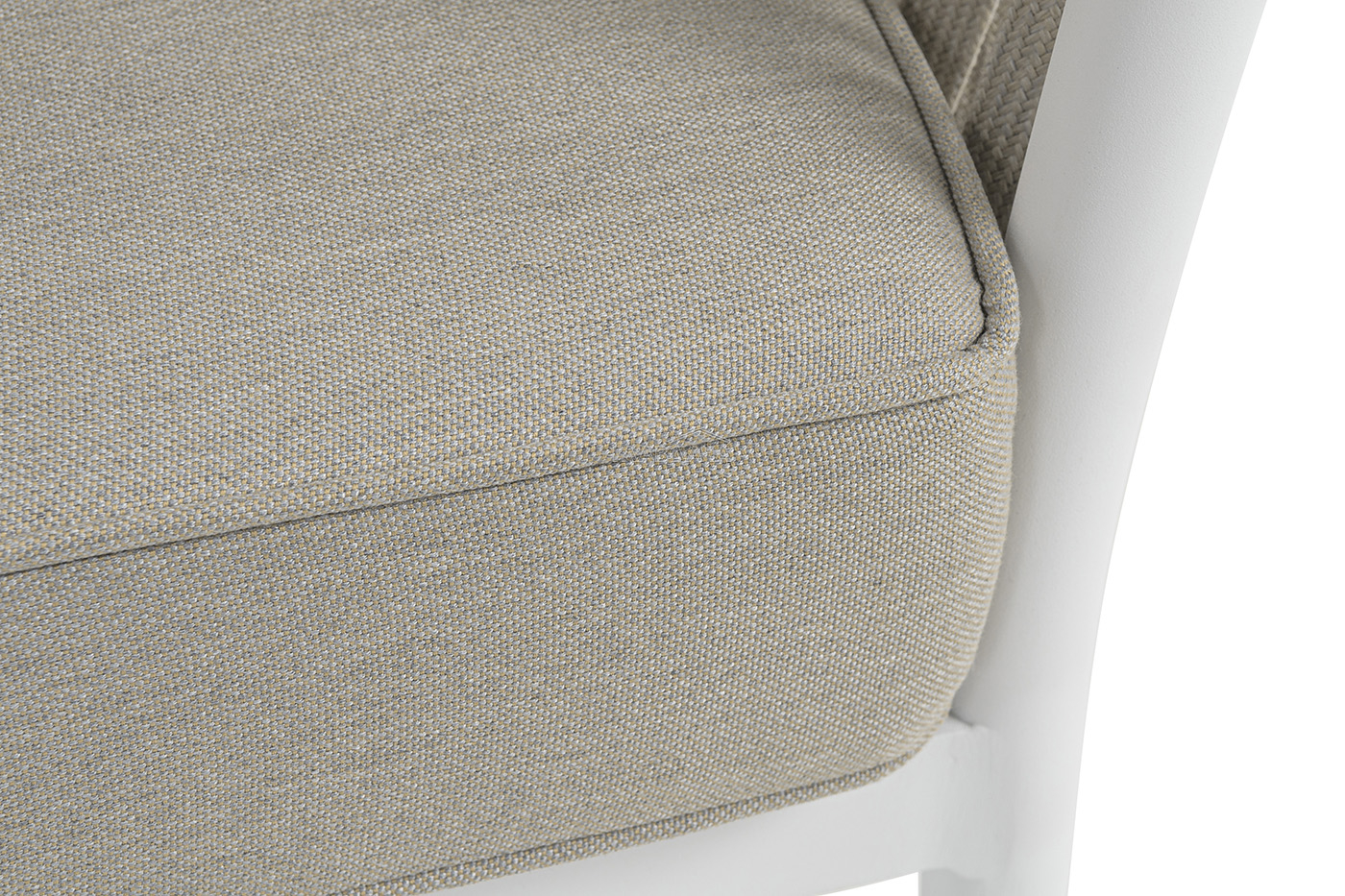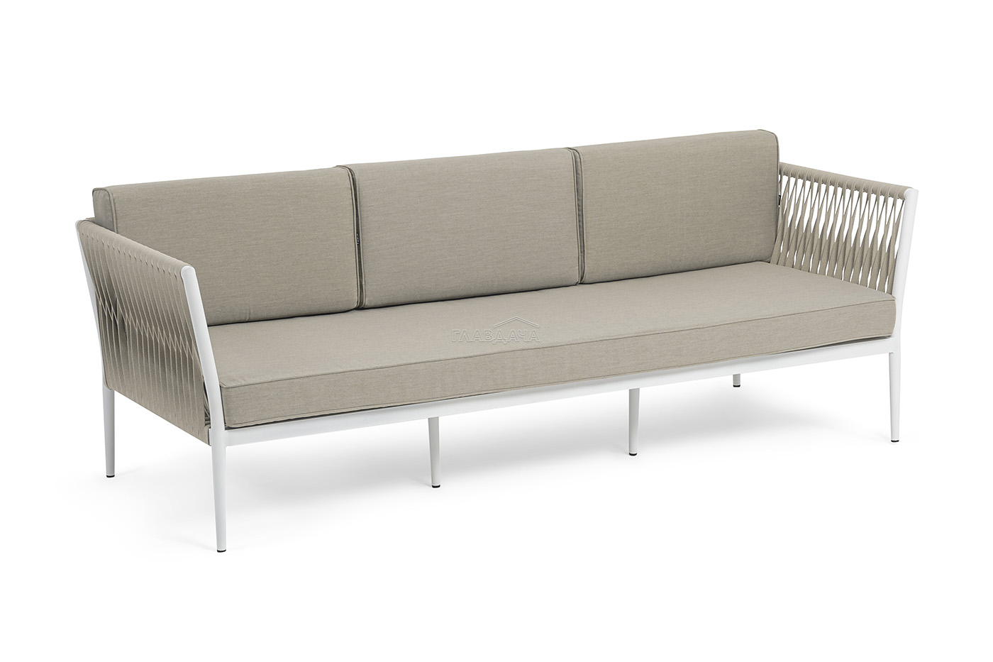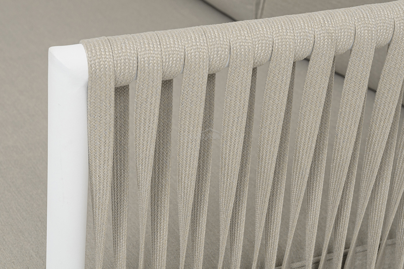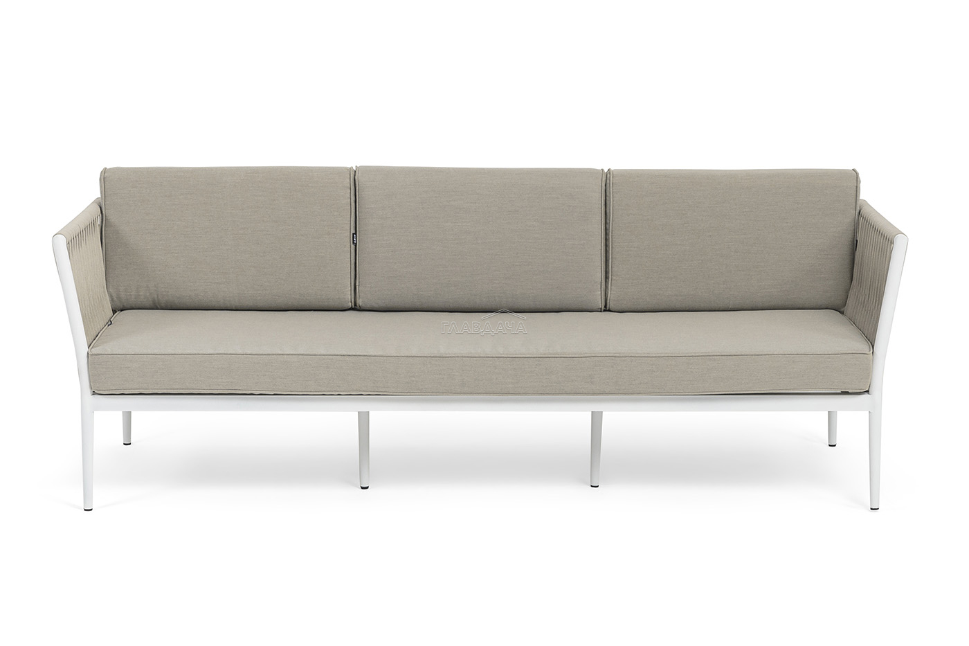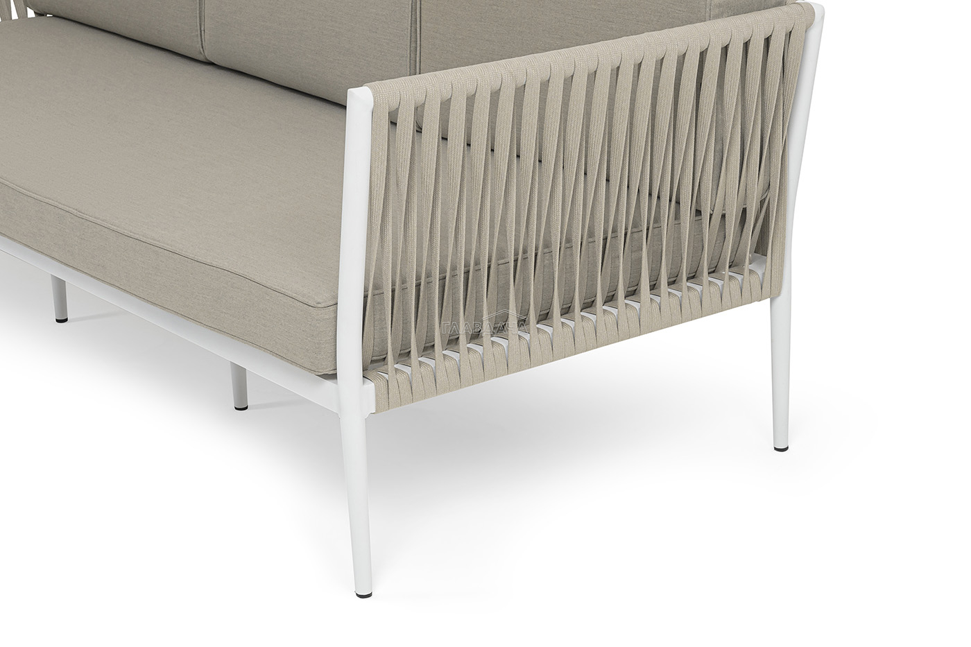 Диван имеет алюминиевый каркас, окрашенный порошковой краской в белый цвет. Боковины каркаса вручную оплетены роупом - эластичными синтетическими лентами, изготовленными из высокопрочных полиэфирных волокон. Цвет оплетки - бежевый.
