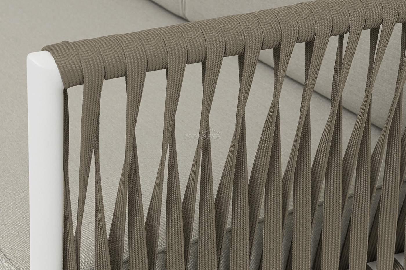 Диван имеет алюминиевый каркас, окрашенный порошковой краской в светло-серый (RAL7035) цвет. Боковины каркаса вручную оплетены роупом - эластичными синтетическими лентами, изготовленными из высокопрочных полиэфирных волокон. Цвет оплетки - серо-коричневый.