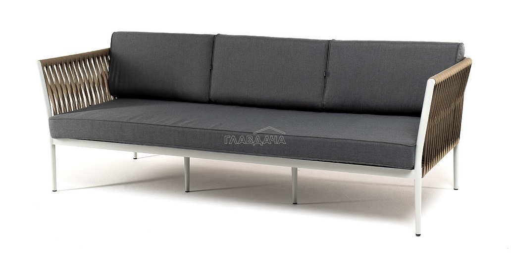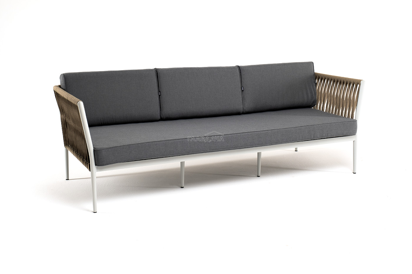 Диван имеет алюминиевый каркас, окрашенный порошковой краской в светло-серый (RAL7035) цвет. Боковины каркаса вручную оплетены роупом - эластичными синтетическими лентами, изготовленными из высокопрочных полиэфирных волокон. Цвет оплетки - серо-коричневый.