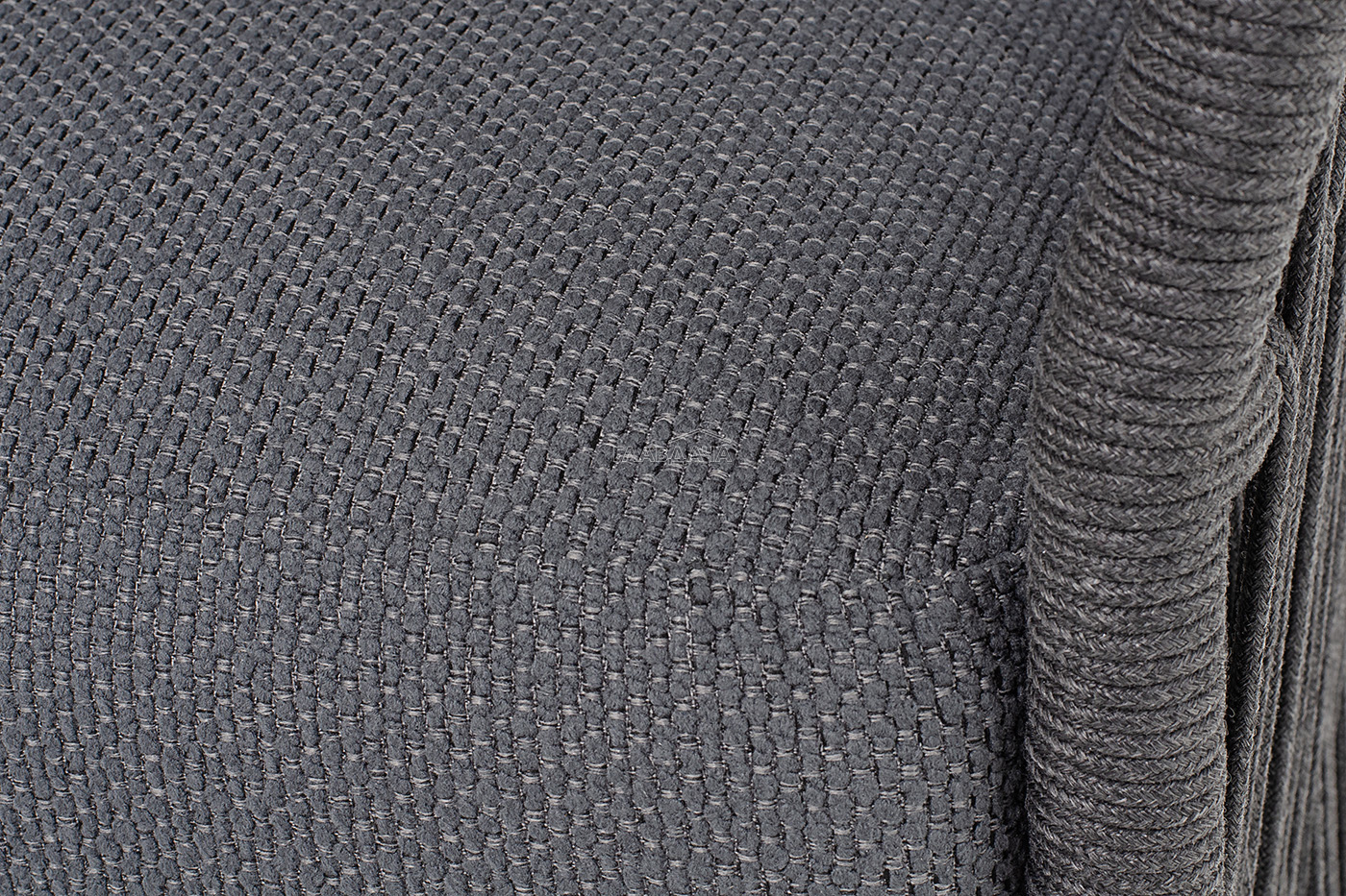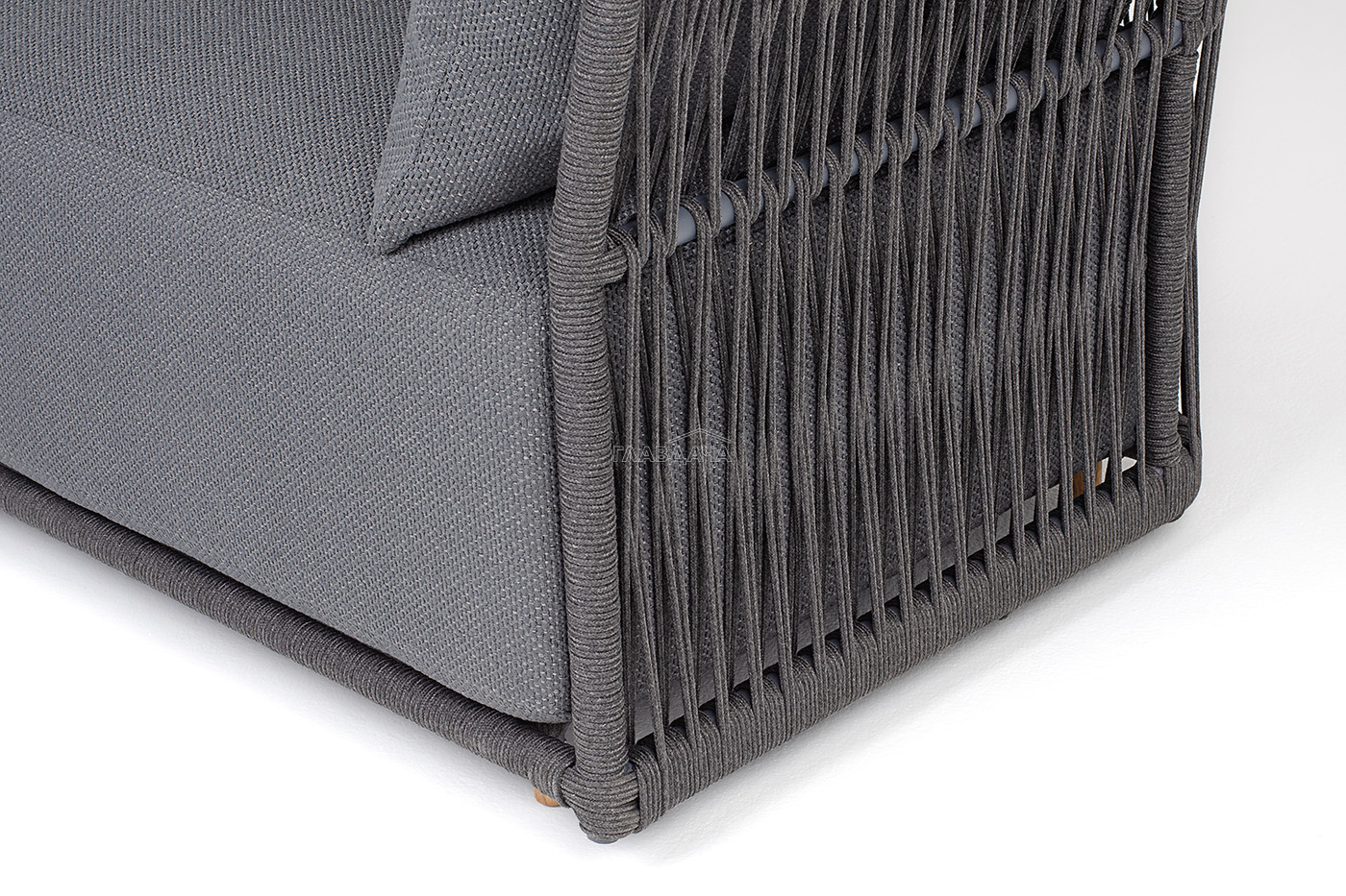Диван имеет алюминиевый каркас, окрашенный порошковой краской в темно-серый (RAL7024) цвет. Боковины каркаса и спинка вручную оплетены роупом - эластичными синтетическими лентами, изготовленными из высокопрочных полиэфирных волокон. Цвет оплетки в тон каркасу - темно-серый.
