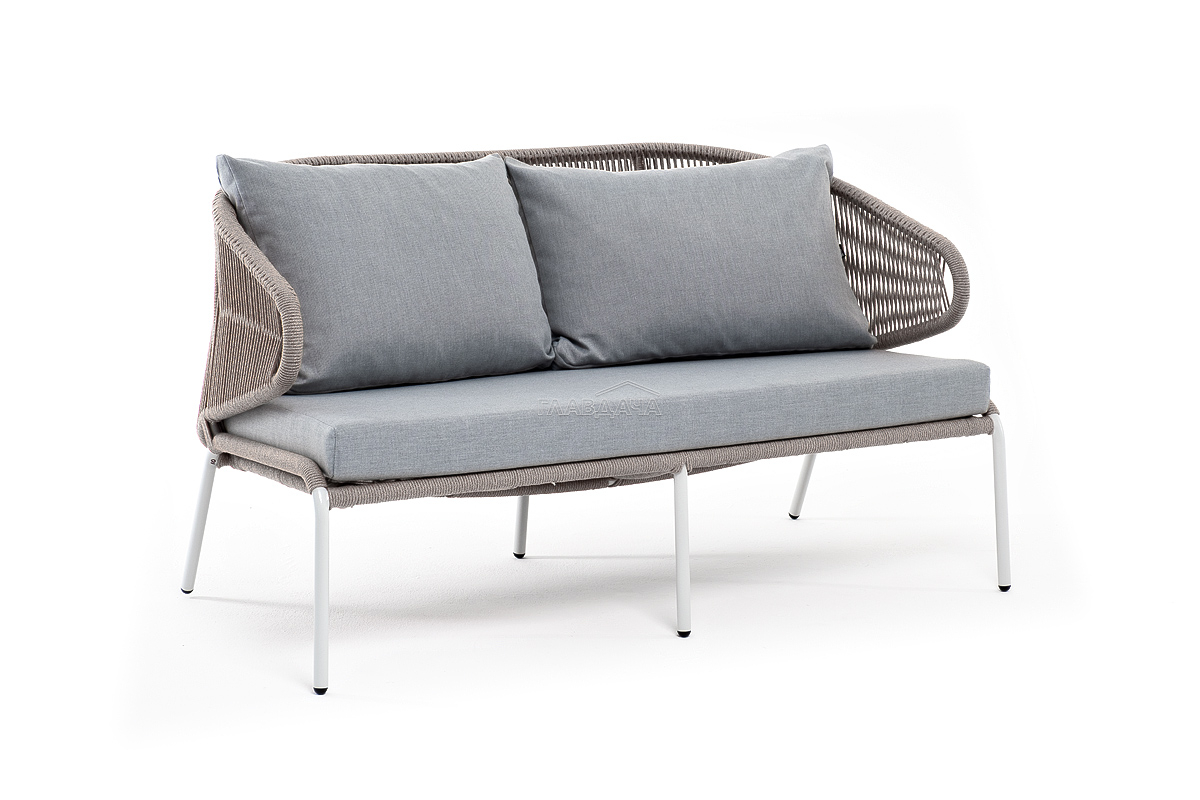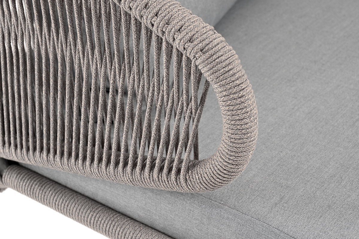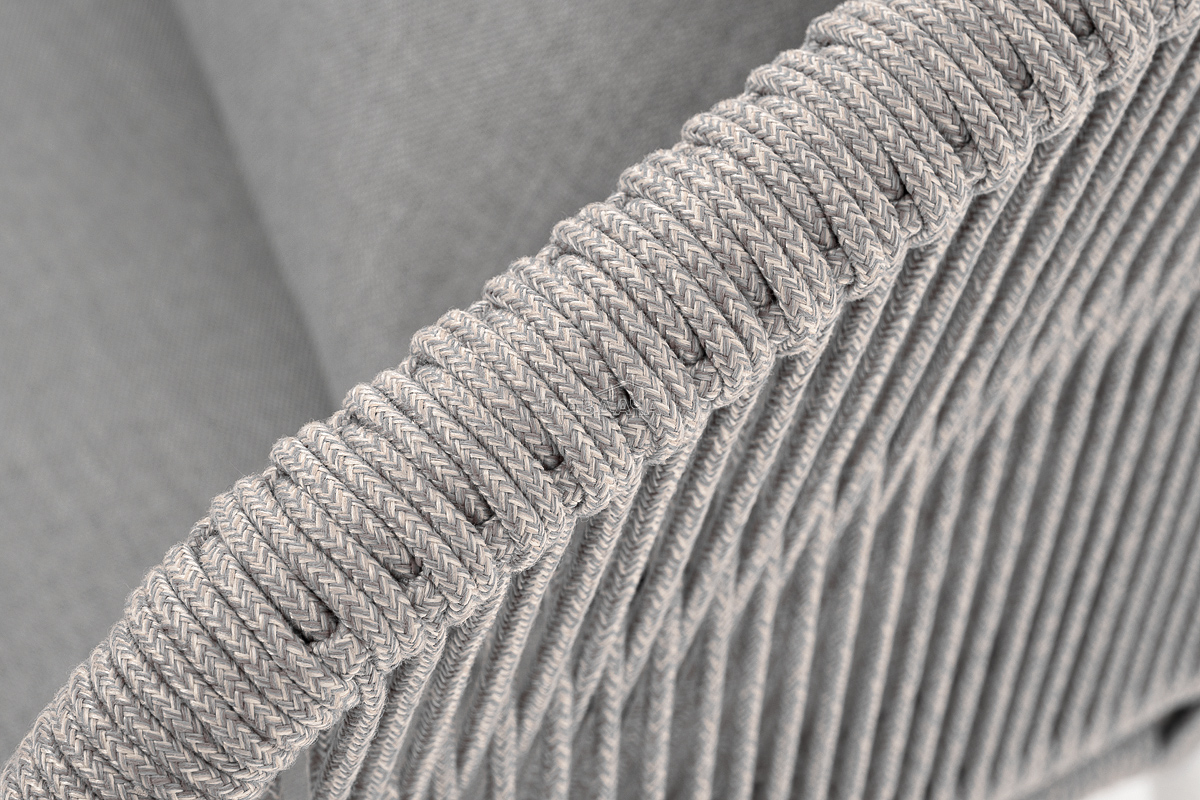 Диван имеет алюминиевый каркас, окрашенный порошковой краской в светло-серый (RAL7035) цвет. Боковины каркаса и спинка вручную оплетены роупом - эластичными синтетическими лентами, изготовленными из высокопрочных полиэфирных волокон. Цвет оплетки – серый меланж.
