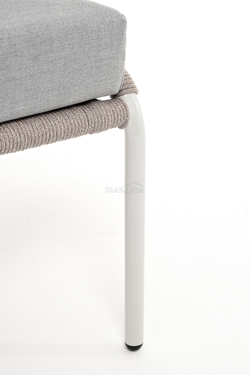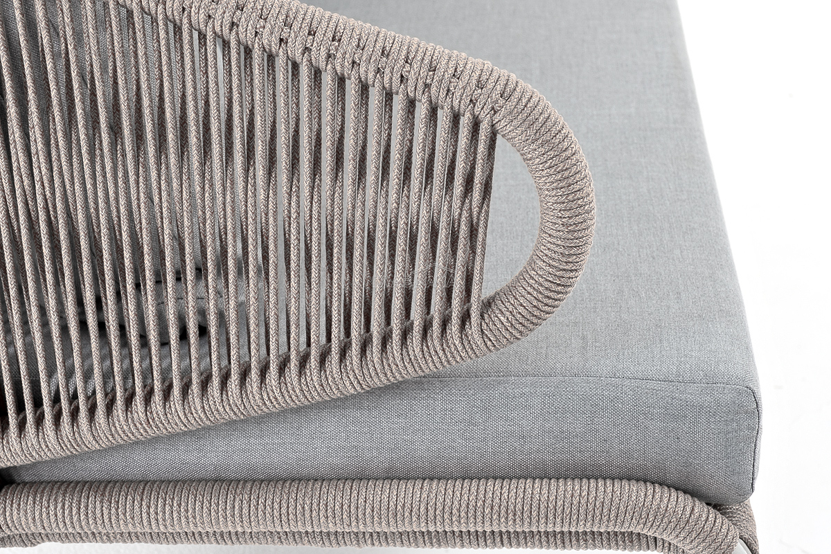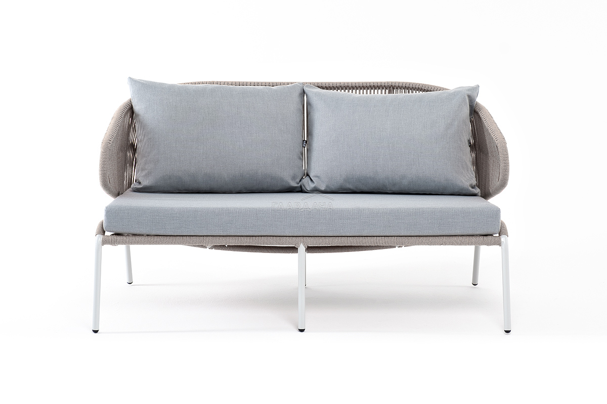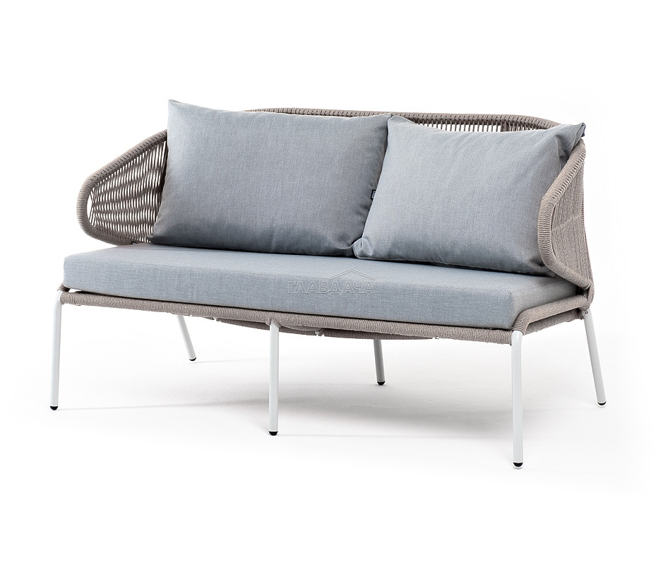 Диван имеет алюминиевый каркас, окрашенный порошковой краской в светло-серый (RAL7035) цвет. Боковины каркаса и спинка вручную оплетены роупом - эластичными синтетическими лентами, изготовленными из высокопрочных полиэфирных волокон. Цвет оплетки – серый меланж.
