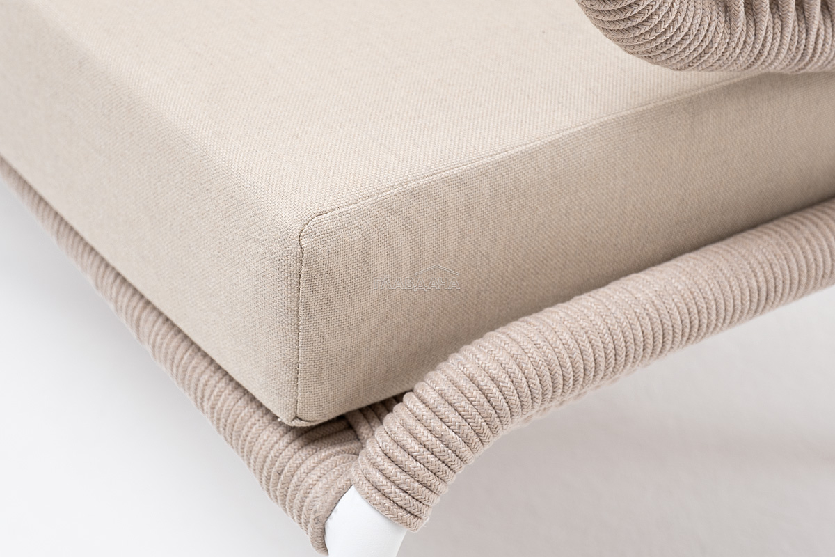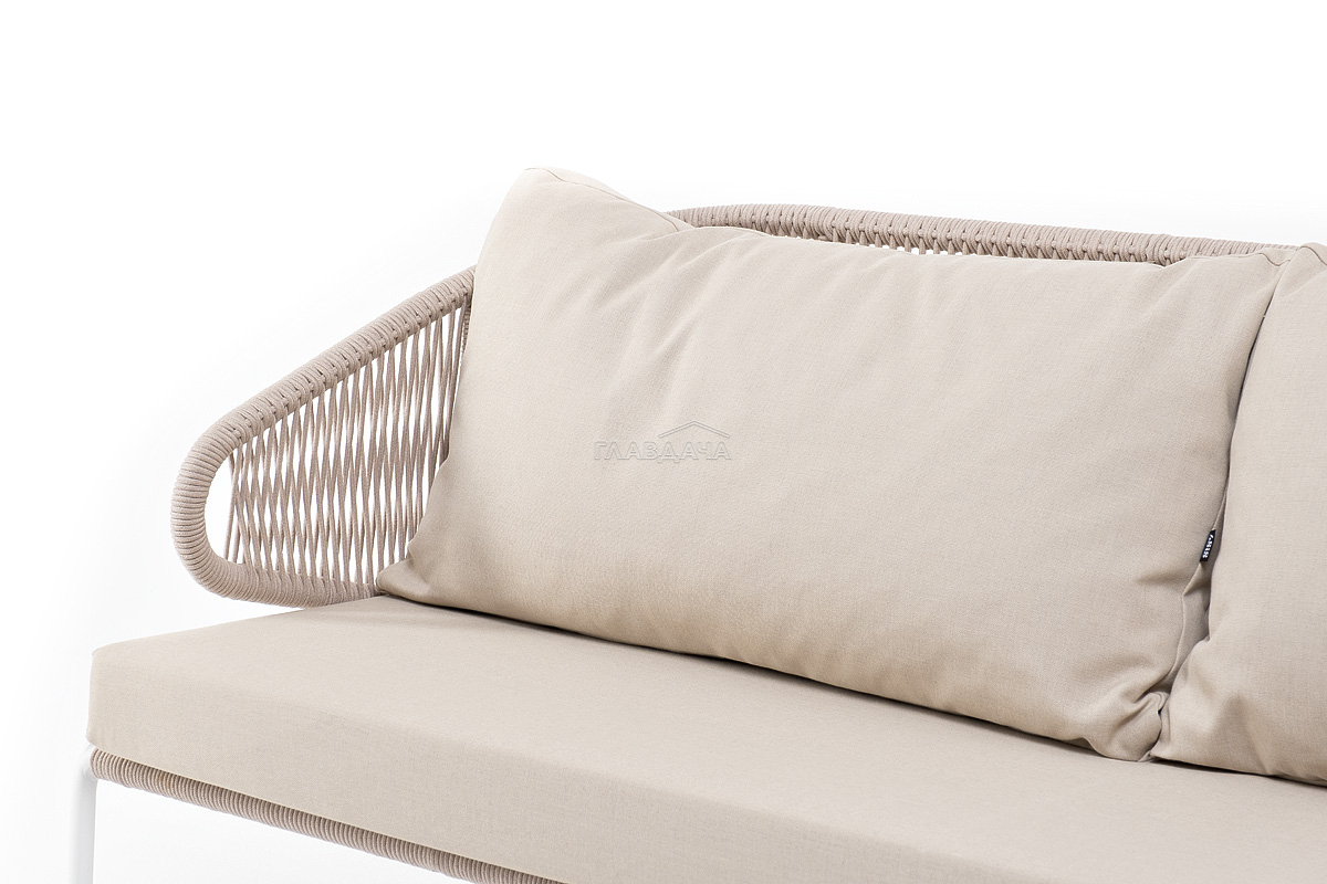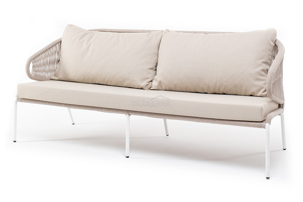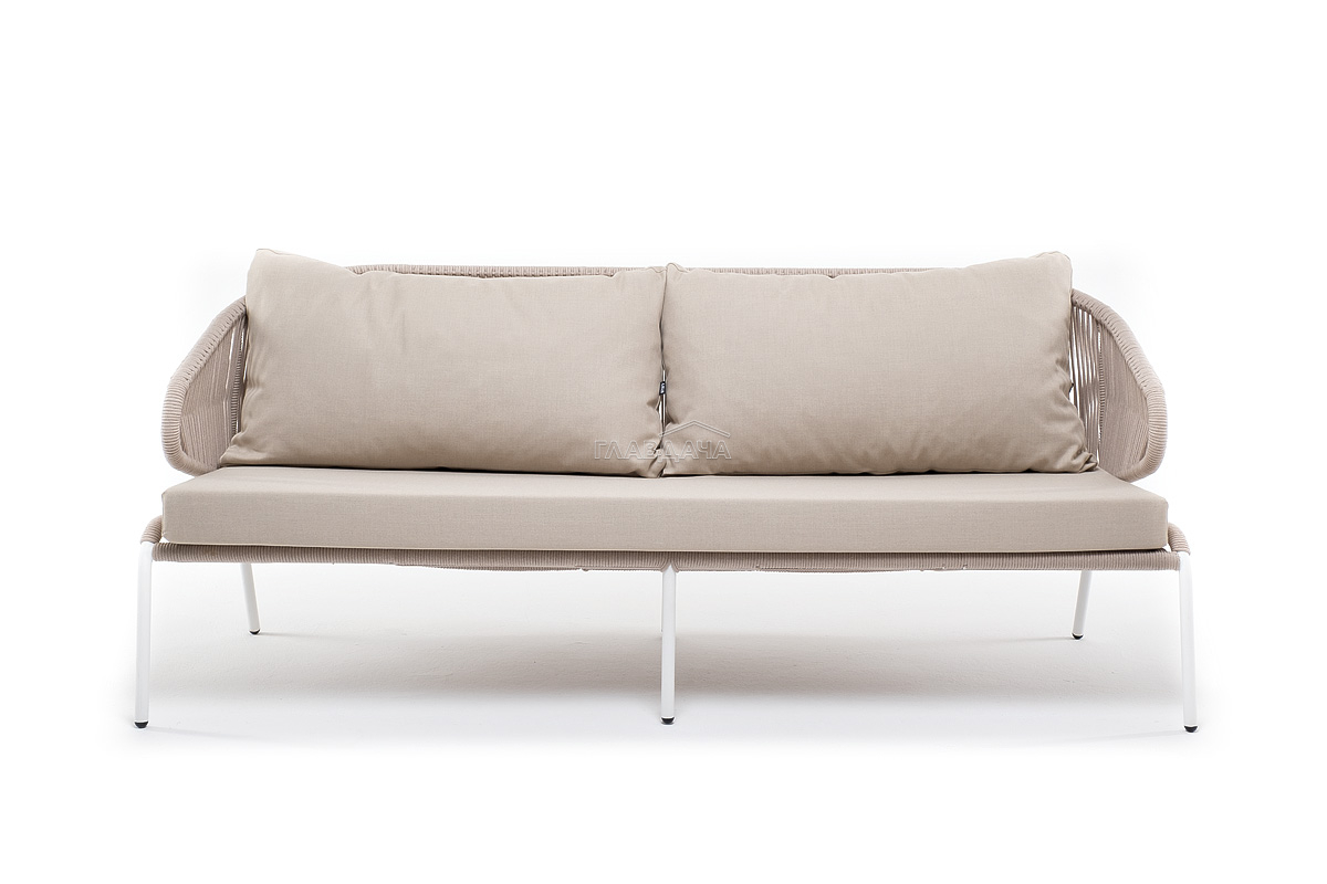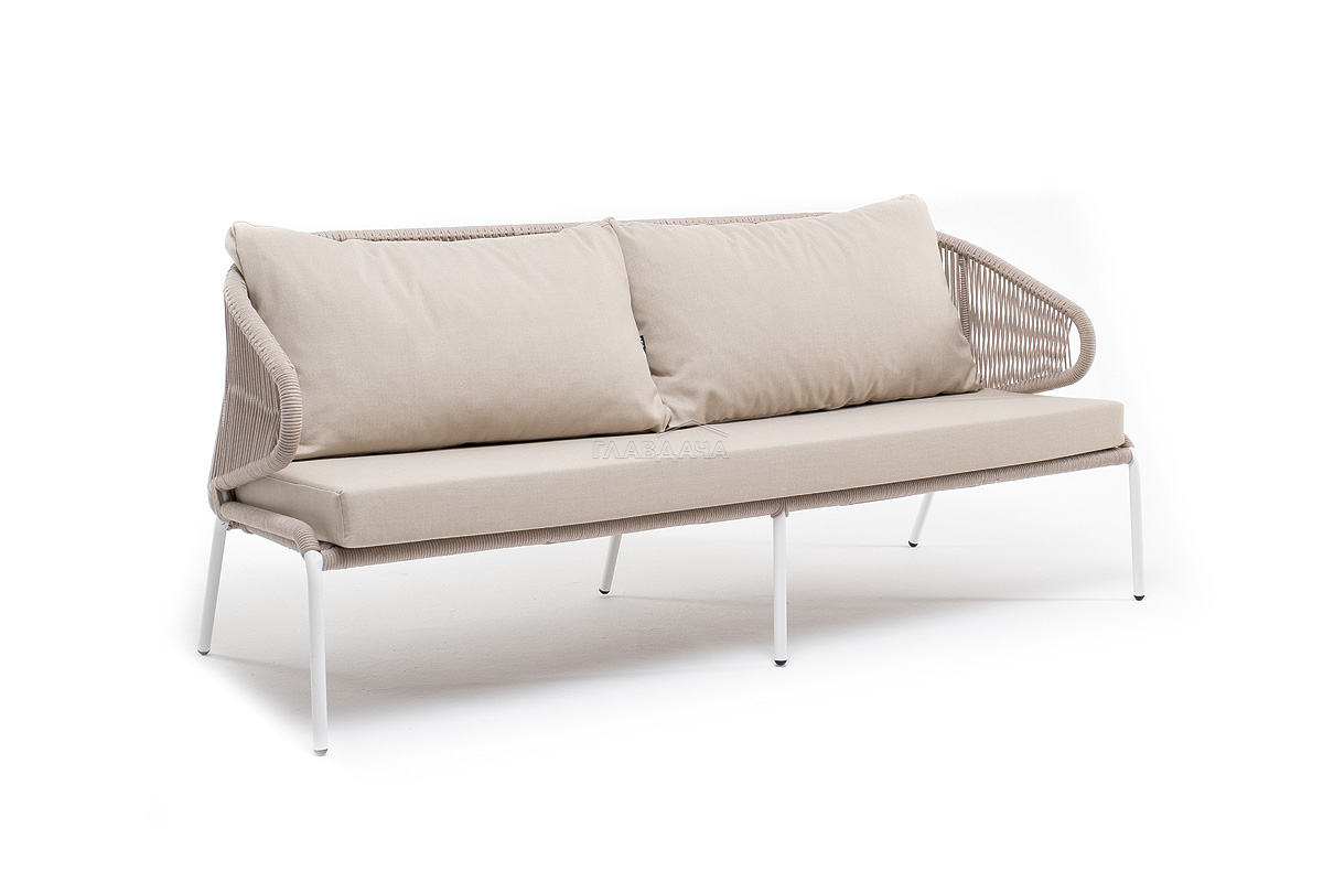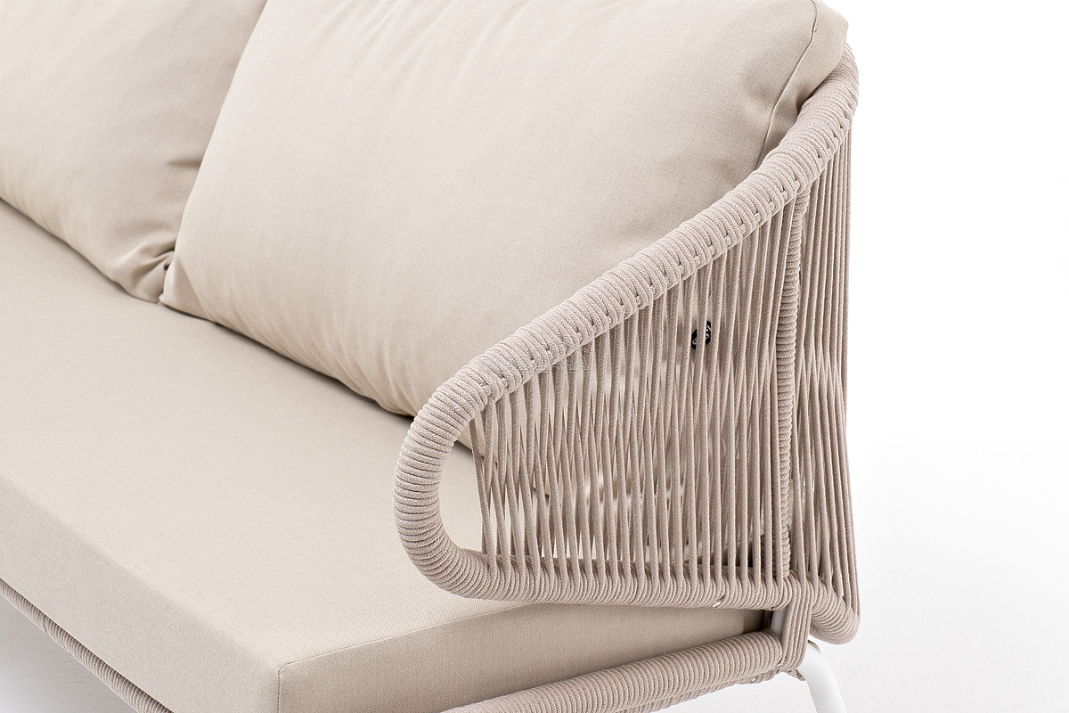 Диван имеет алюминиевый каркас, окрашенный порошковой краской в белый цвет. Боковины каркаса и спинка вручную оплетены роупом - эластичными синтетическими лентами, изготовленными из высокопрочных полиэфирных волокон. Цвет оплетки – бежевый.