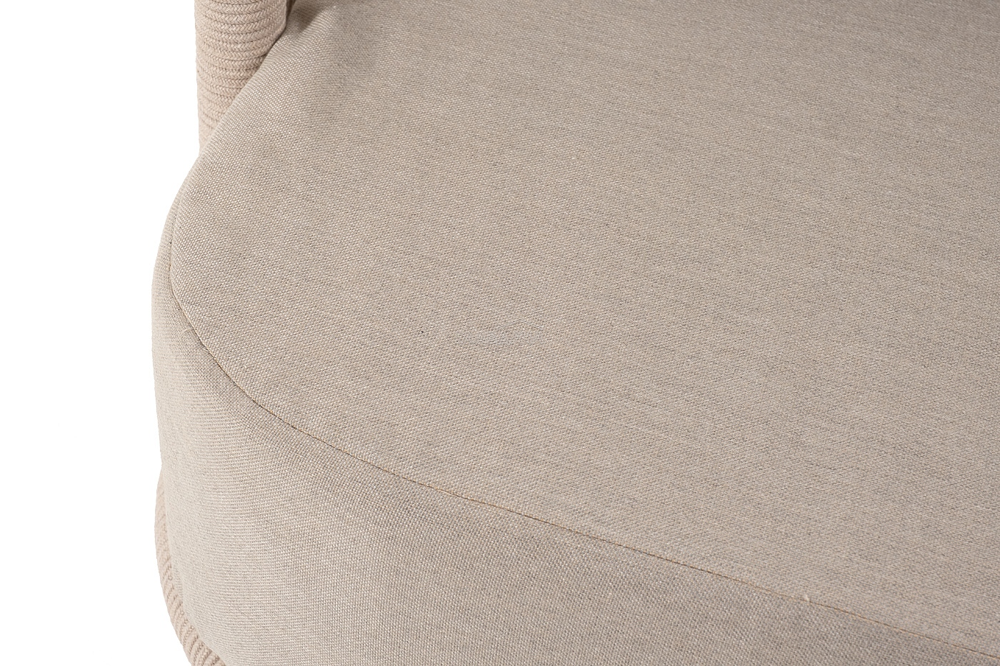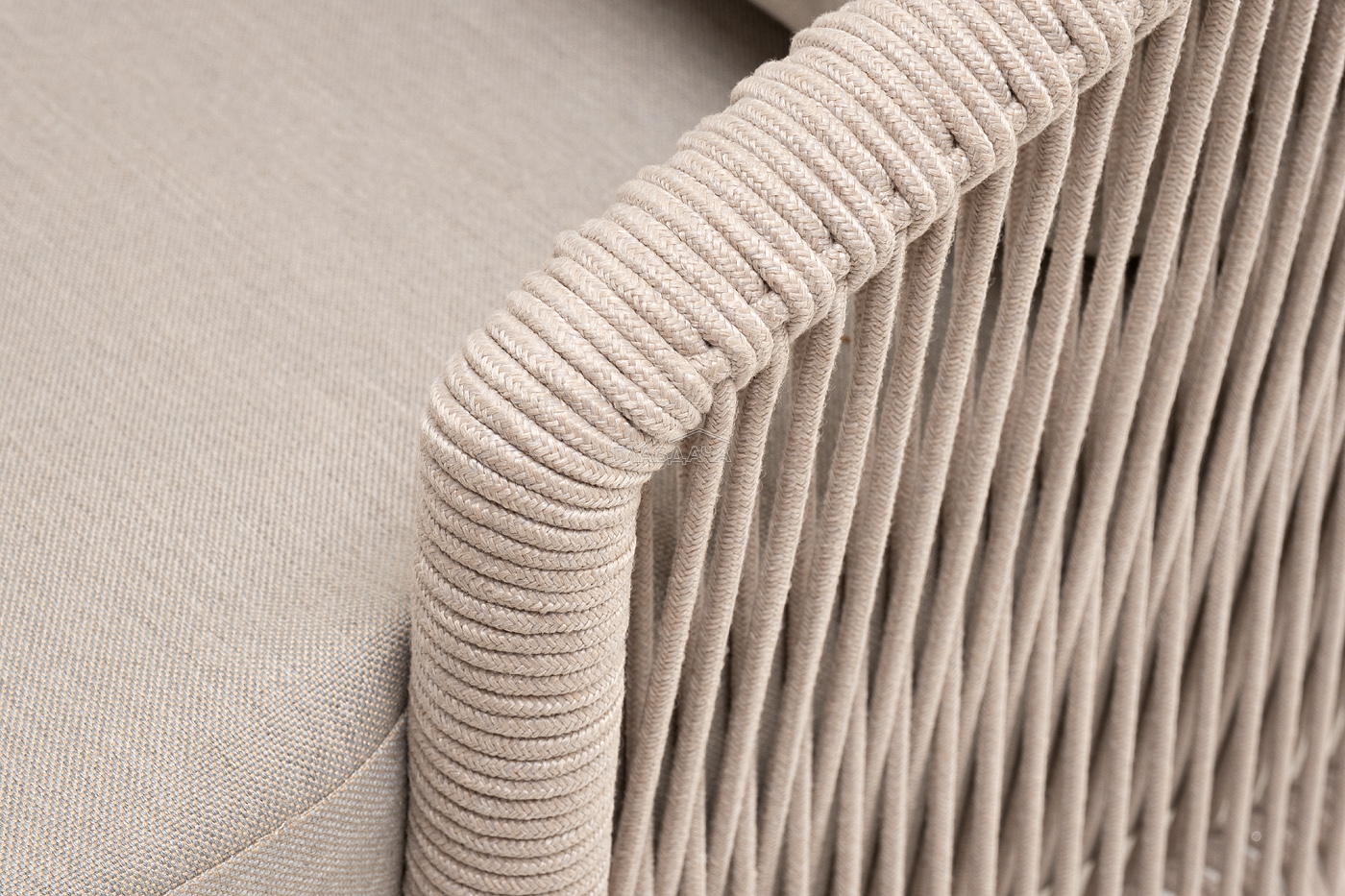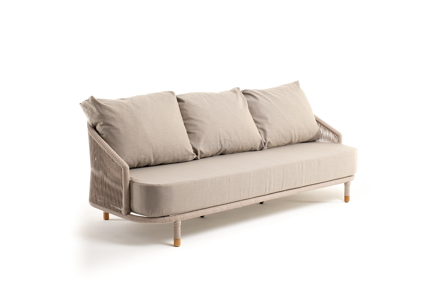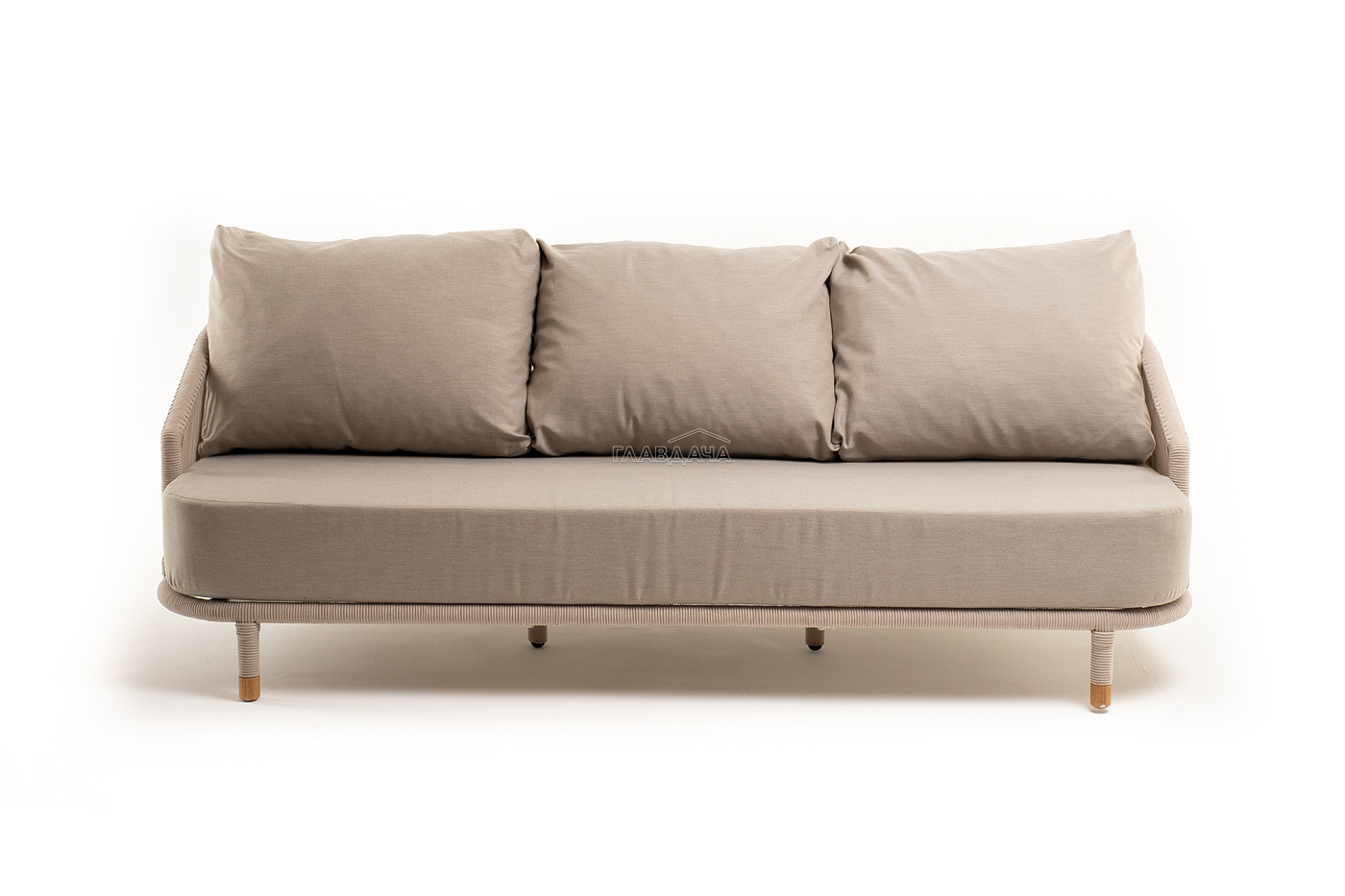 Диван имеет алюминиевый каркас, окрашенный порошковой краской в белый цвет. Боковины каркаса и спинка вручную оплетены роупом - эластичными синтетическими лентами, изготовленными из высокопрочных полиэфирных волокон. Цвет оплетки - бежевый. На ножках дивана идут дубовые наконечники (заглушки).