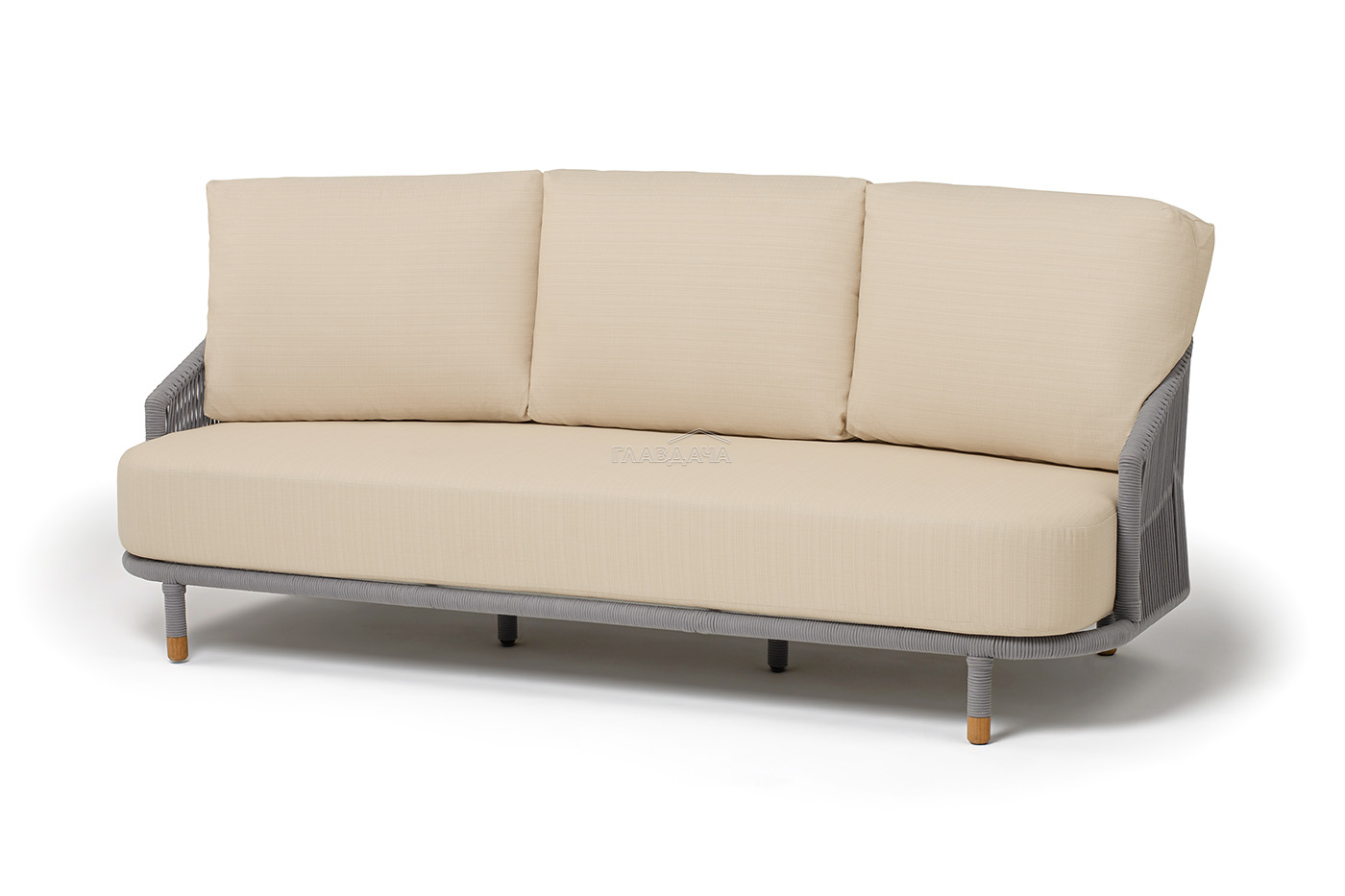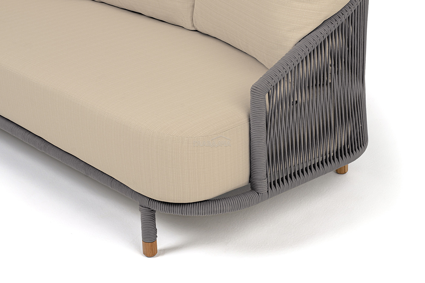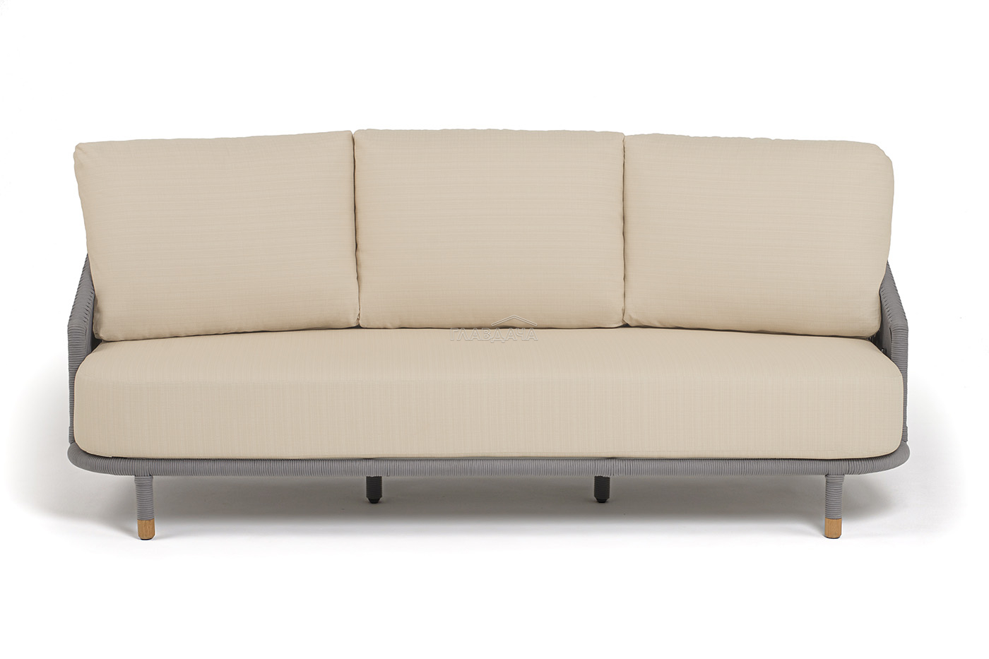 Диван имеет алюминиевый каркас, окрашенный порошковой краской в светло-серый (RAL7035) цвет. Боковины каркаса и спинка вручную оплетены роупом - эластичными синтетическими лентами, изготовленными из высокопрочных полиэфирных волокон. Цвет оплетки в тон каркасу - светло-серый. На ножках дивана идут дубовые наконечники (заглушки).
