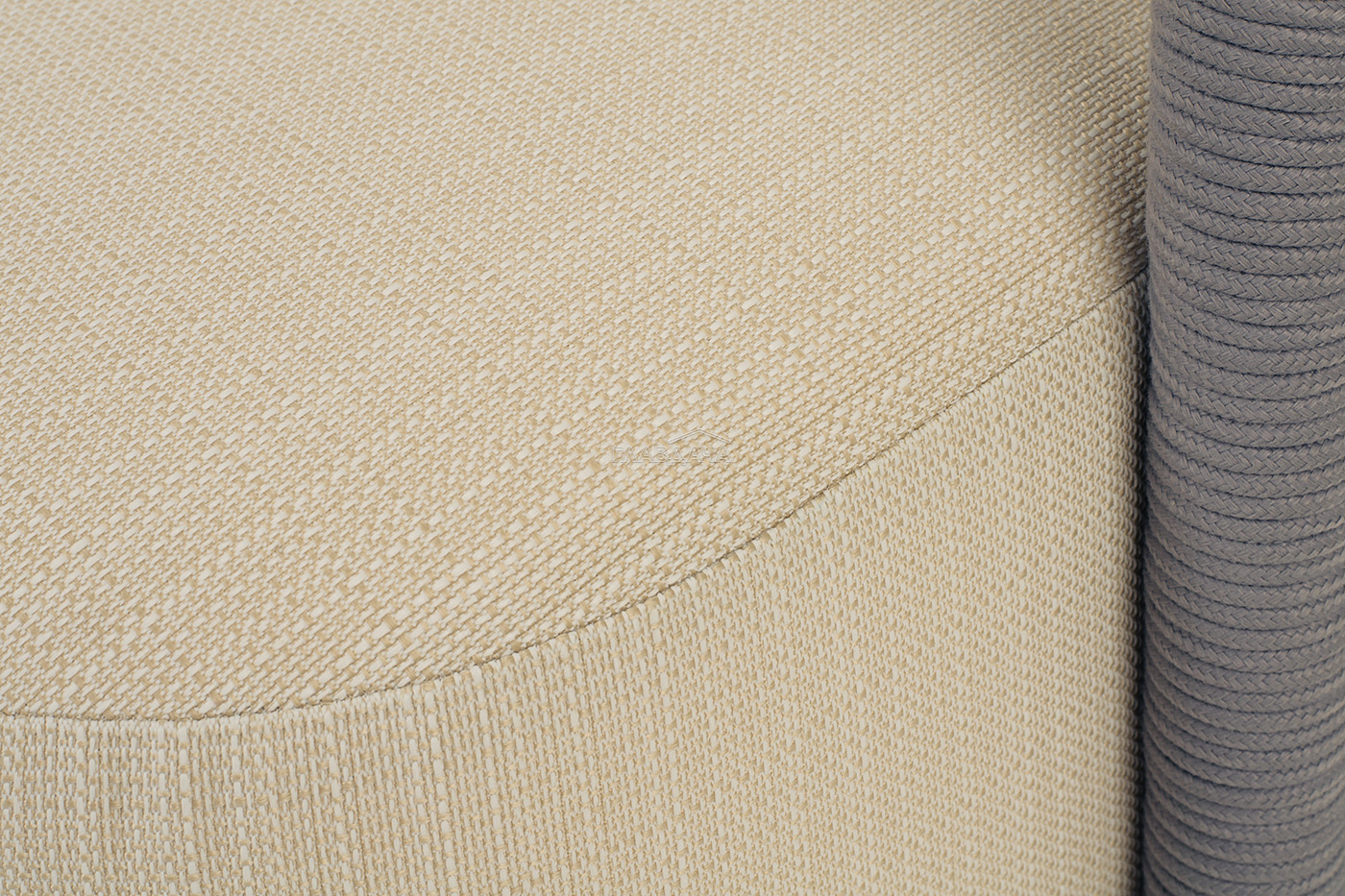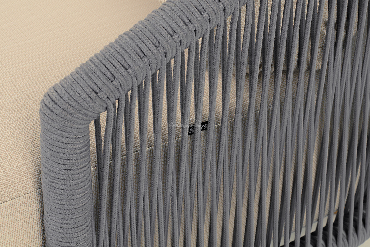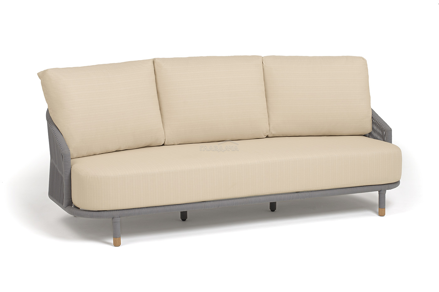Диван имеет алюминиевый каркас, окрашенный порошковой краской в светло-серый (RAL7035) цвет. Боковины каркаса и спинка вручную оплетены роупом - эластичными синтетическими лентами, изготовленными из высокопрочных полиэфирных волокон. Цвет оплетки в тон каркасу - светло-серый. На ножках дивана идут дубовые наконечники (заглушки).