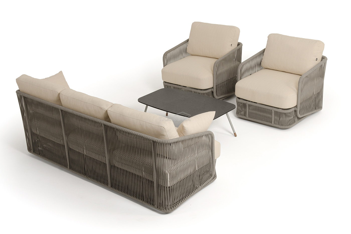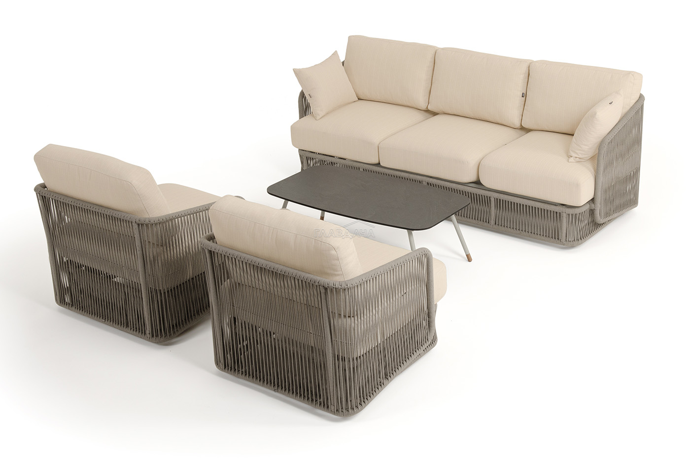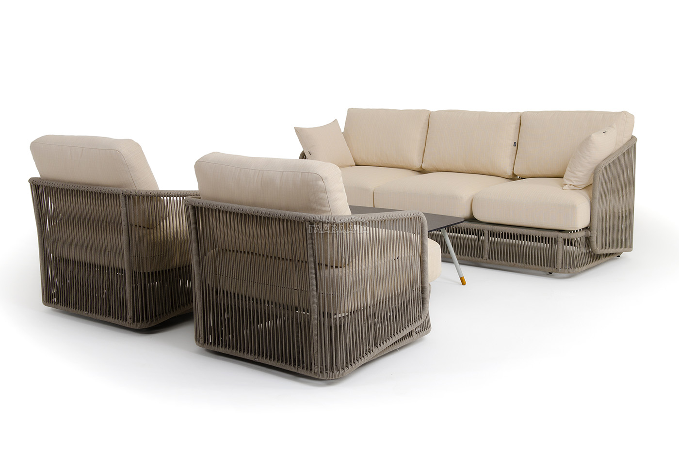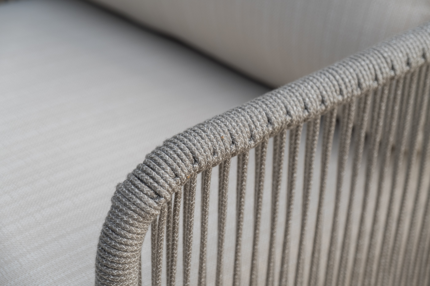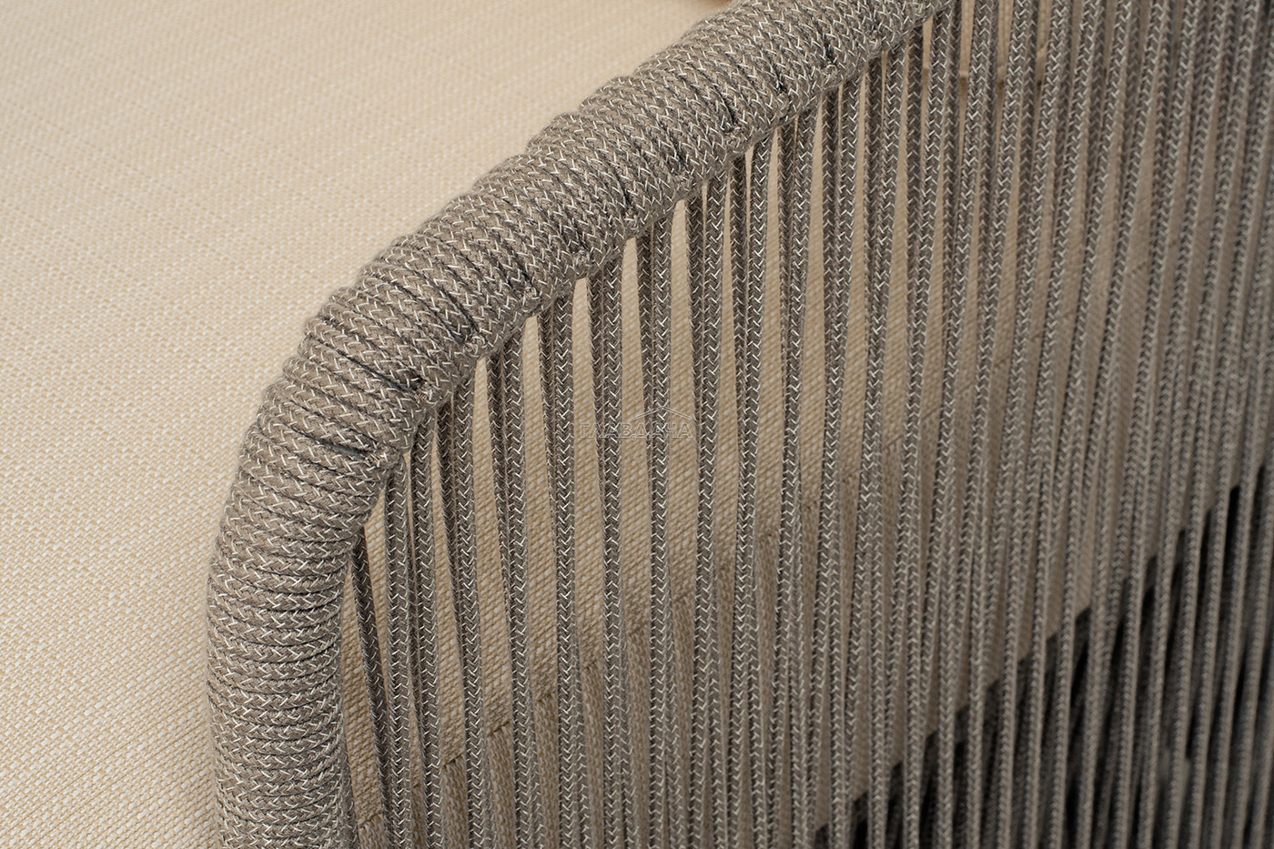 Каркас уличной мебели выполнен из износостойкого алюминия. Его дополняет бежевая ручная оплетка, изготовленная на основе эластичных синтетических лент из полиэфирных волокон высокой прочности (роупа).