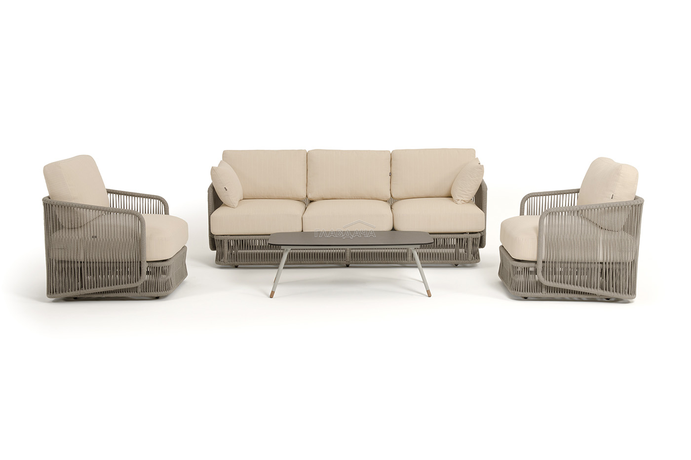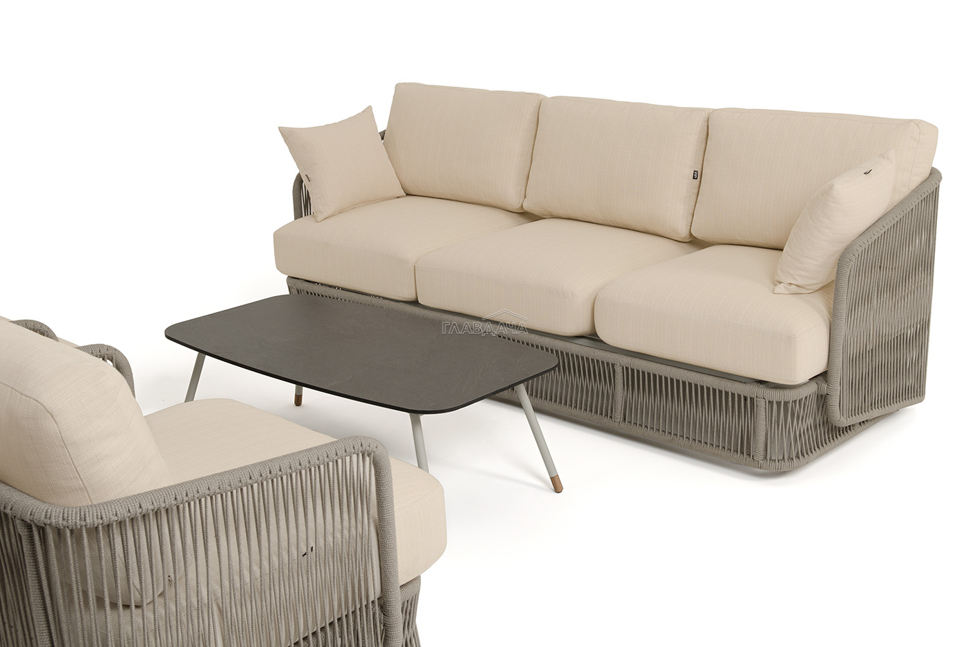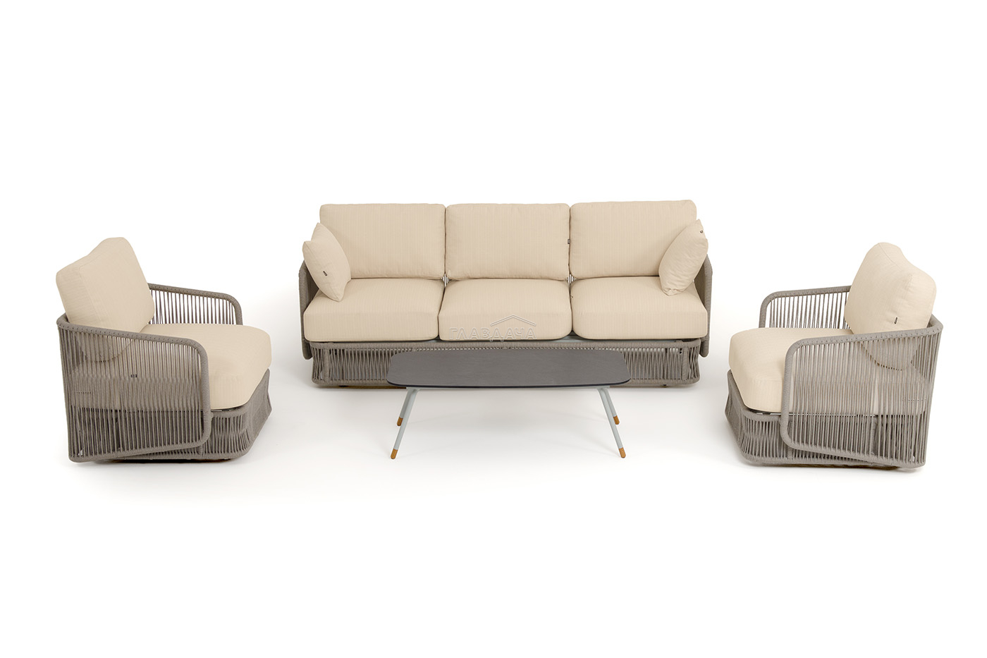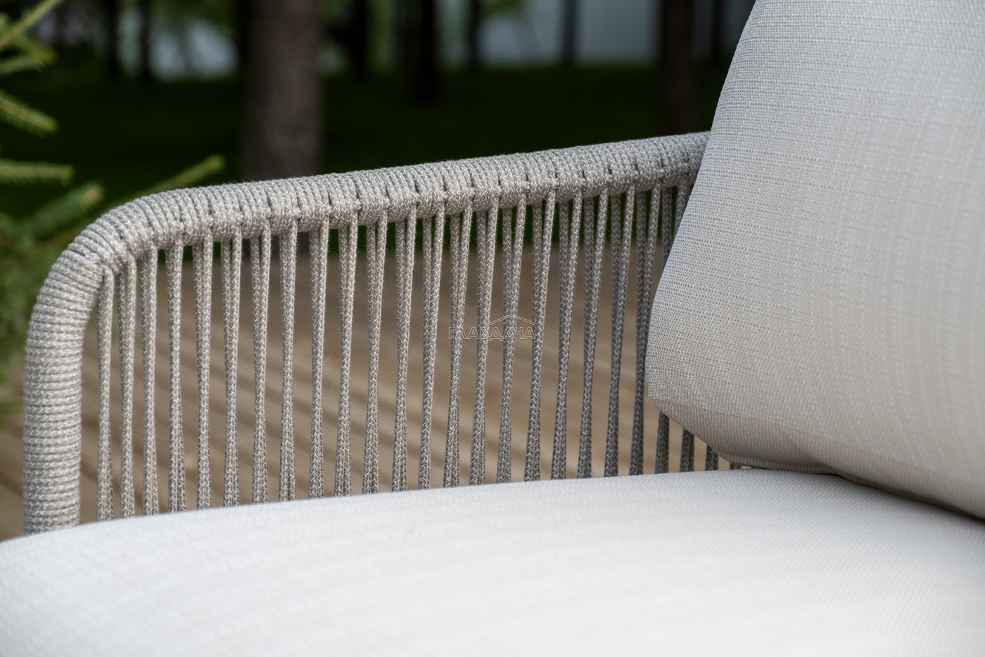 Каркас уличной мебели выполнен из износостойкого алюминия. Его дополняет бежевая ручная оплетка, изготовленная на основе эластичных синтетических лент из полиэфирных волокон высокой прочности (роупа).