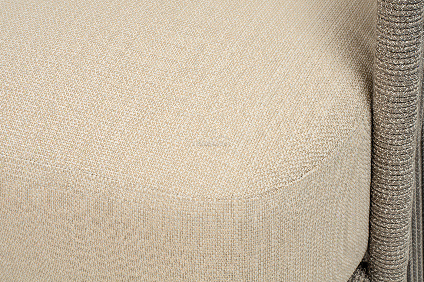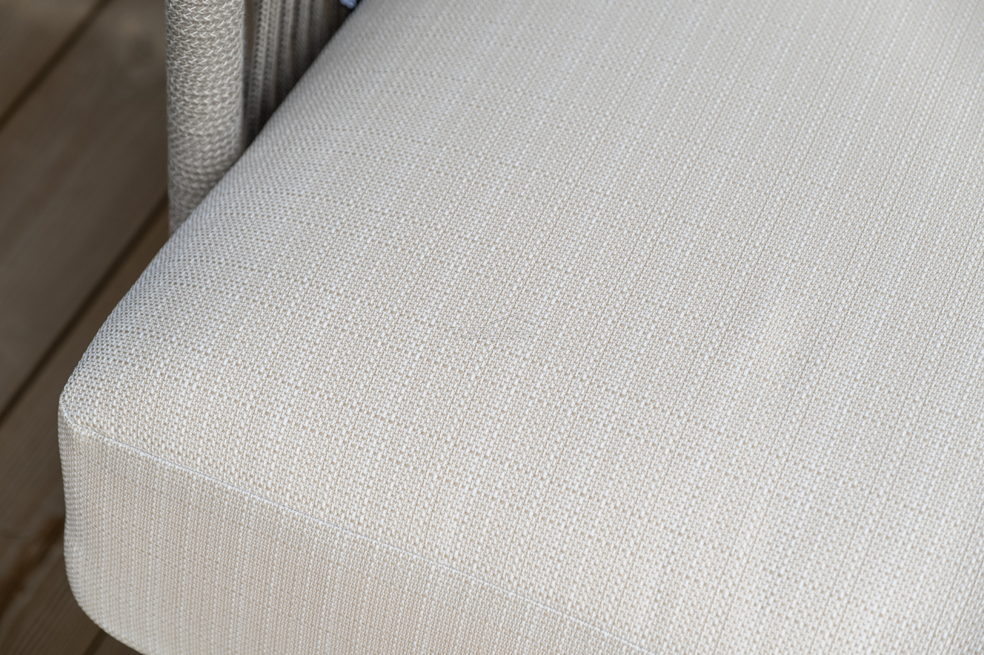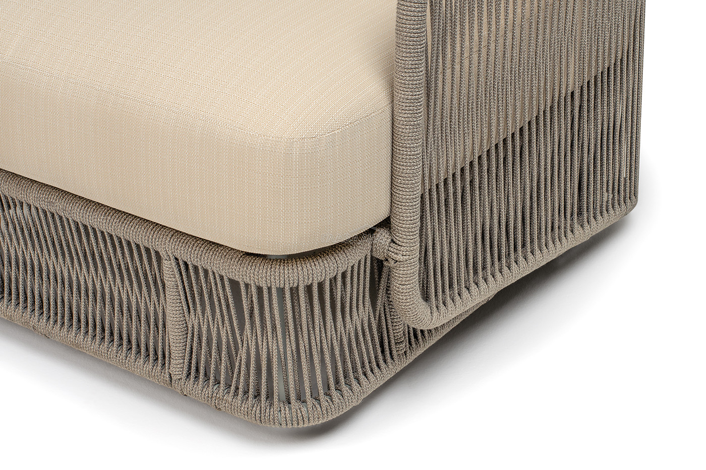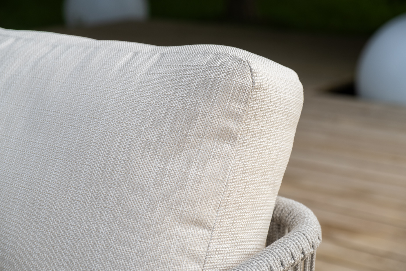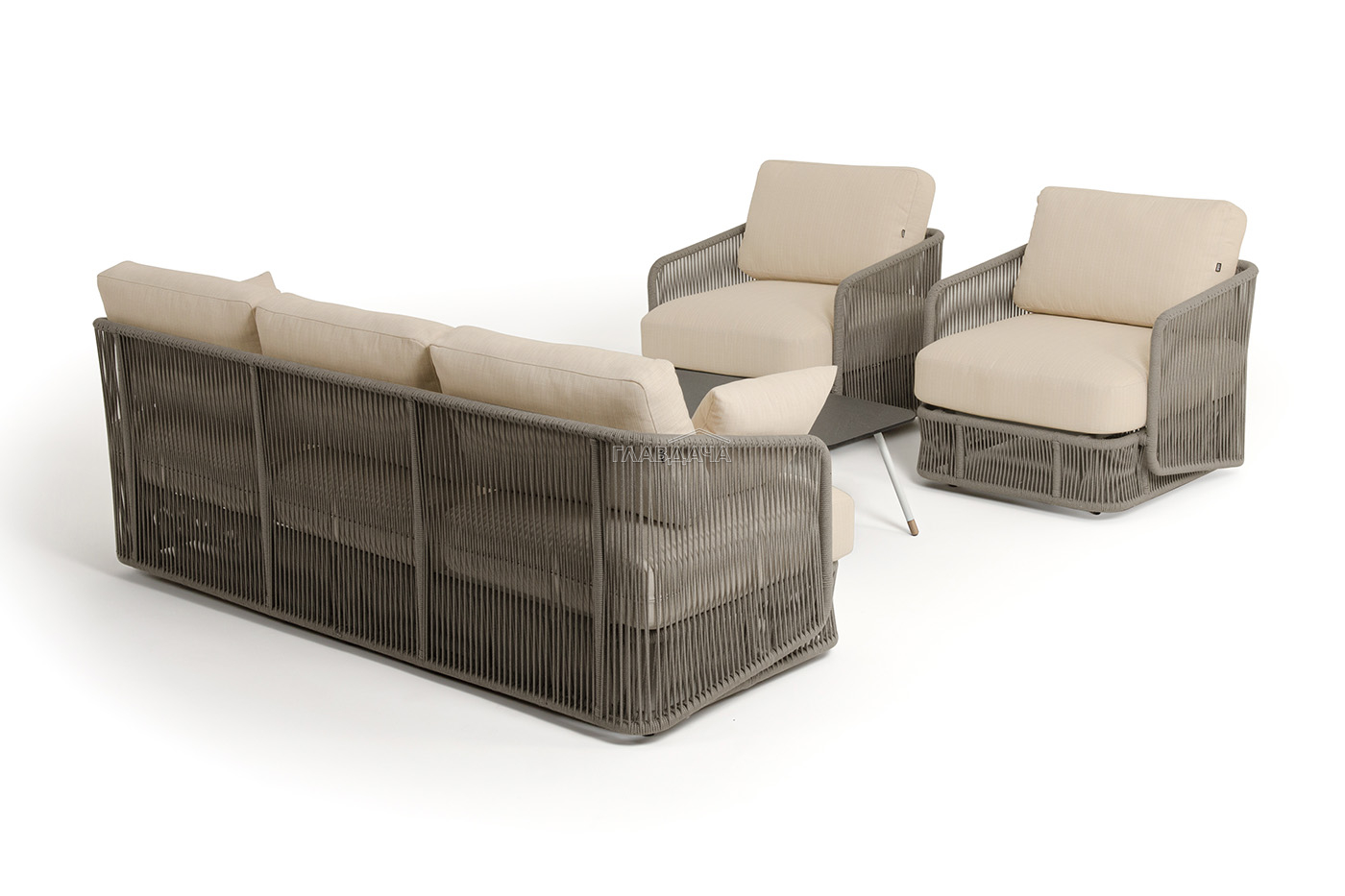 Каркас уличной мебели выполнен из износостойкого алюминия. Его дополняет бежевая ручная оплетка, изготовленная на основе эластичных синтетических лент из полиэфирных волокон высокой прочности (роупа).
