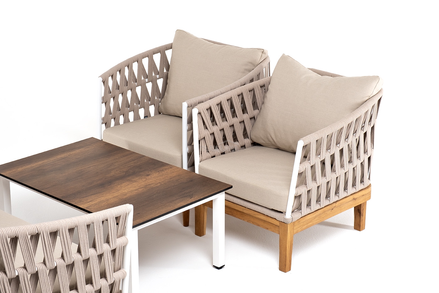 Каркас уличной мебели выполнен из дуба. Его дополняет бежевая оплетка, изготовленная на основе эластичных синтетических лент из полиэфирных волокон высокой прочности.