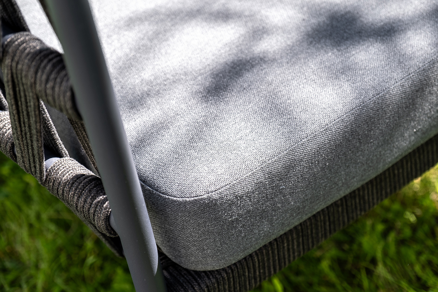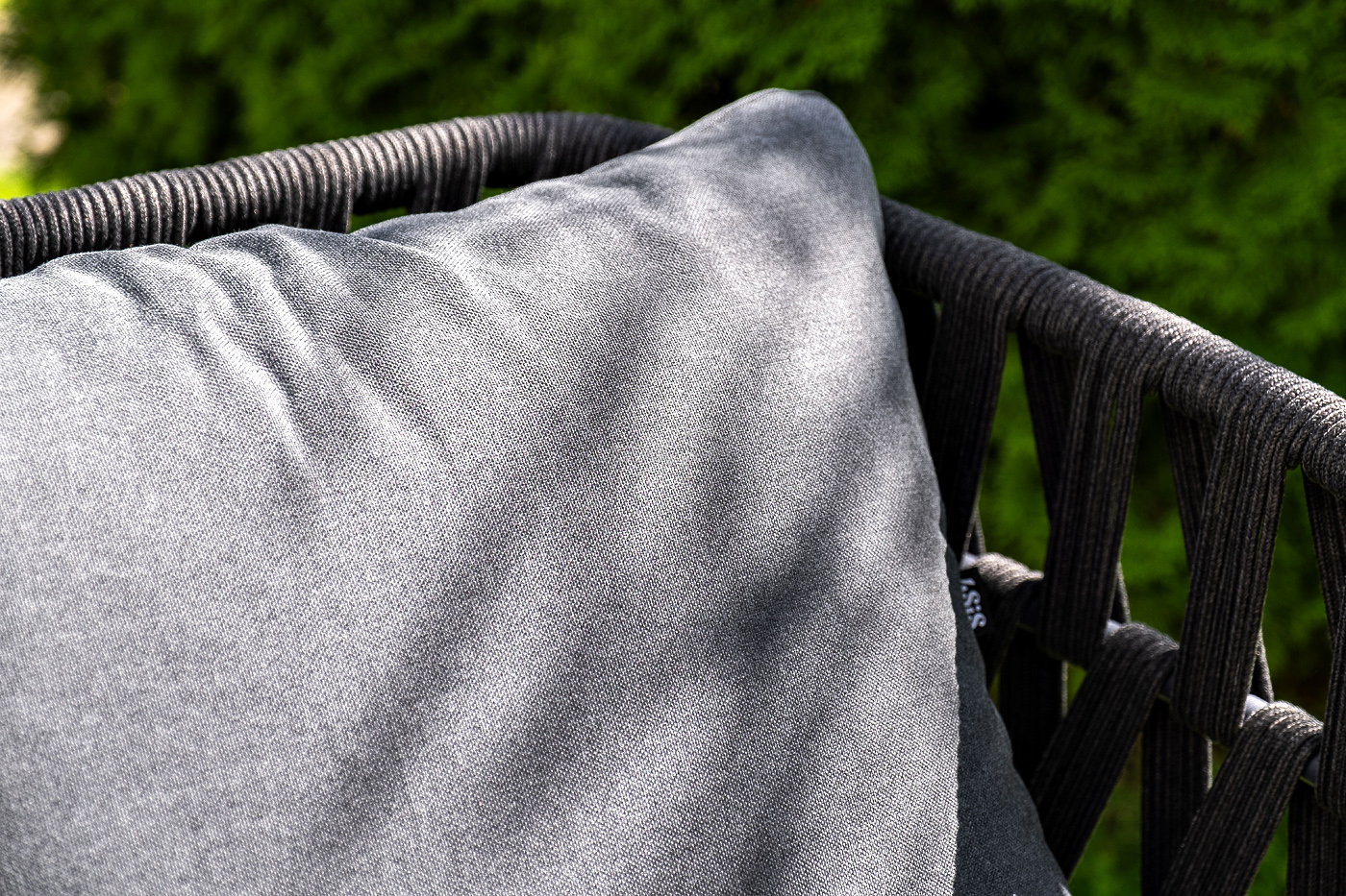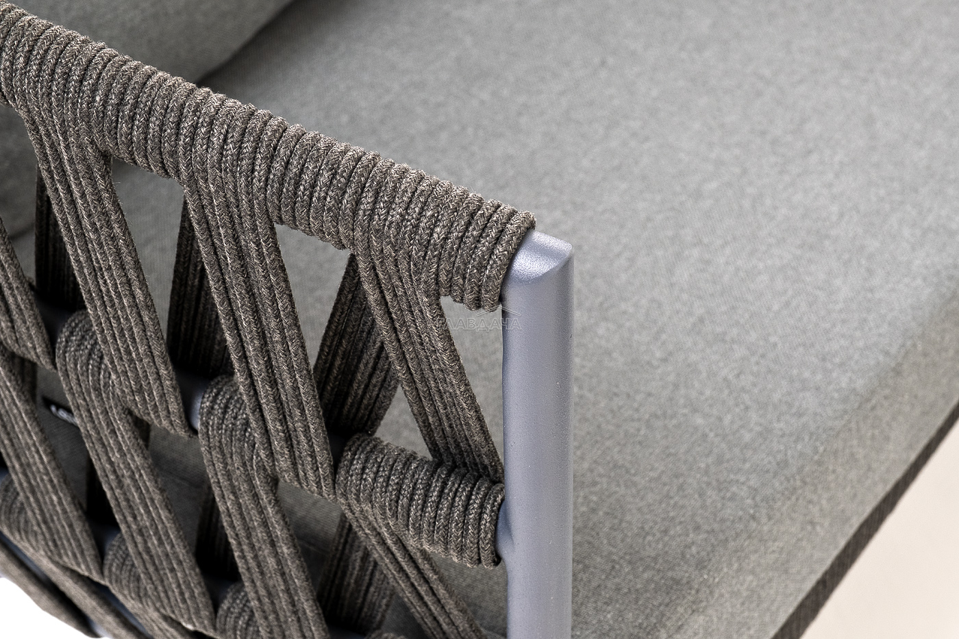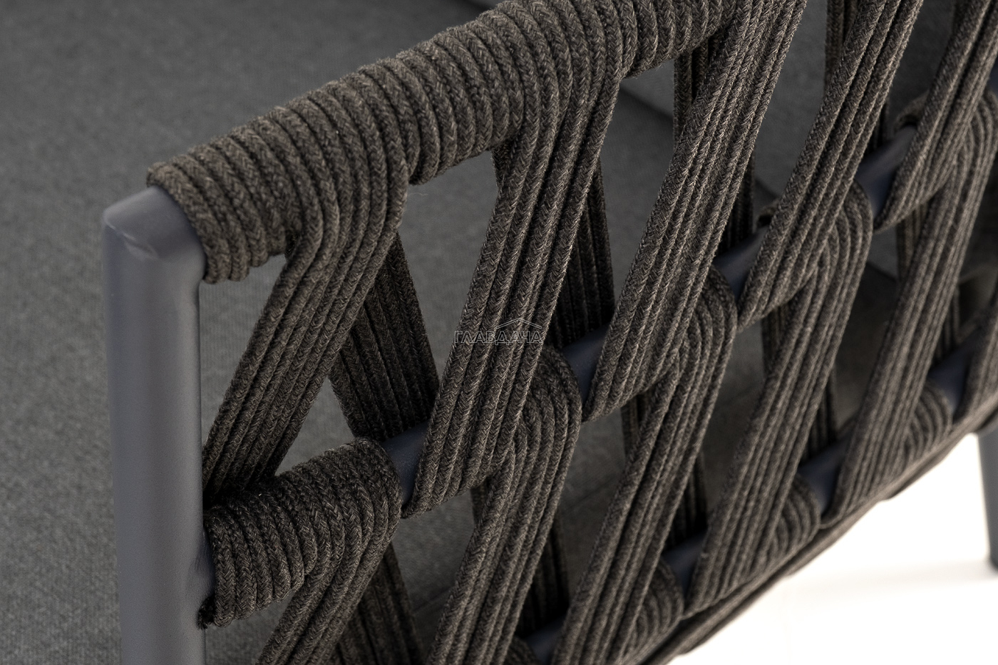 Каркас уличной мебели выполнен из износостойкого алюминия. Его дополняет темно-серая ручная оплетка, изготовленная на основе эластичных синтетических лент из полиэфирных волокон высокой прочности (роупа).