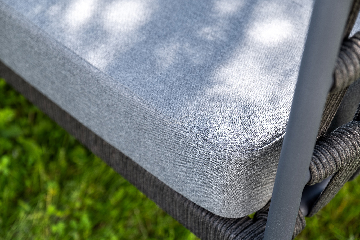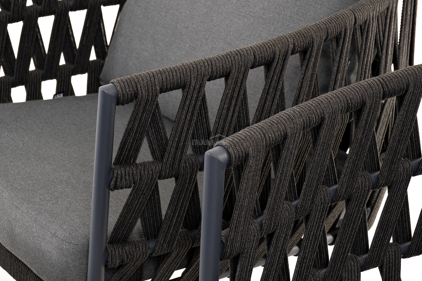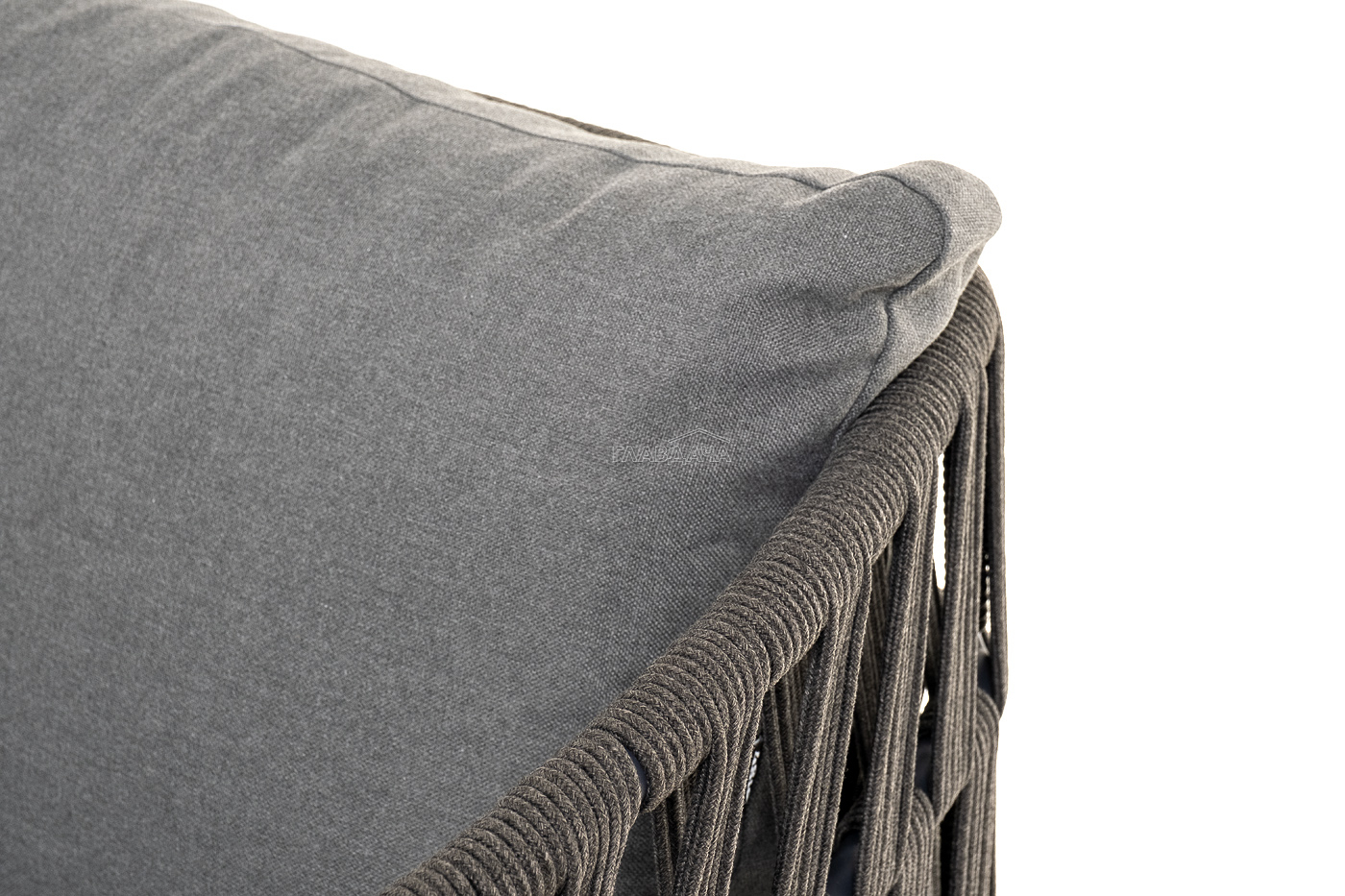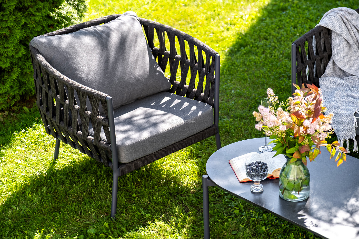 Каркас уличной мебели выполнен из износостойкого алюминия. Его дополняет темно-серая ручная оплетка, изготовленная на основе эластичных синтетических лент из полиэфирных волокон высокой прочности (роупа).