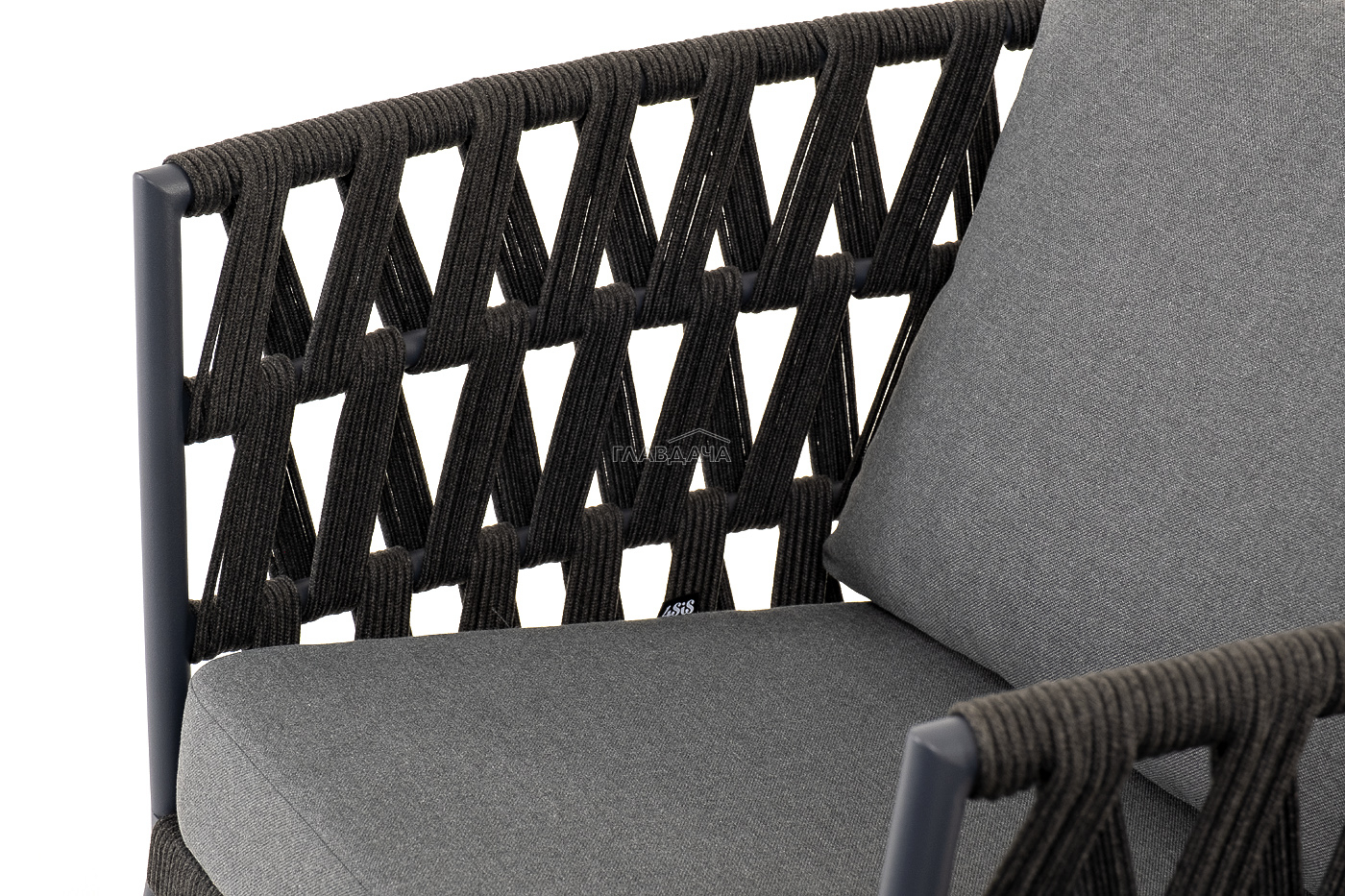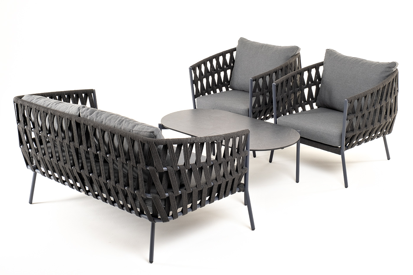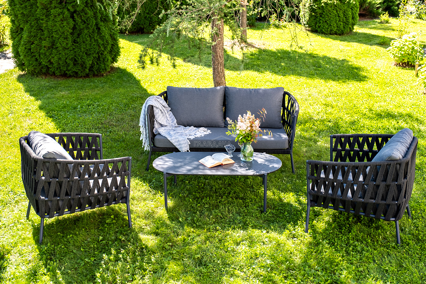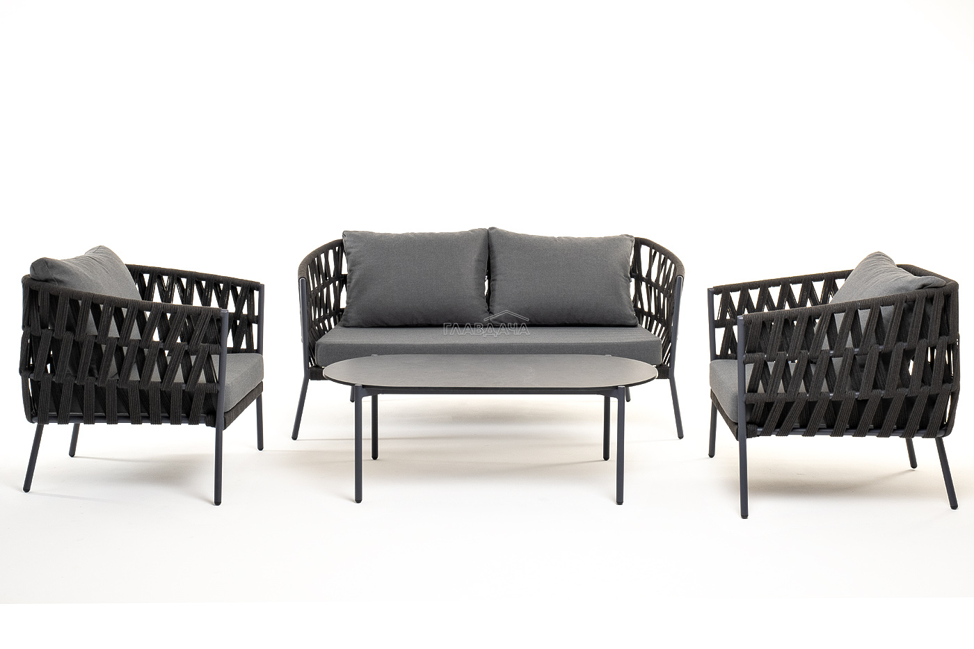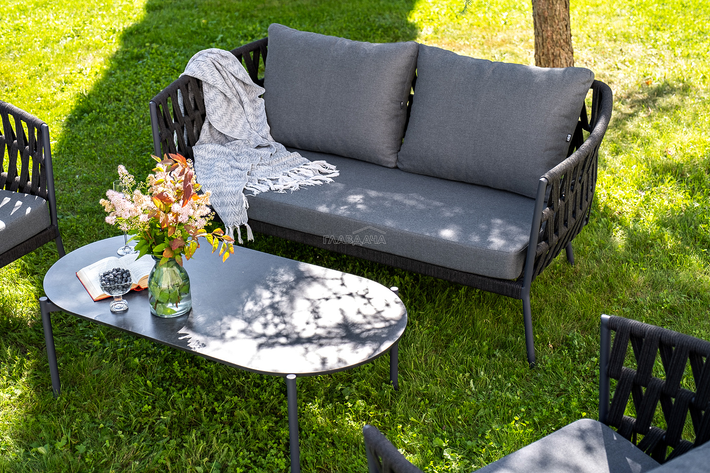 Каркас уличной мебели выполнен из износостойкого алюминия. Его дополняет темно-серая ручная оплетка, изготовленная на основе эластичных синтетических лент из полиэфирных волокон высокой прочности (роупа).