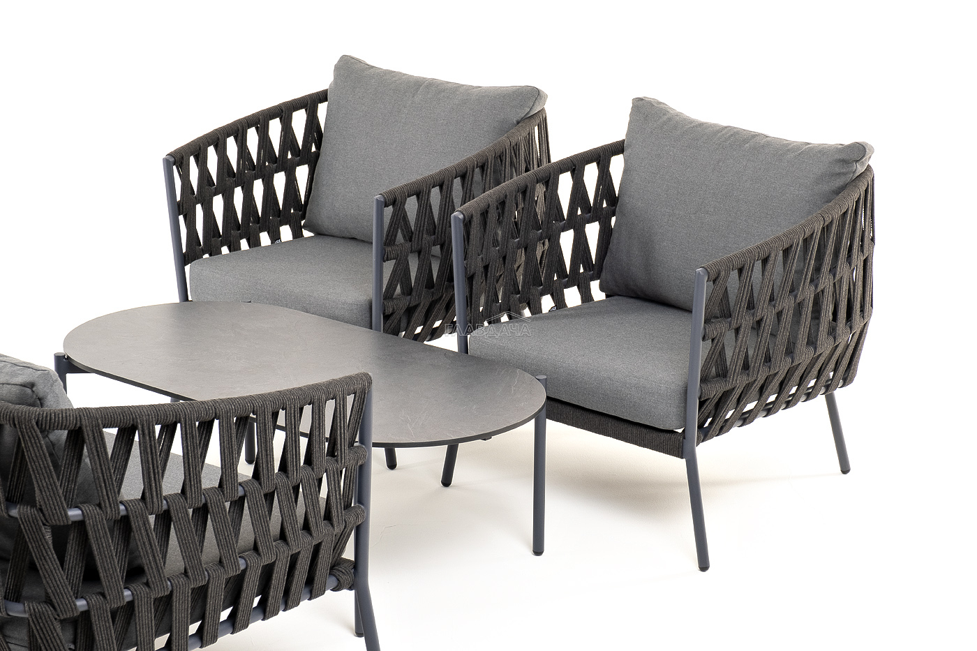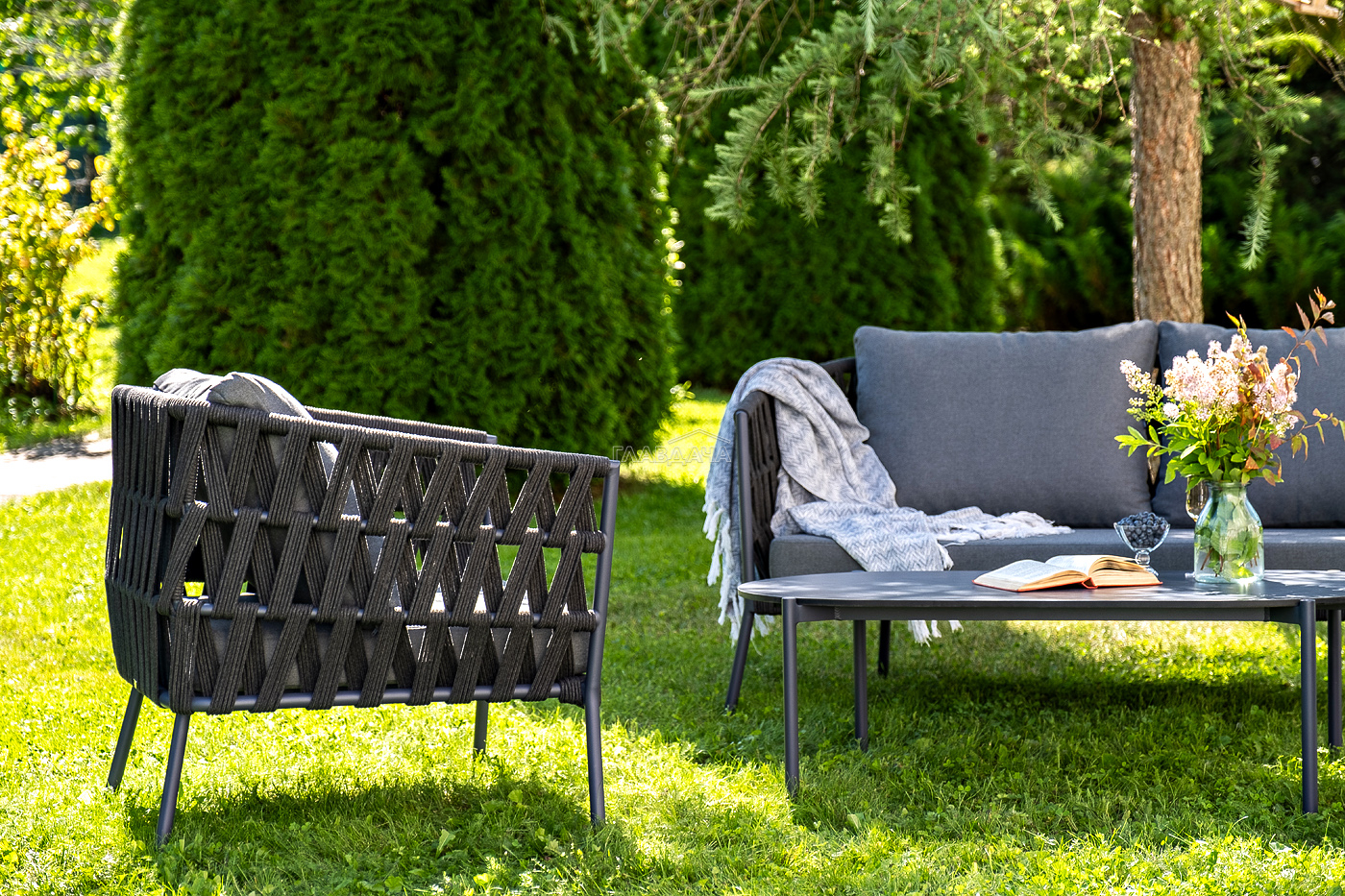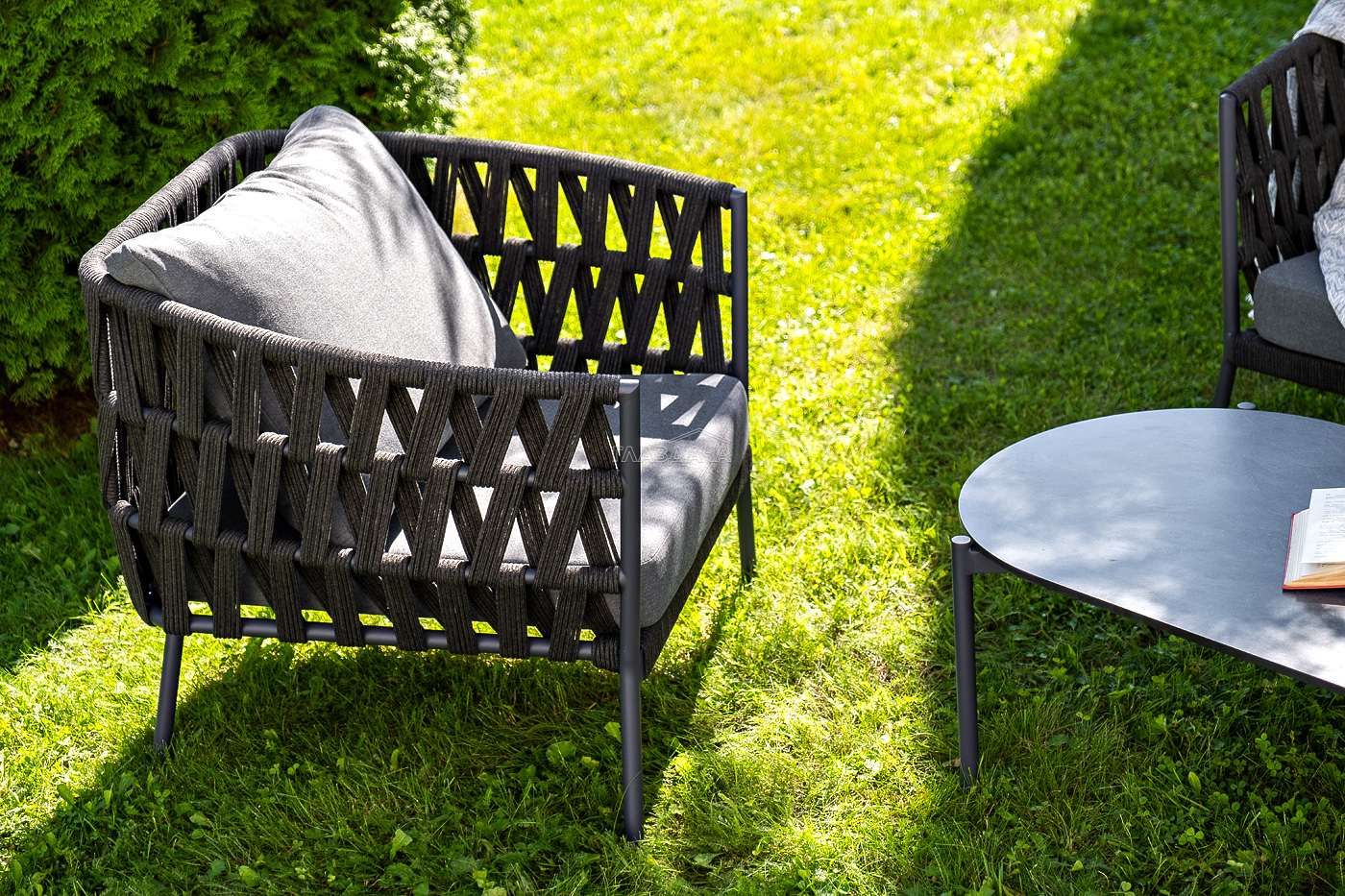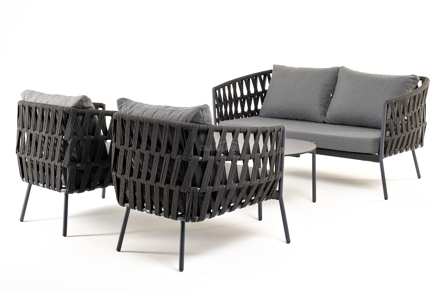 Каркас уличной мебели выполнен из износостойкого алюминия. Его дополняет темно-серая ручная оплетка, изготовленная на основе эластичных синтетических лент из полиэфирных волокон высокой прочности (роупа).