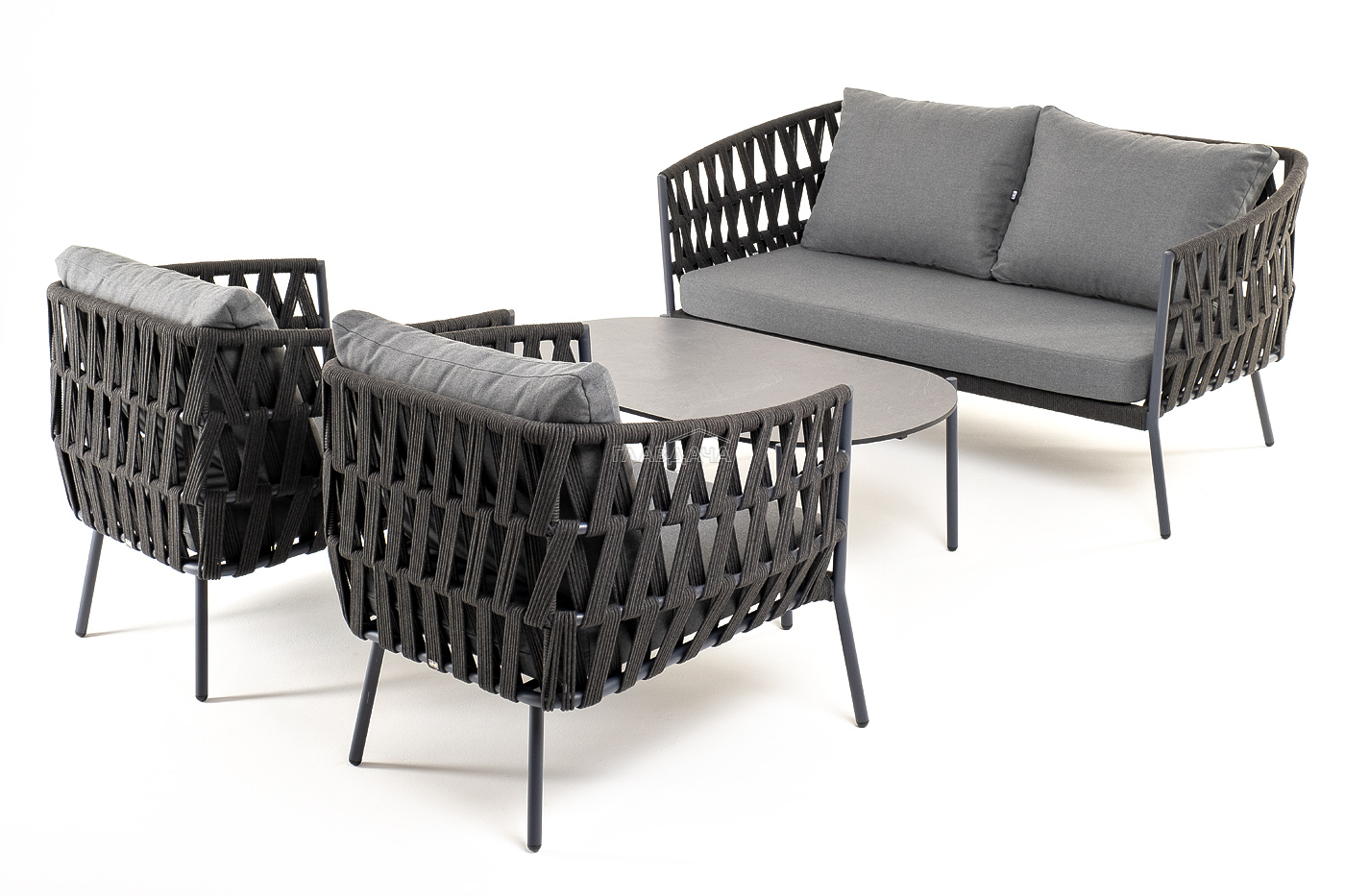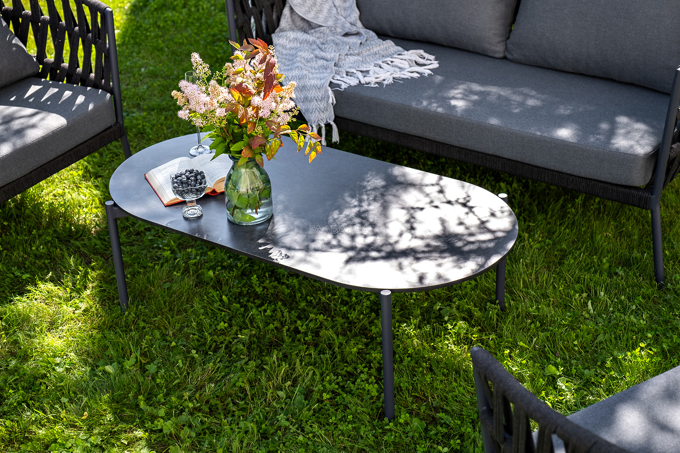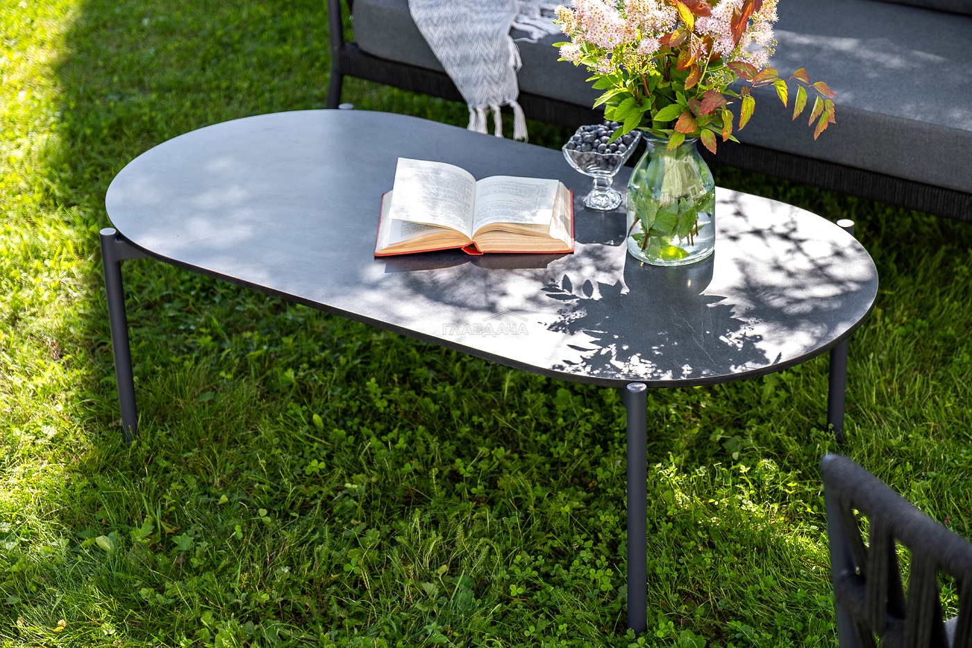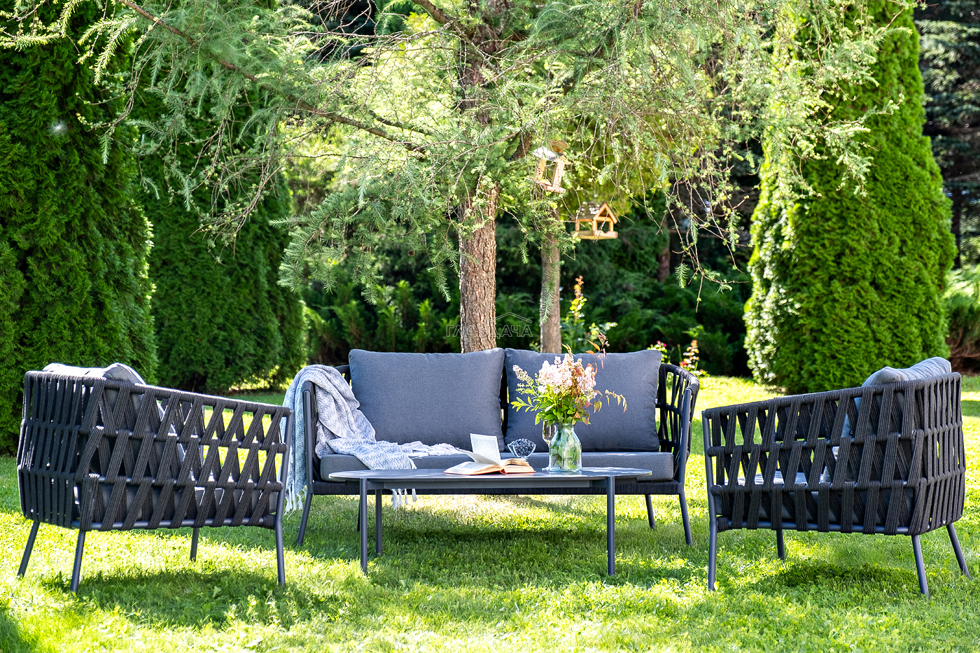 Каркас уличной мебели выполнен из износостойкого алюминия. Его дополняет темно-серая ручная оплетка, изготовленная на основе эластичных синтетических лент из полиэфирных волокон высокой прочности (роупа).