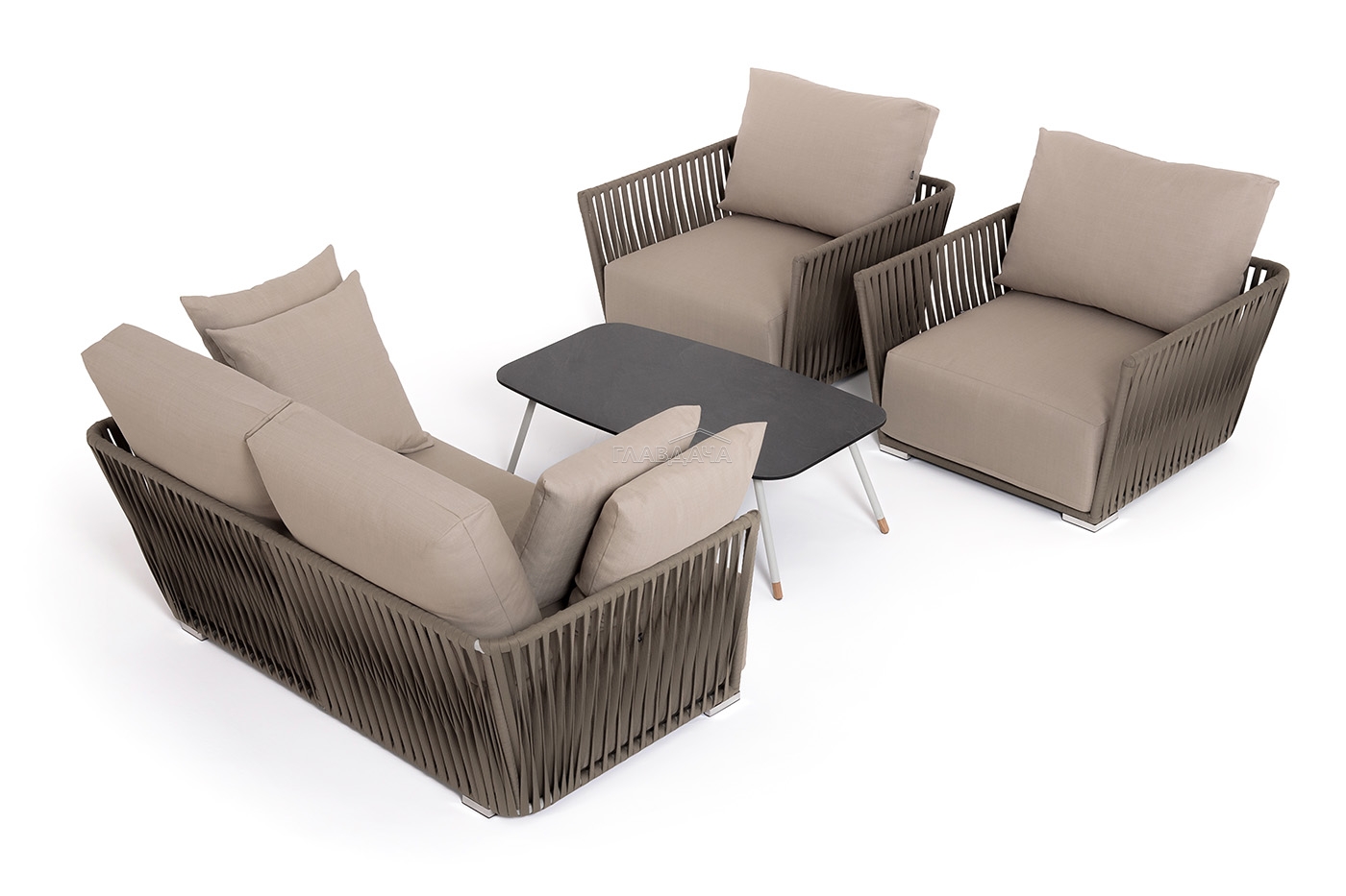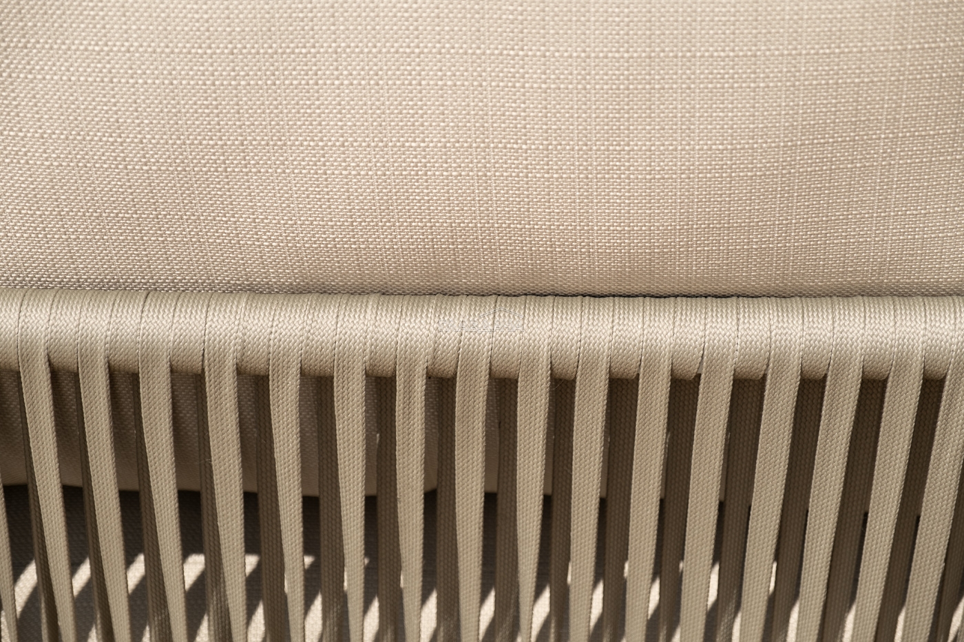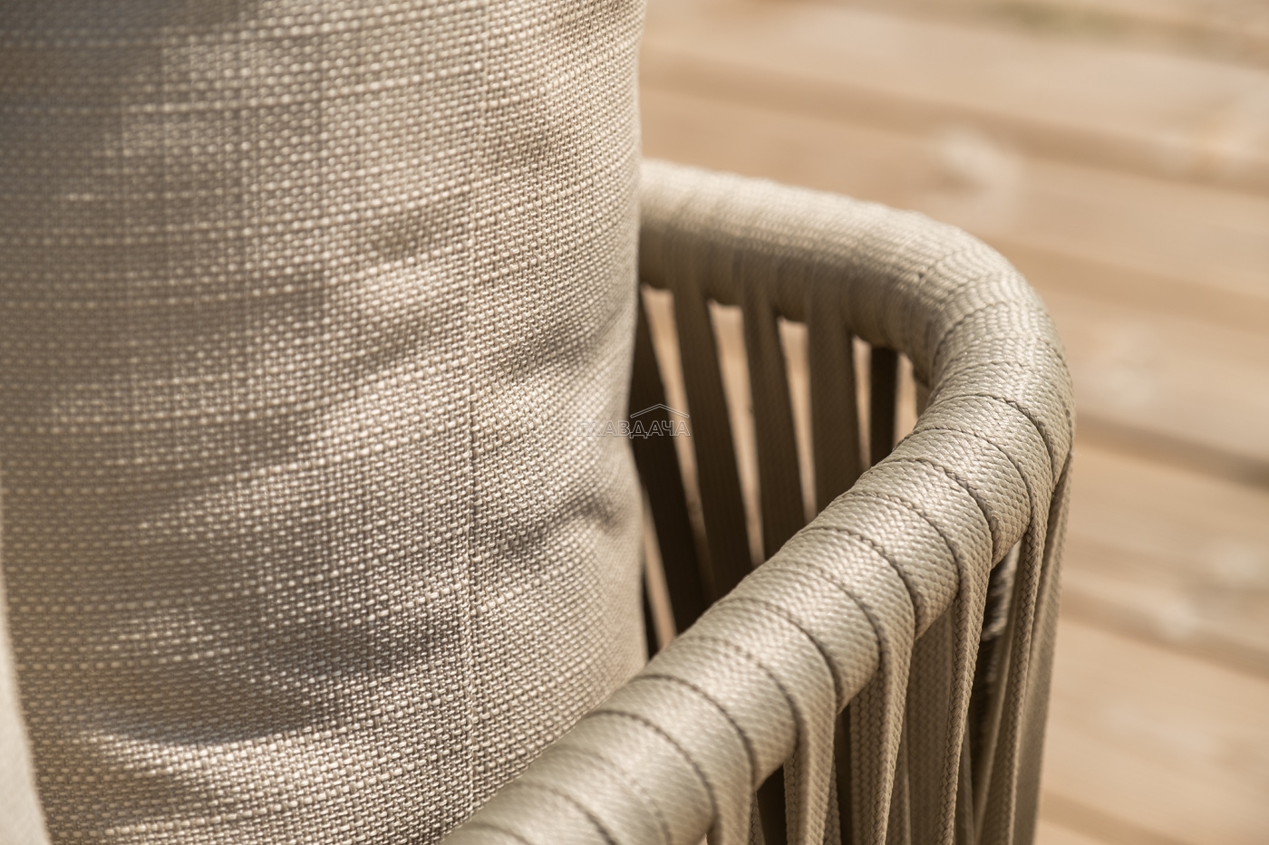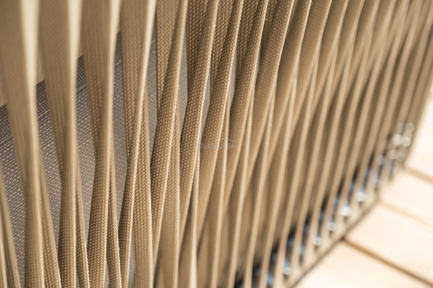 Каркас уличной мебели выполнен из износостойкого алюминия. Его дополняет серо-коричневая ручная оплетка, изготовленная на основе эластичных синтетических лент из полиэфирных волокон высокой прочности (роупа).