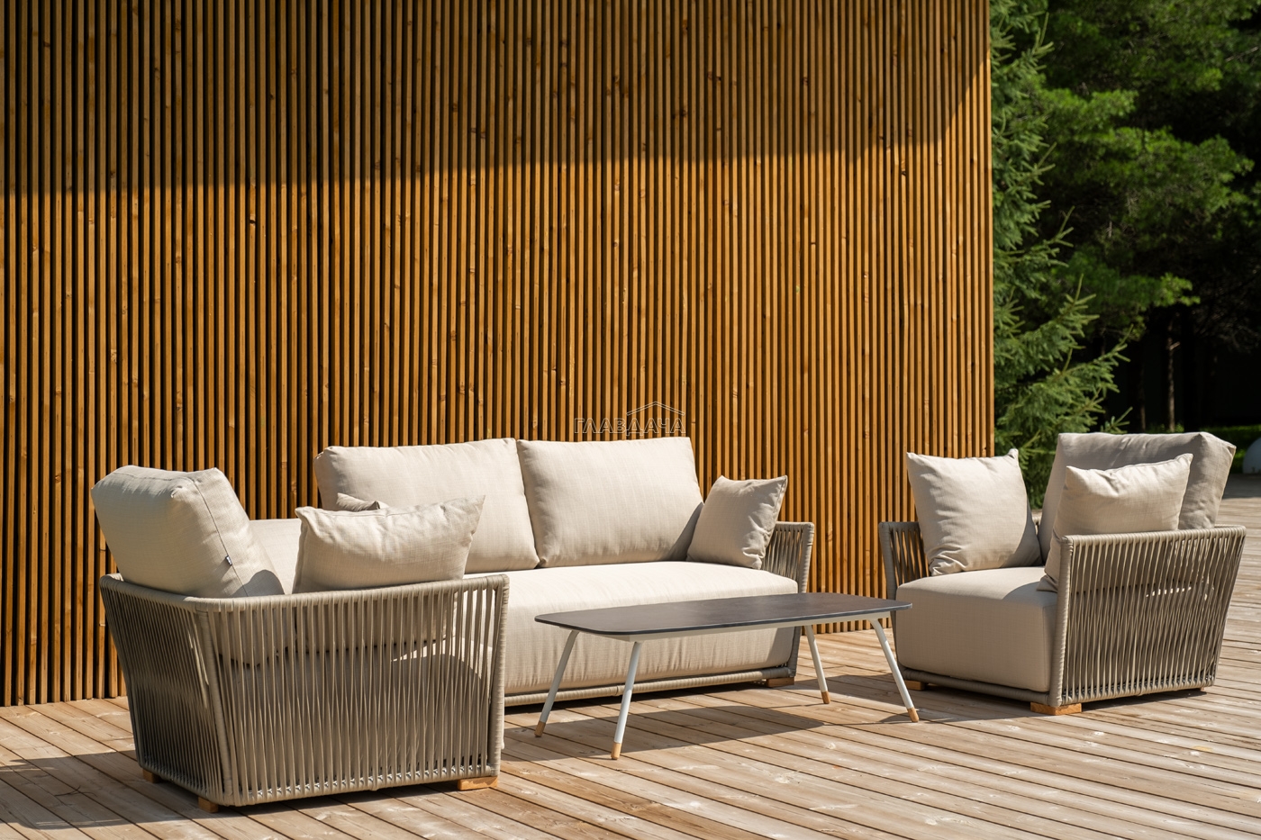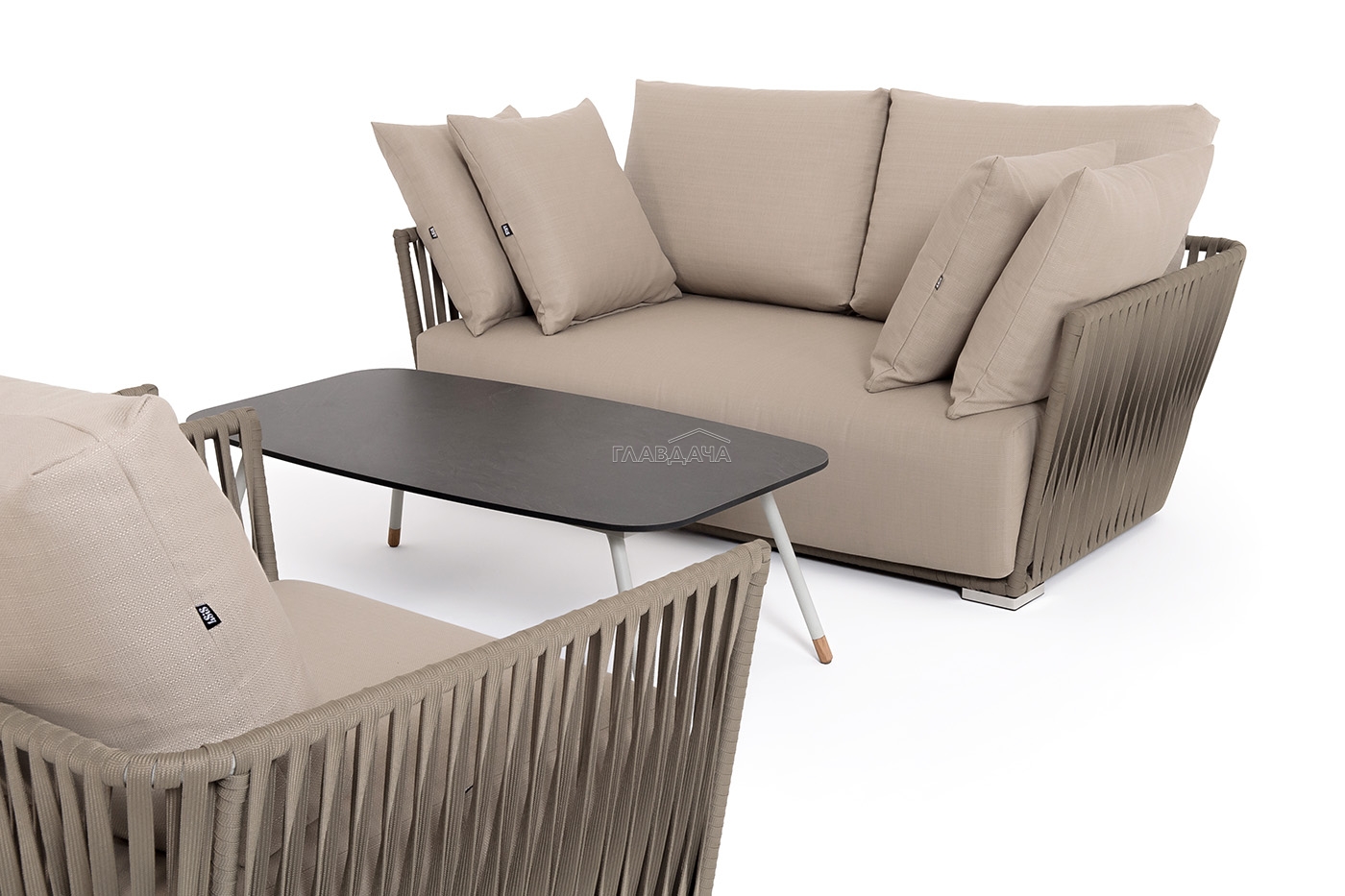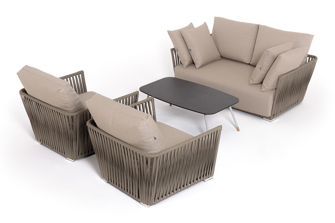 Каркас уличной мебели выполнен из износостойкого алюминия. Его дополняет серо-коричневая ручная оплетка, изготовленная на основе эластичных синтетических лент из полиэфирных волокон высокой прочности (роупа).