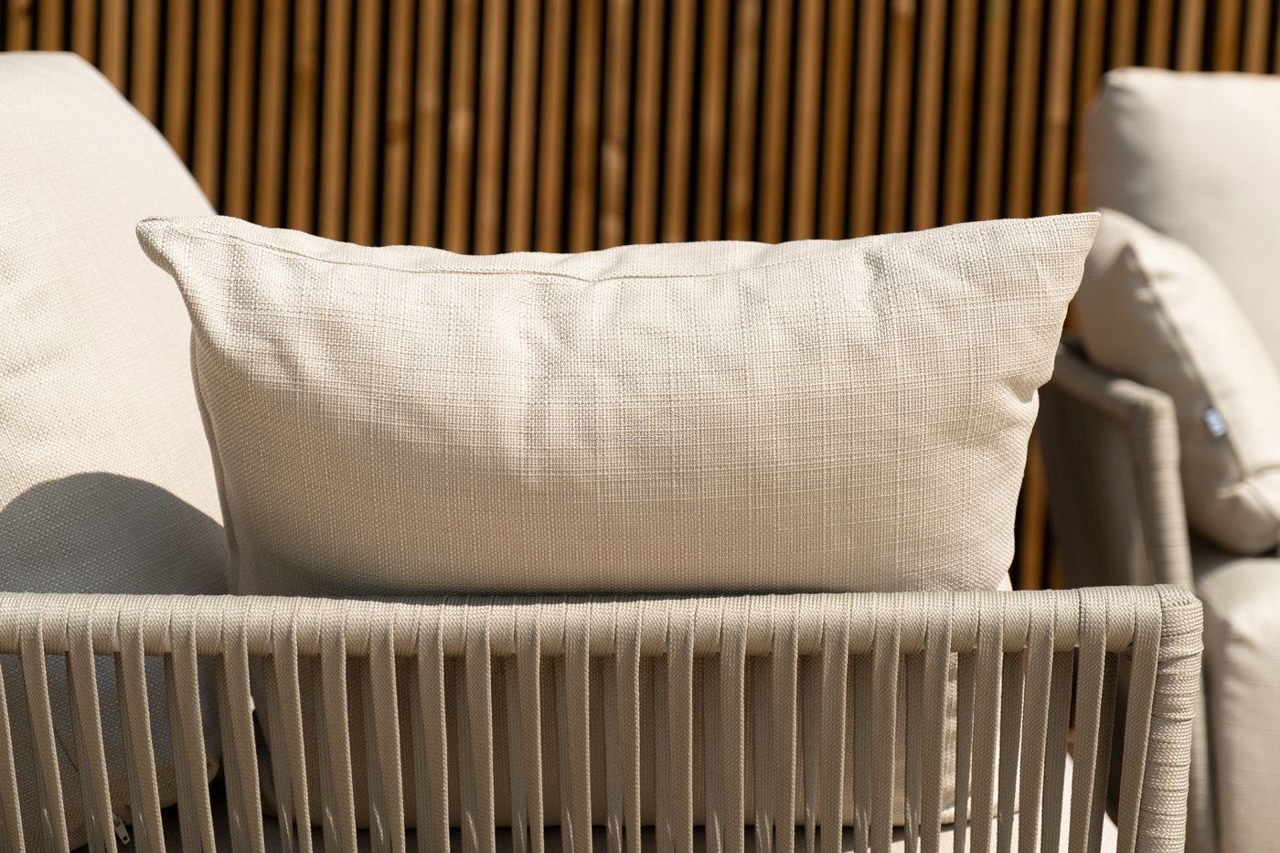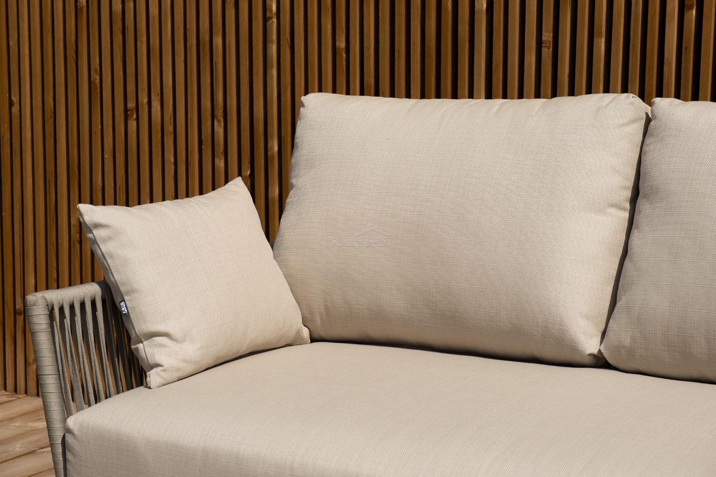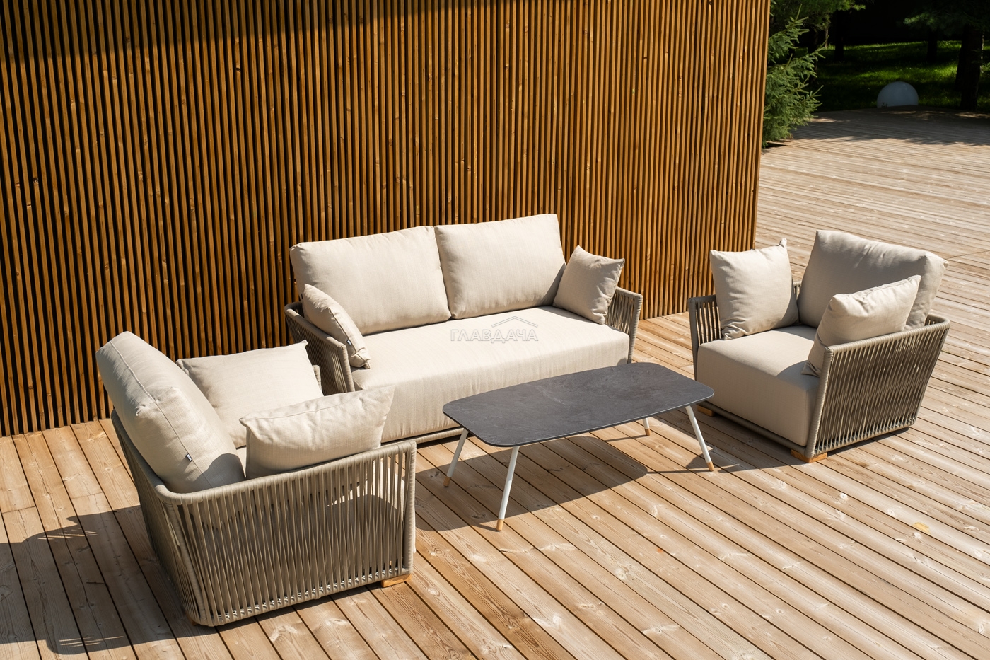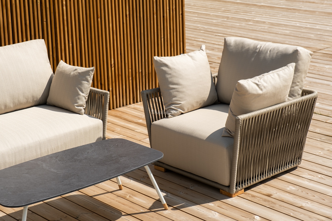 Каркас уличной мебели выполнен из износостойкого алюминия. Его дополняет серо-коричневая ручная оплетка, изготовленная на основе эластичных синтетических лент из полиэфирных волокон высокой прочности (роупа).