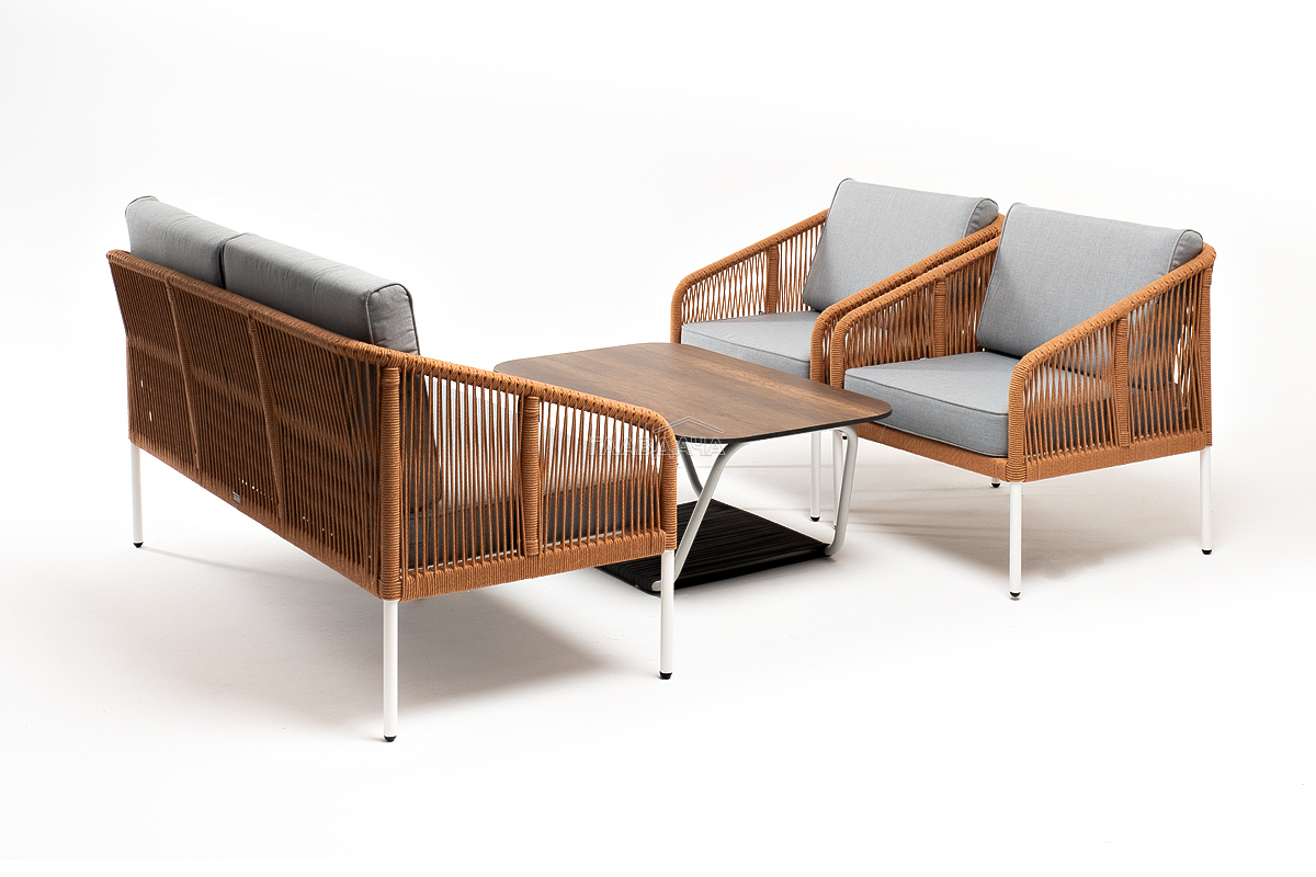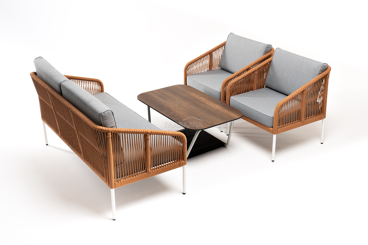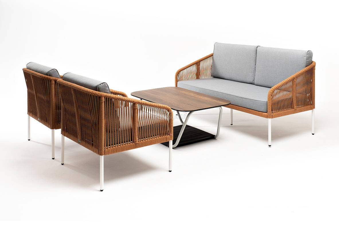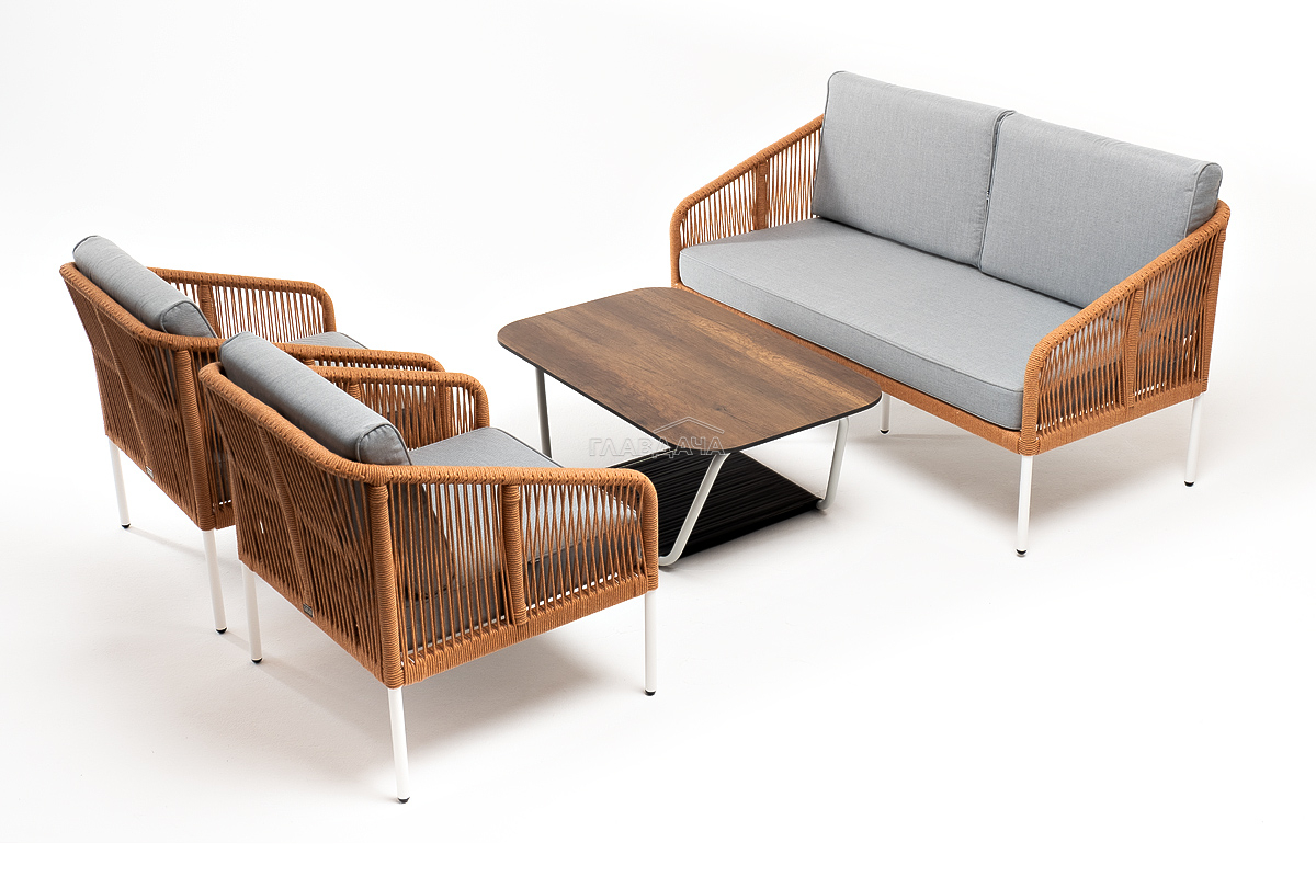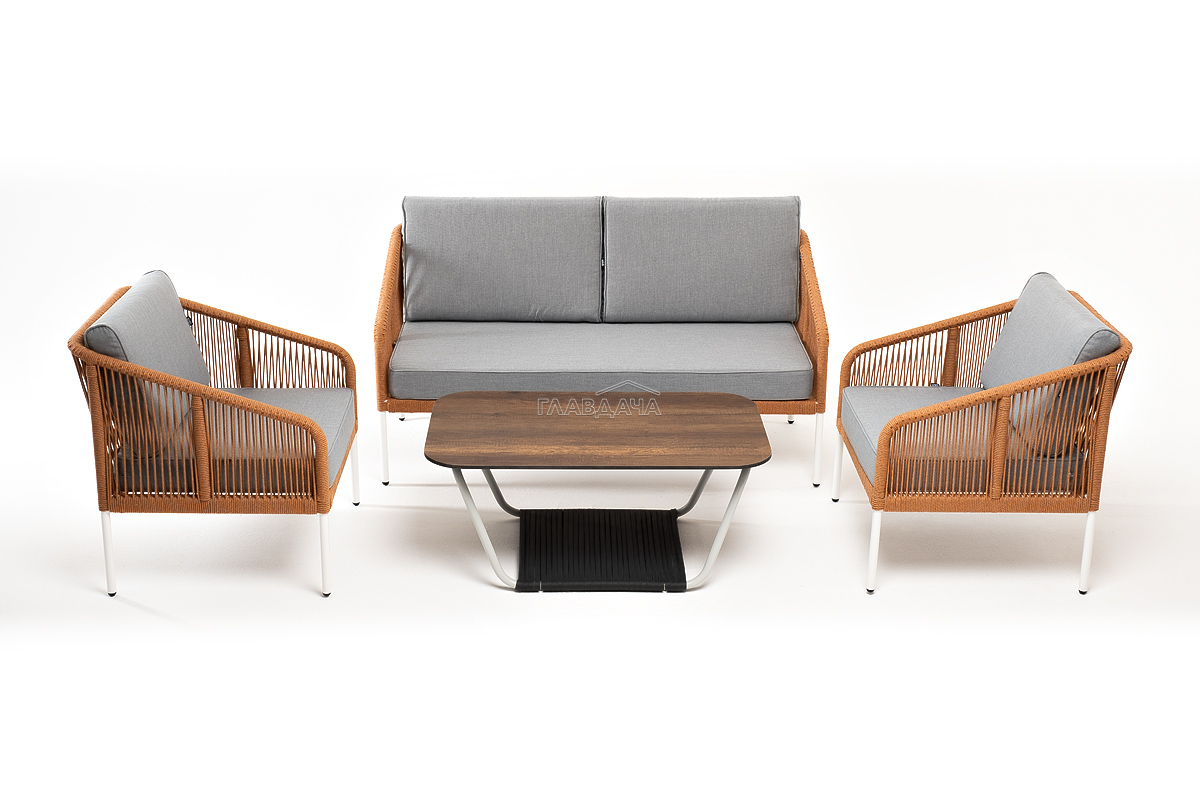 Каркас уличной мебели выполнен из алюминия. Его дополняет оплетка цвета оранжевый меланж, изготовленная на основе эластичных синтетических лент из полиэфирных волокон высокой прочности.