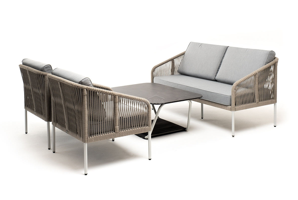 Каркас уличной мебели выполнен из алюминия. Его дополняет оплетка цвета серый меланж, изготовленная на основе эластичных синтетических лент из полиэфирных волокон высокой прочности.
