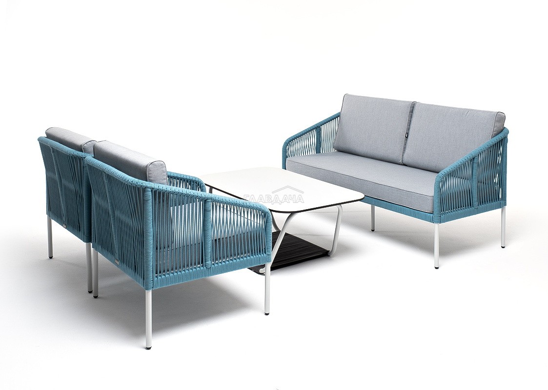 Каркас уличной мебели выполнен из алюминия. Его дополняет бирюзовая оплетка, изготовленная на основе эластичных синтетических лент из полиэфирных волокон высокой прочности.