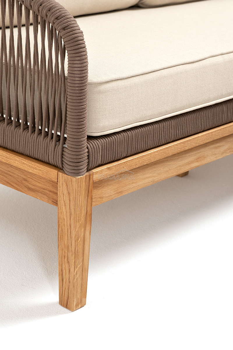 Каркас уличной мебели выполнен из дуба. Его дополняет коричневая оплетка, изготовленная на основе эластичных синтетических лент из полиэфирных волокон высокой прочности.