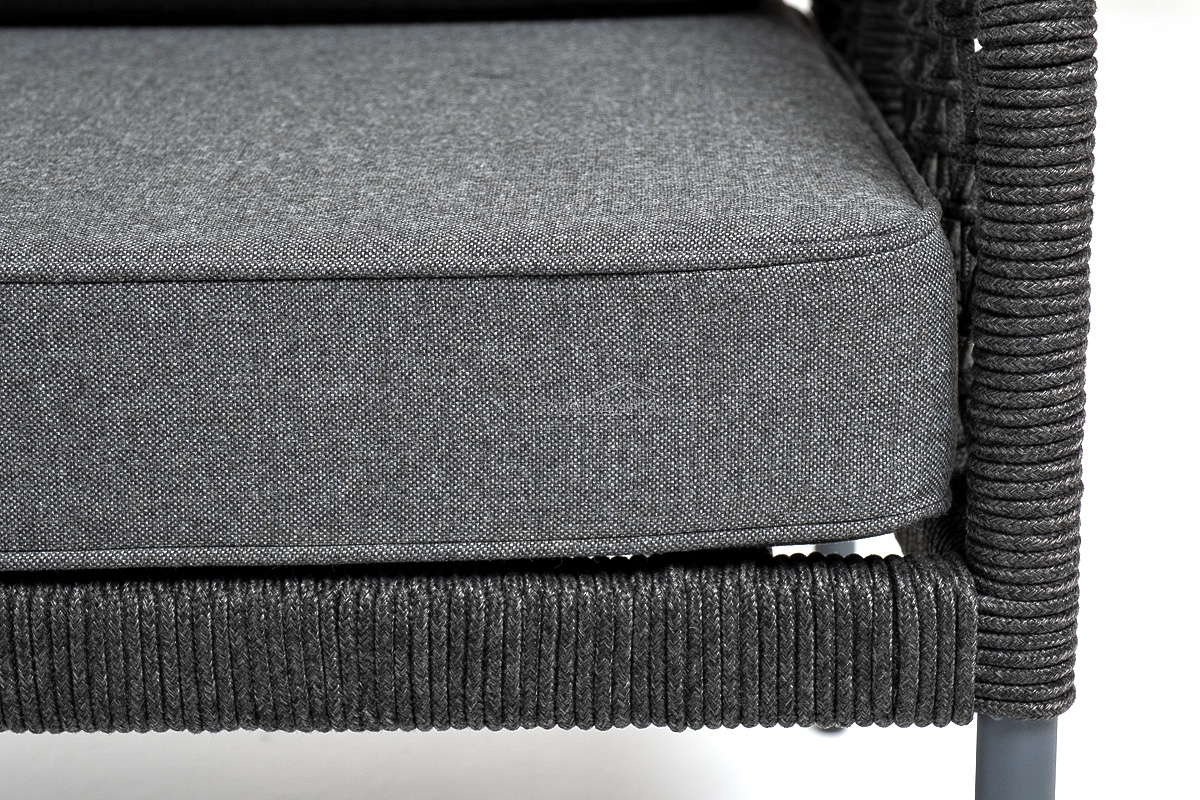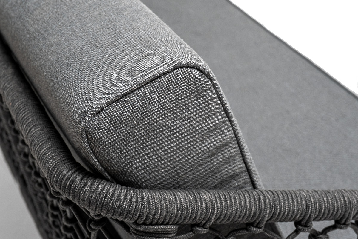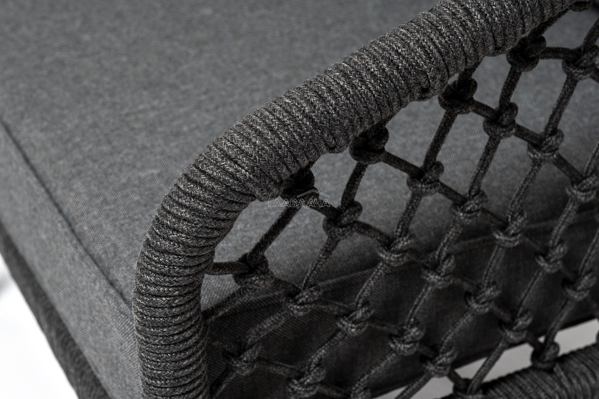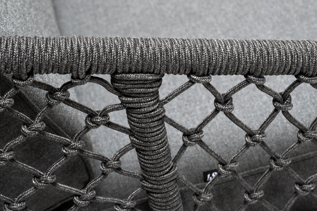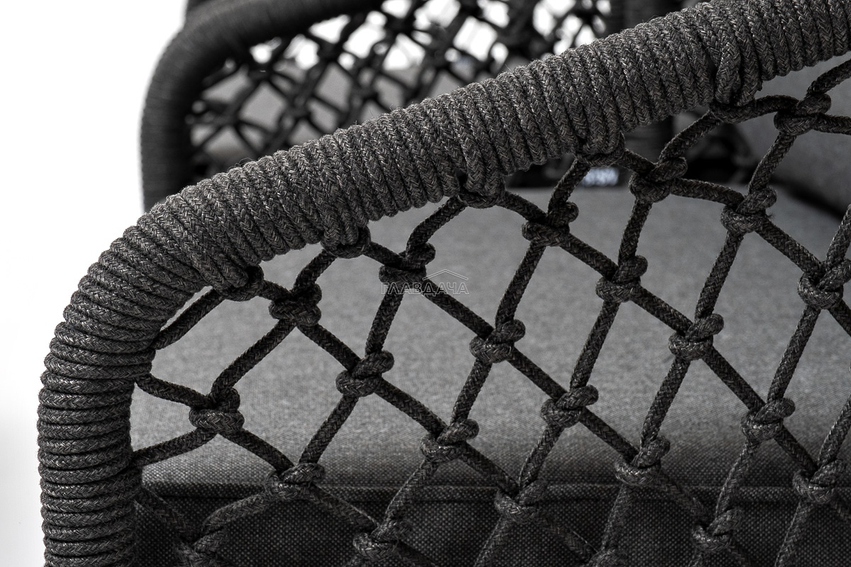 Каркас уличной мебели выполнен из алюминия. Его дополняет темно-серая оплетка, изготовленная на основе эластичных синтетических лент из полиэфирных волокон высокой прочности. Плетение - ручное узелкового вида.