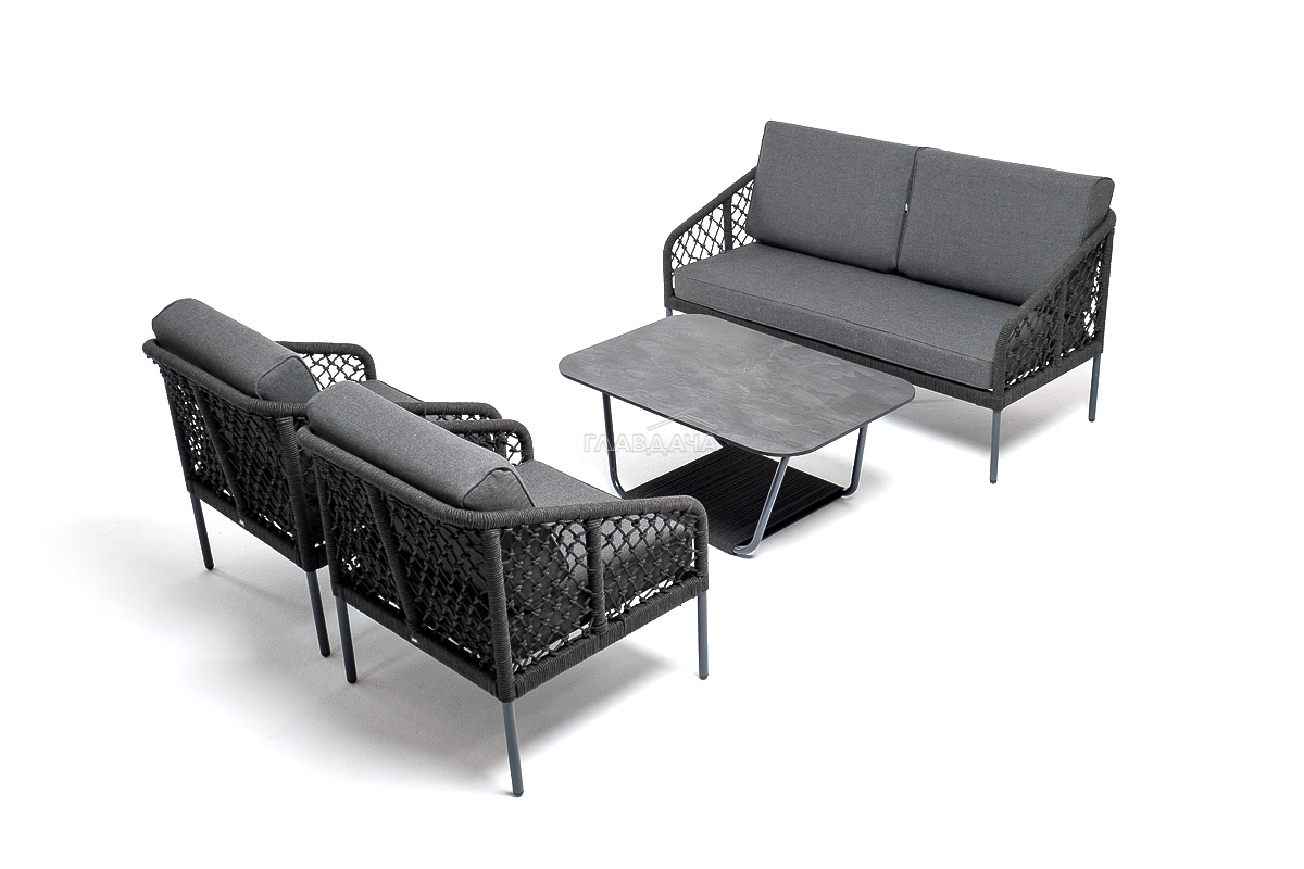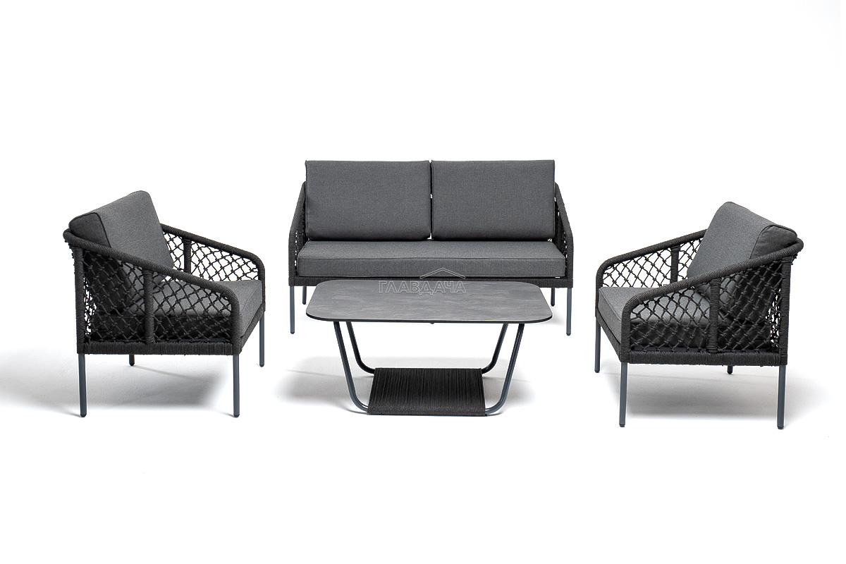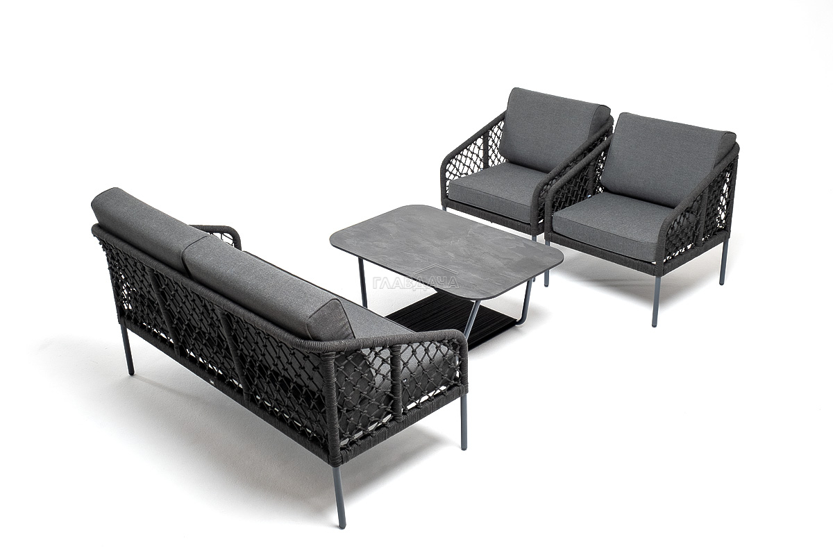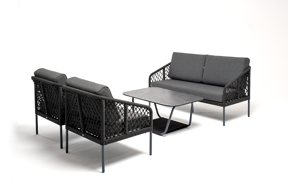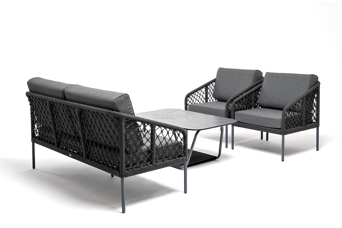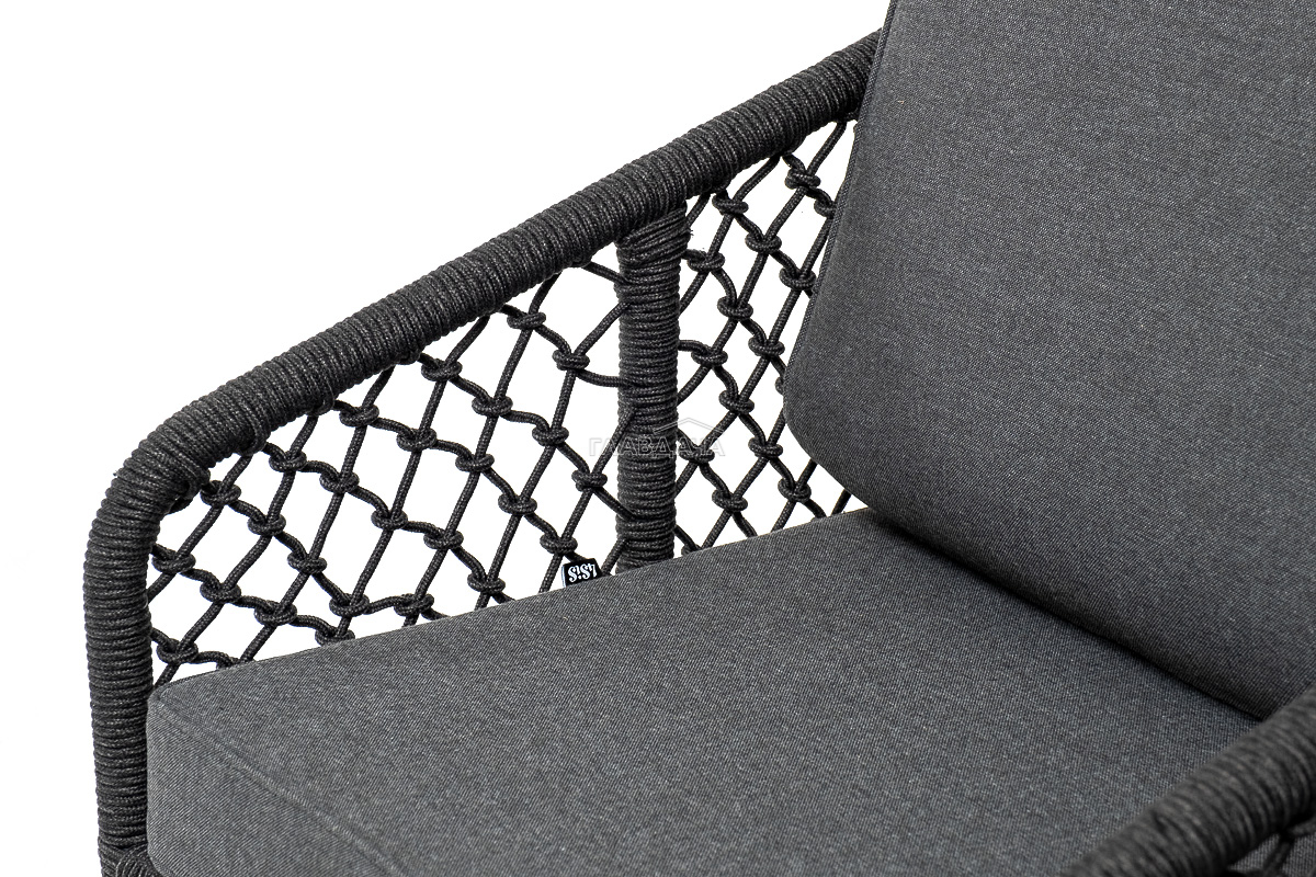Каркас уличной мебели выполнен из алюминия. Его дополняет темно-серая оплетка, изготовленная на основе эластичных синтетических лент из полиэфирных волокон высокой прочности. Плетение - ручное узелкового вида.