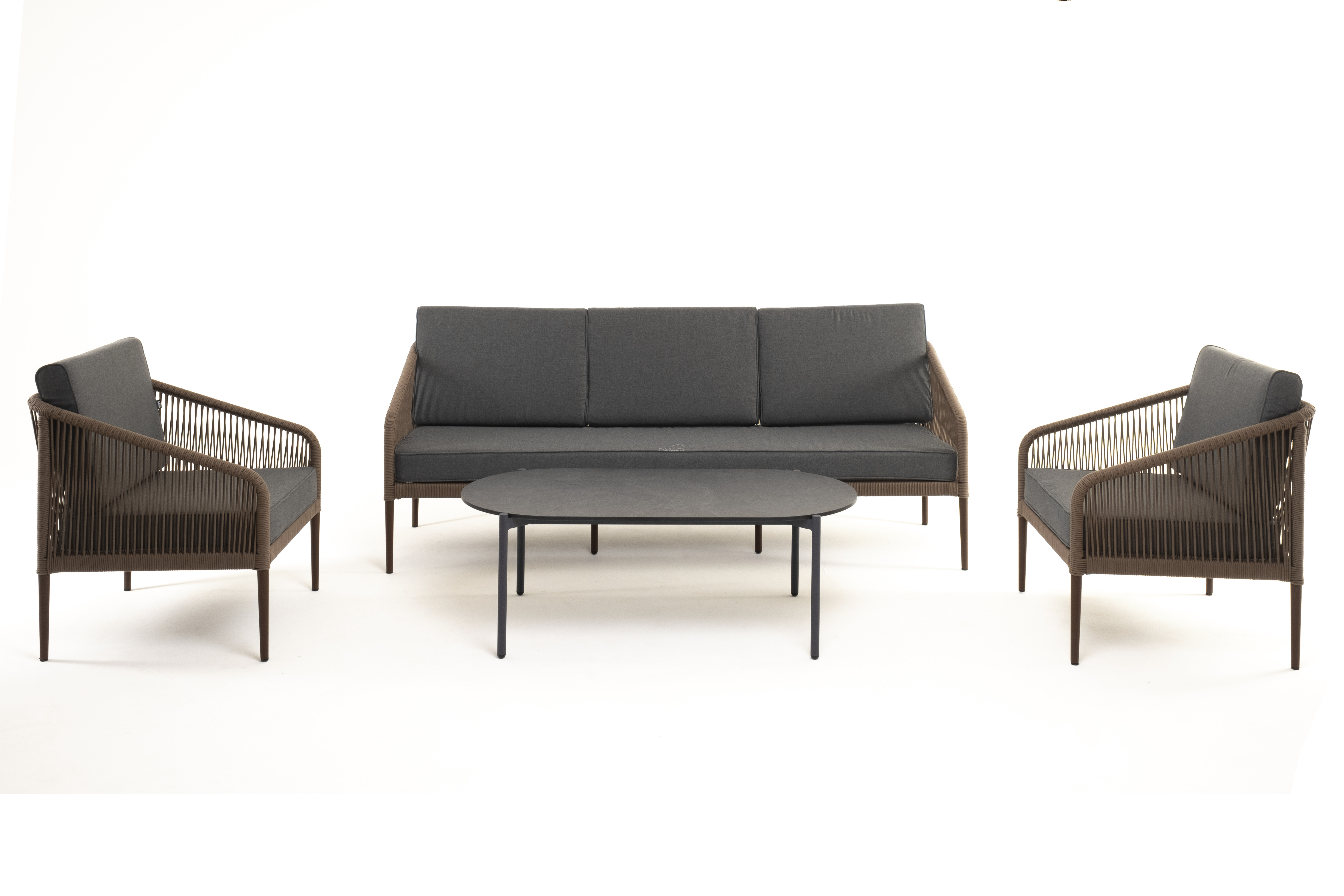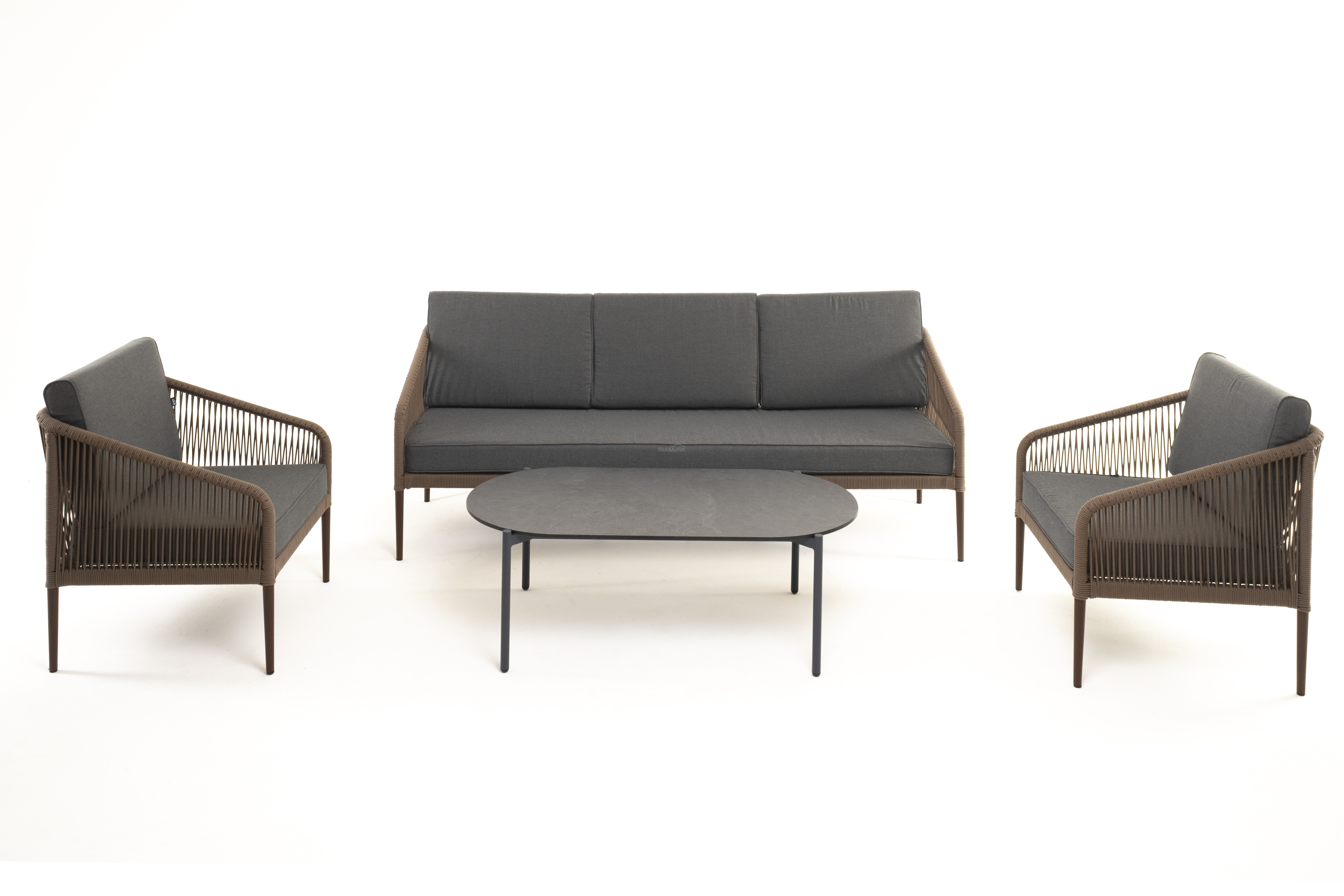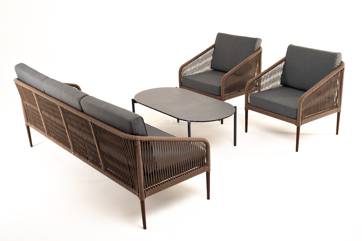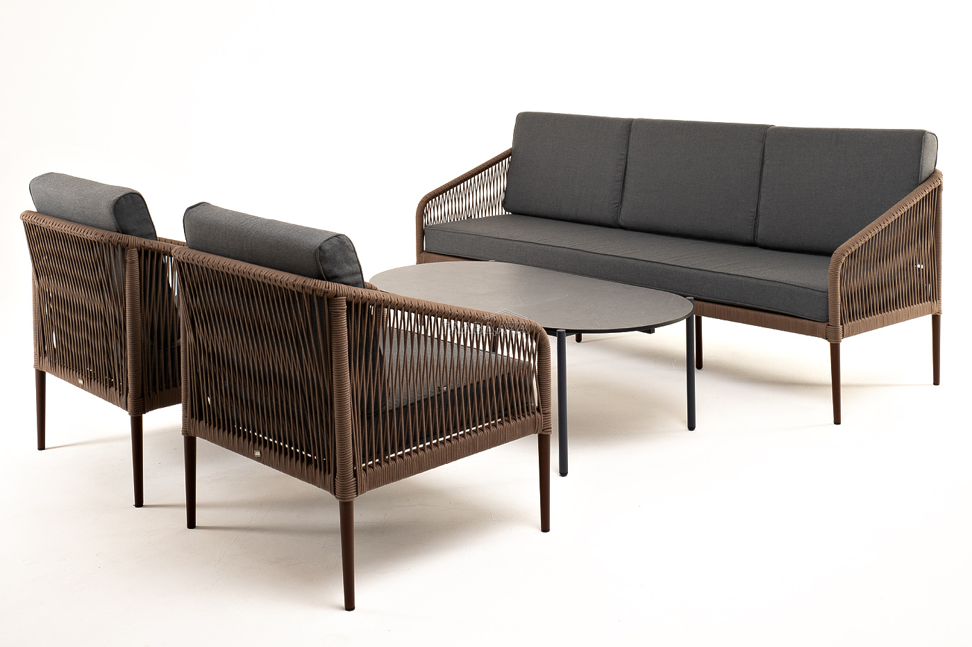 Каркас уличной мебели выполнен из износостойкого алюминия. Его дополняет коричневая ручная оплетка, изготовленная на основе эластичных синтетических лент из полиэфирных волокон высокой прочности.