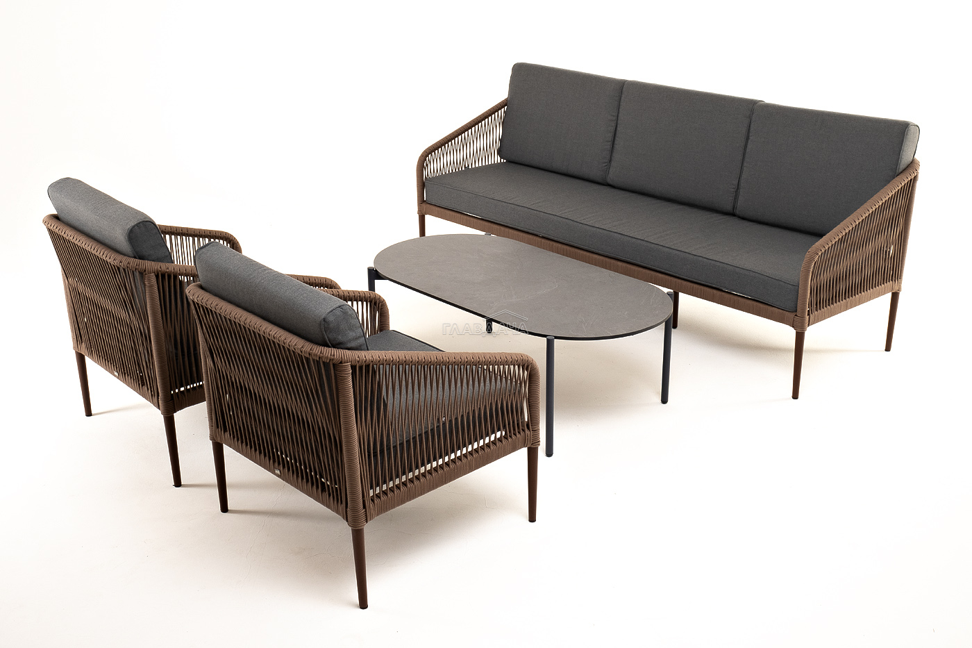 Кресла и диван идут в комплекте с мягкими подушками в чехлах темно-серого цвета.