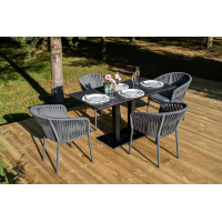 4 кресла из коллекции «Бордо», выполненных из алюминиевого каркаса и ручной оплетки роупом. Это эластичные синтетические ленты из высокопрочных полиэфирных волокон, представлены в темно-сером цвете.