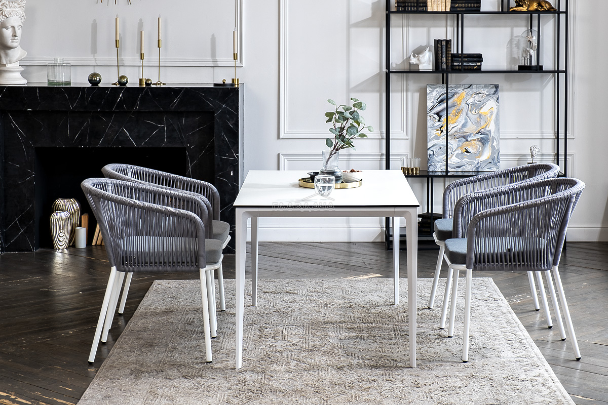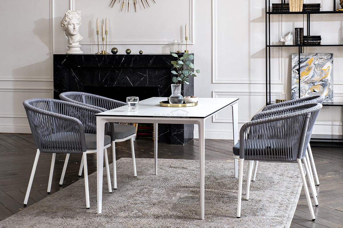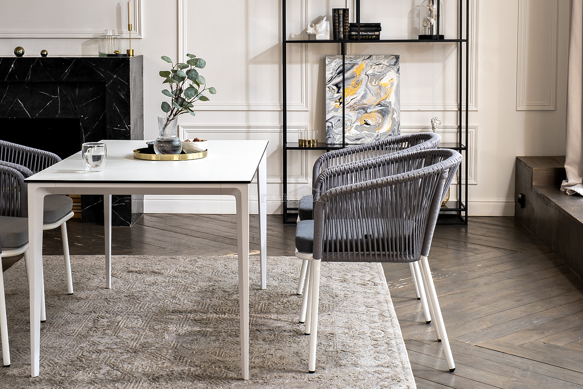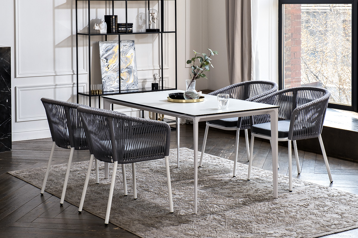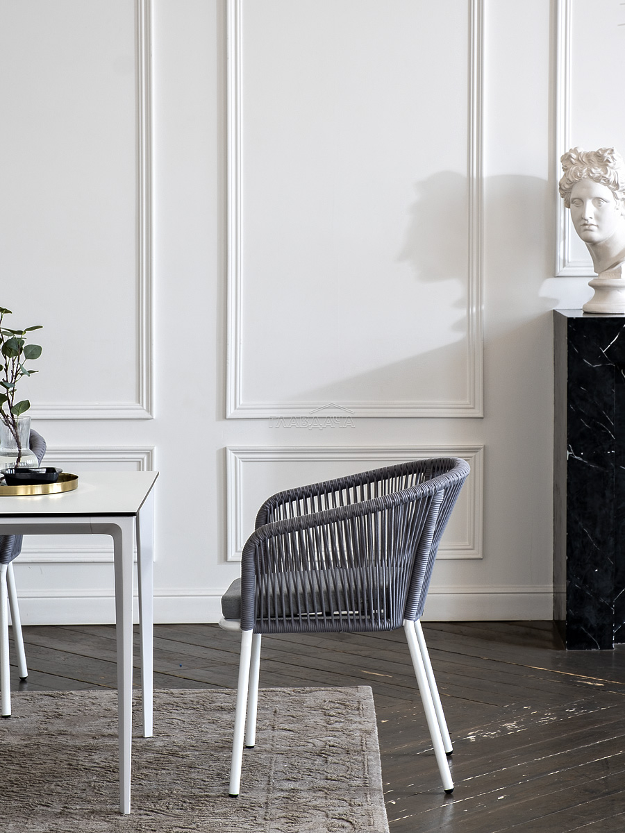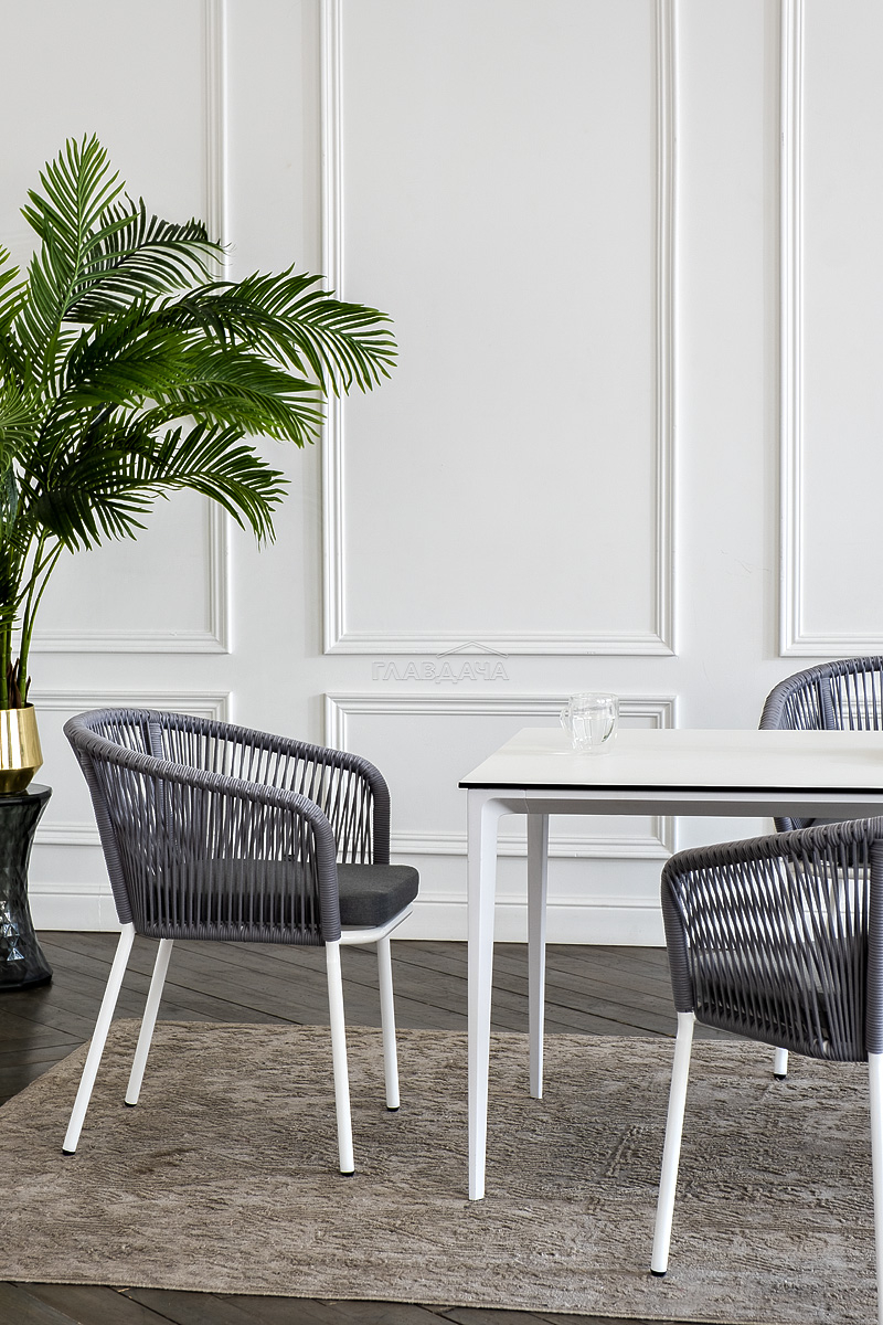 - 4 плетеных стула «Марсель» из роупа, размером - 570×620×775 мм, цвет роупа - светло-серый, каркас - белый.