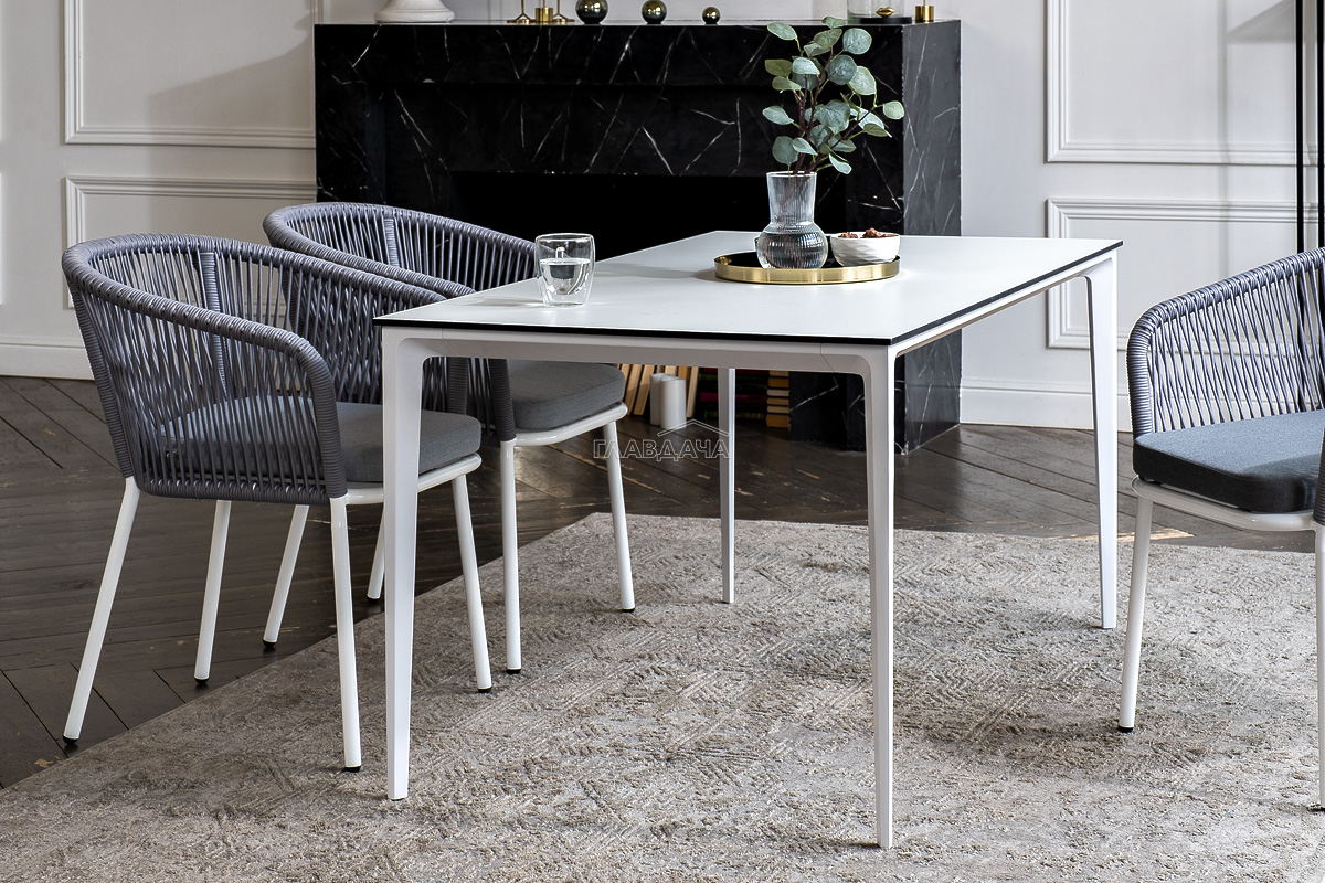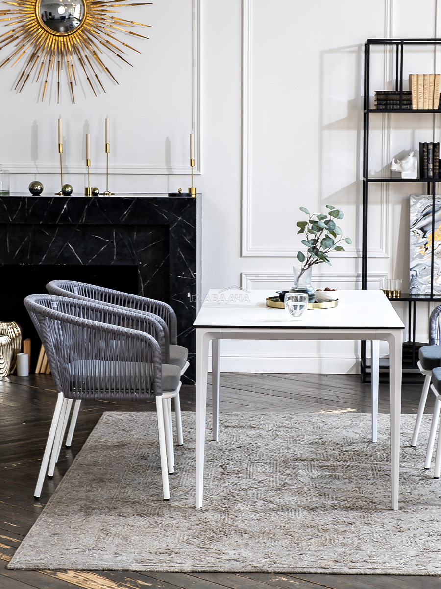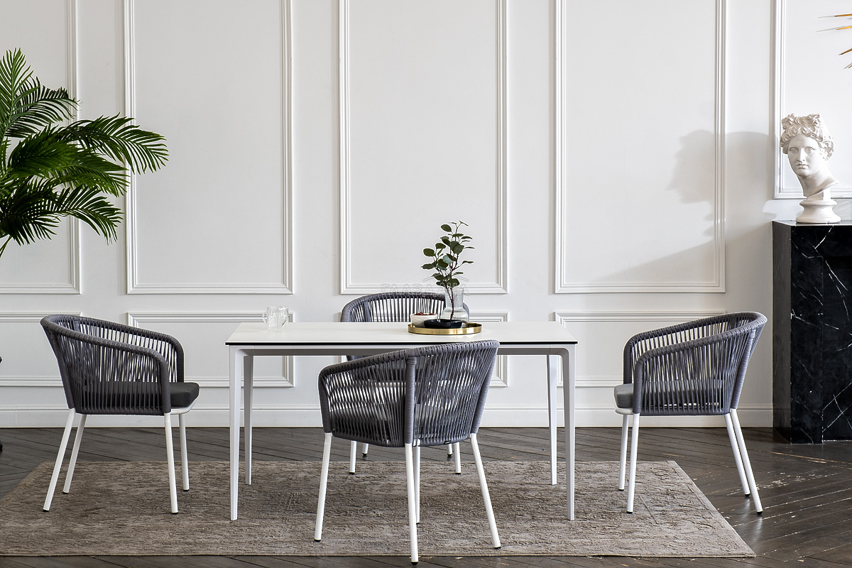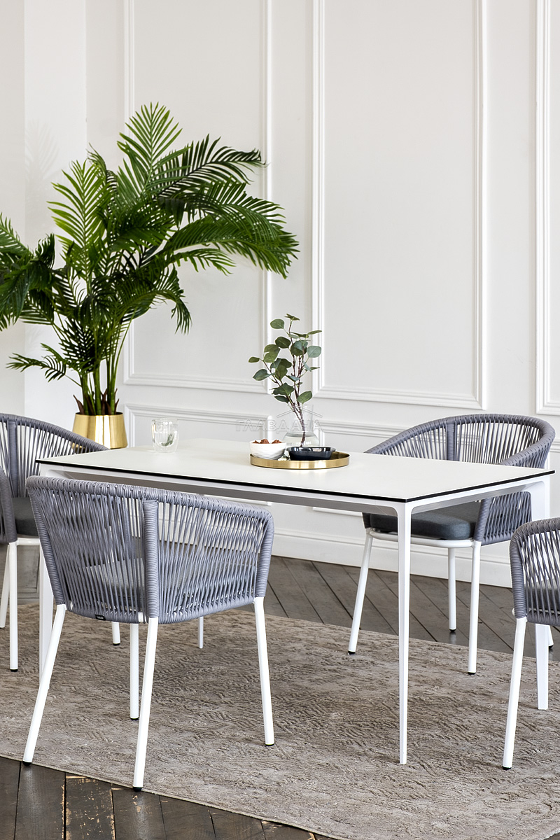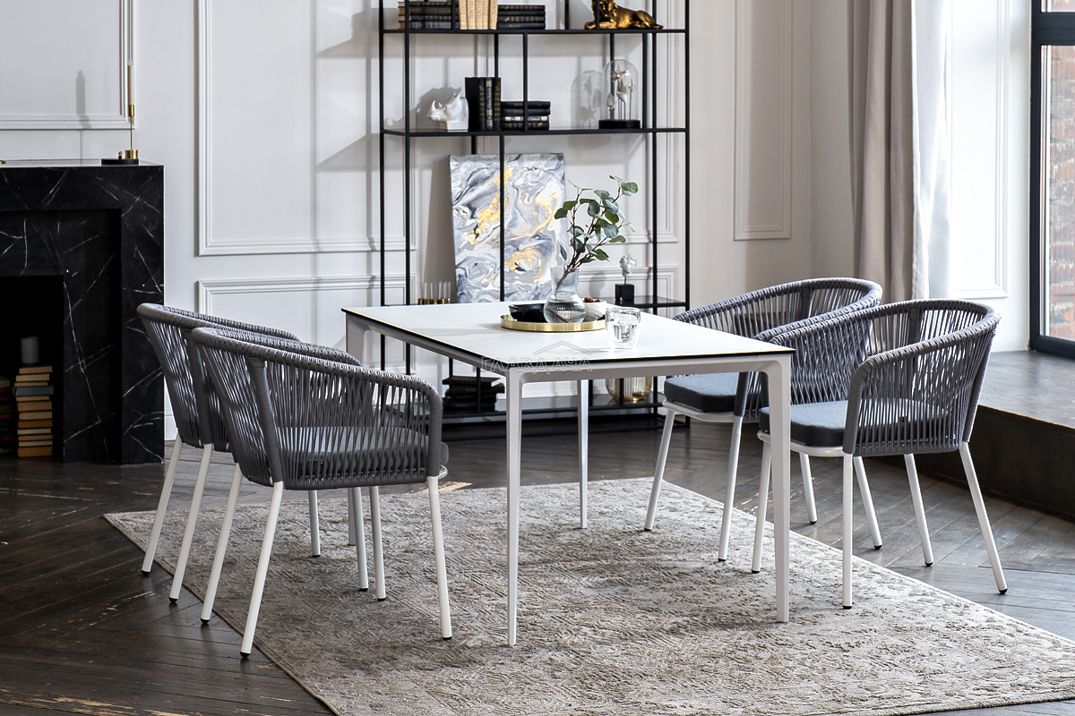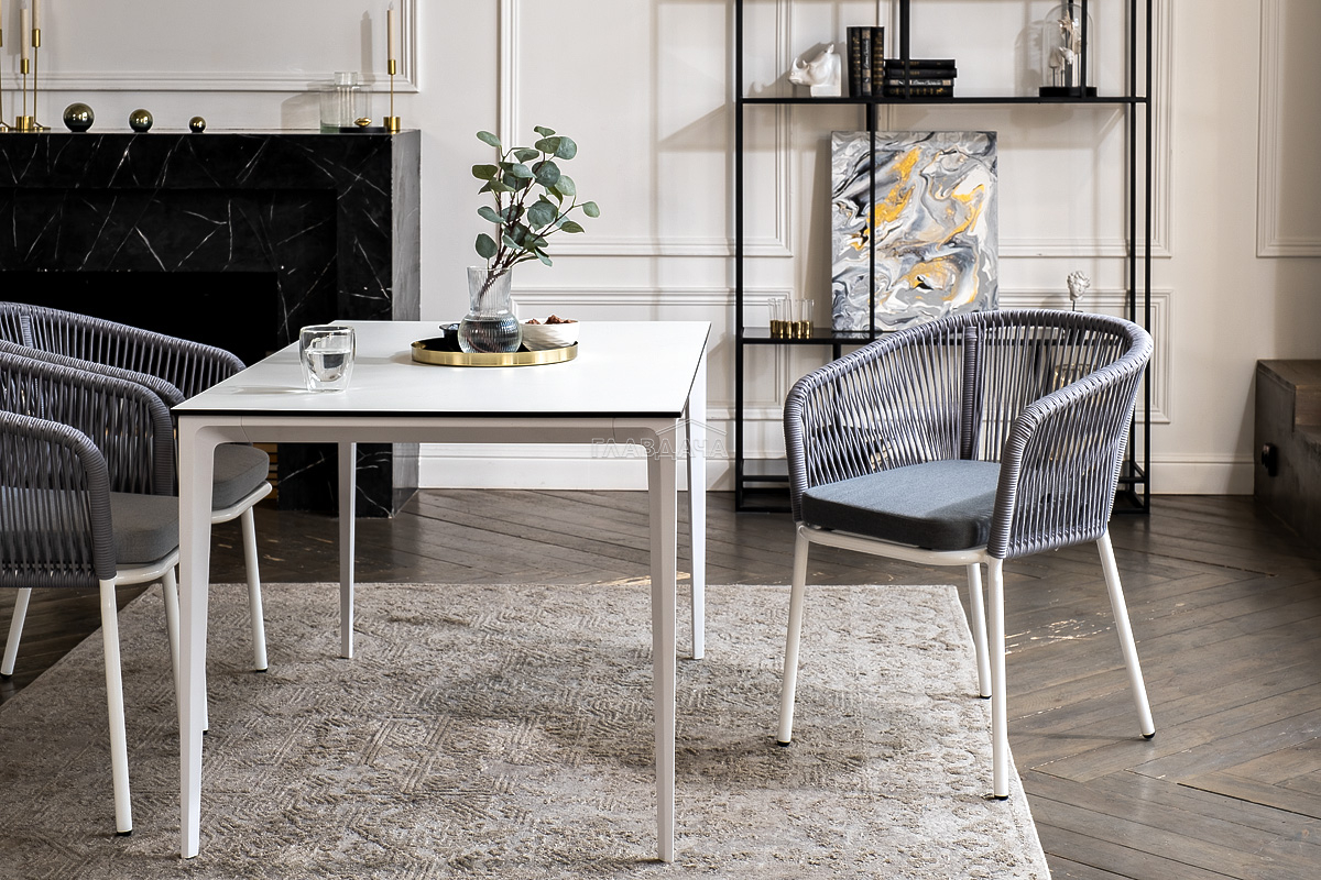 - 4 плетеных стула «Марсель» из роупа, размером - 570×620×775 мм, цвет роупа - светло-серый, каркас - белый.
