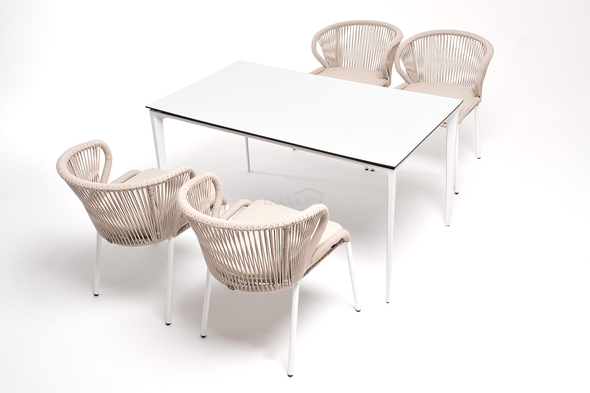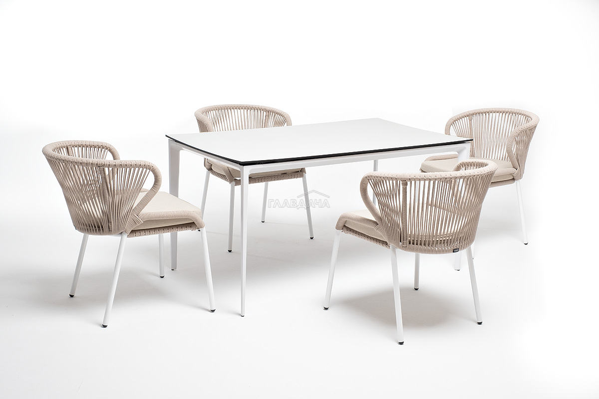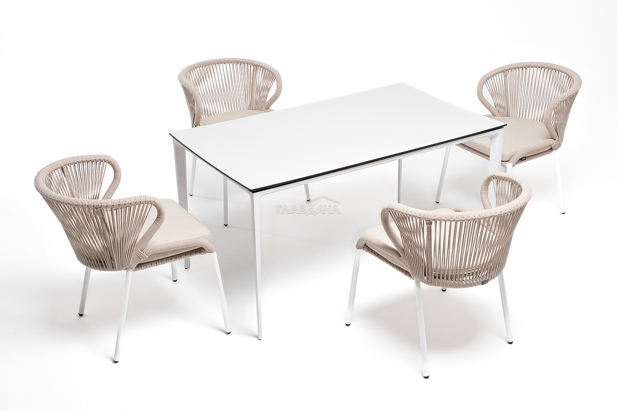 В этот комплект входит стол с прочной и стильной столешницей из HPL-пластика размером 1400×800 мм и высотой 75 см (цвет столешницы - молочный), а также 4 плетеных стула «Милан», изготовленных из бежевого роупа с белым алюминиевым каркасом.