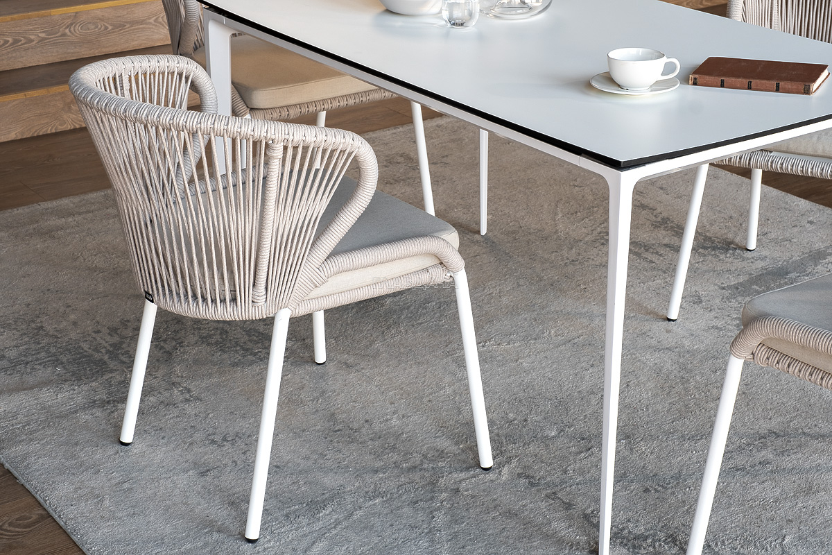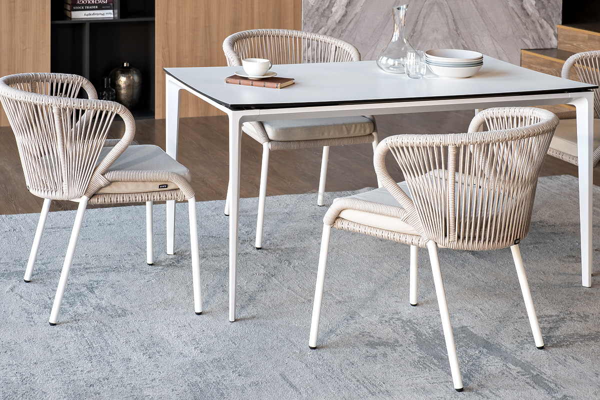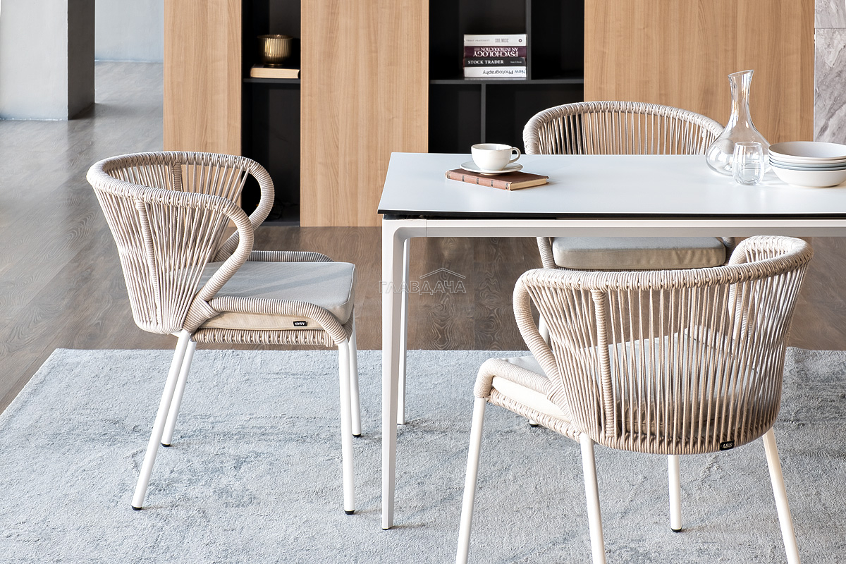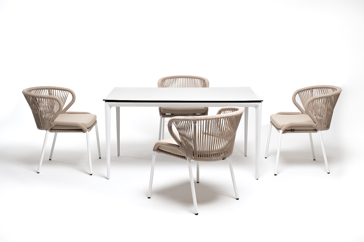 В этот комплект входит стол с прочной и стильной столешницей из HPL-пластика размером 1400×800 мм и высотой 75 см (цвет столешницы - молочный), а также 4 плетеных стула «Милан», изготовленных из бежевого роупа с белым алюминиевым каркасом.
