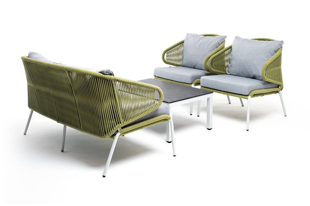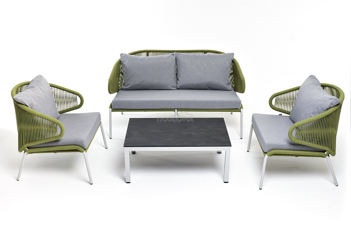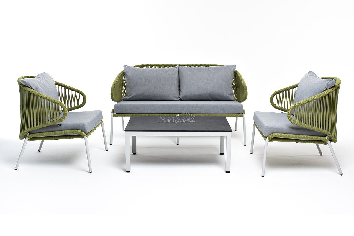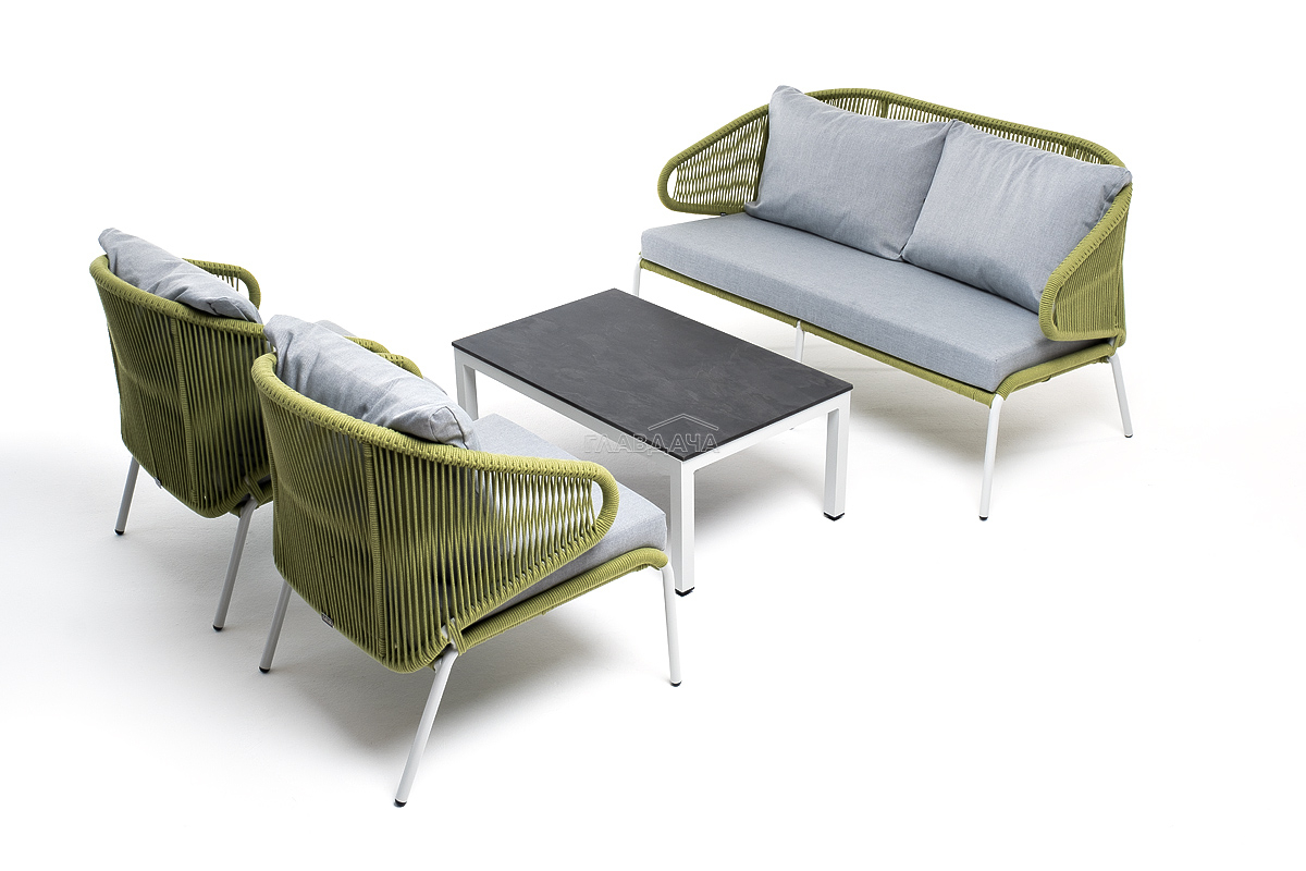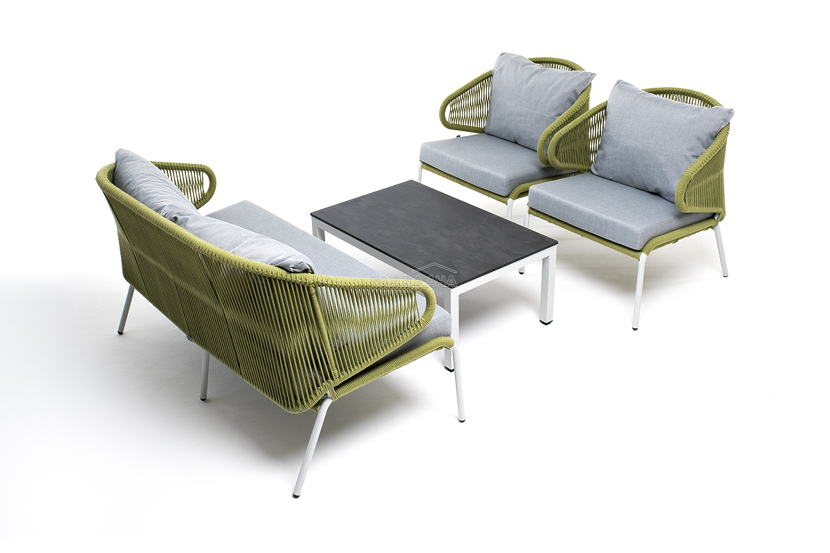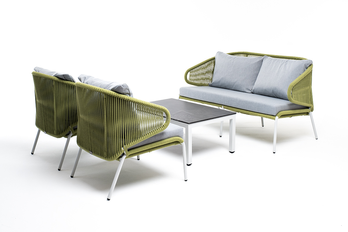 Каркас уличной мебели выполнен из износостойкого алюминия. Его дополняет ручная оплетка - салатовый меланж, изготовленная на основе эластичных синтетических лент из полиэфирных волокон высокой прочности (роупа).