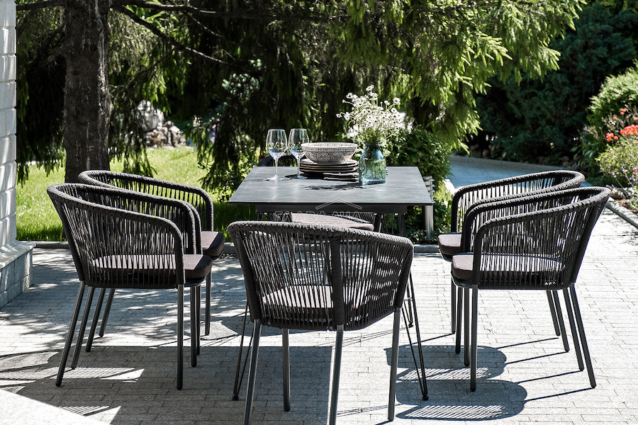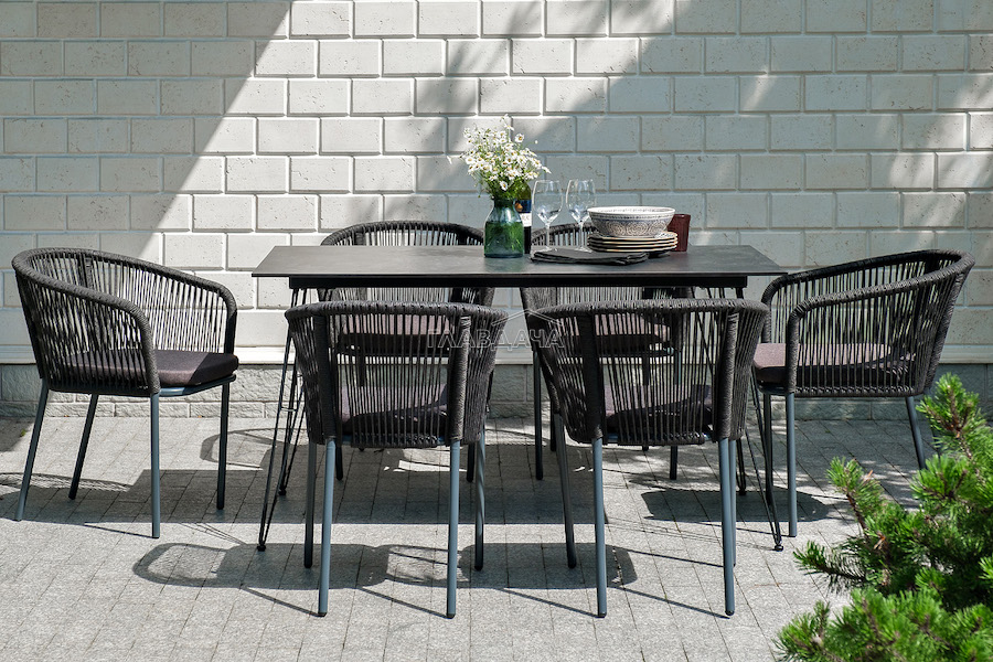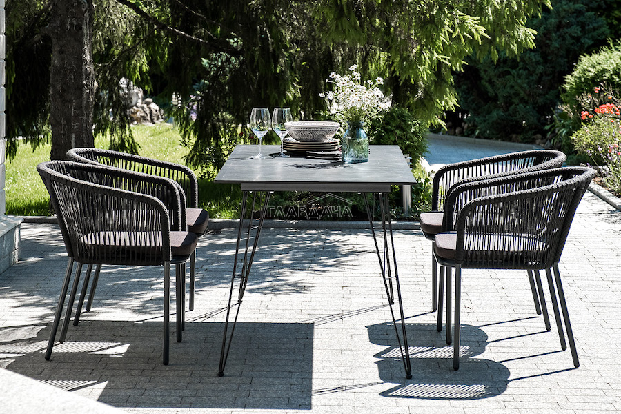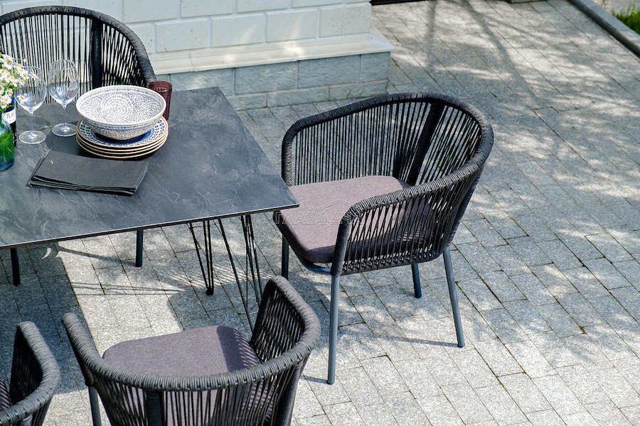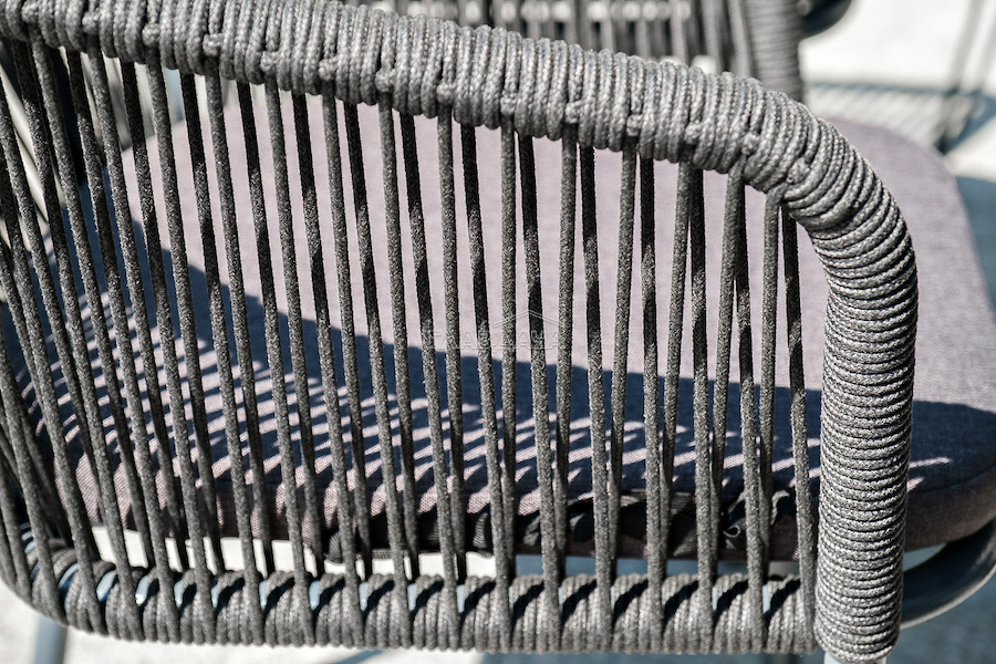 Каркас стульев - алюминиевый, оплетен вручную современным материалом - роупом. Это эластичные синтетические ленты из высокопрочных полиэфирных волокон. В комплект входят подушки со съёмными водоотталкивающими чехлами серого цвета.