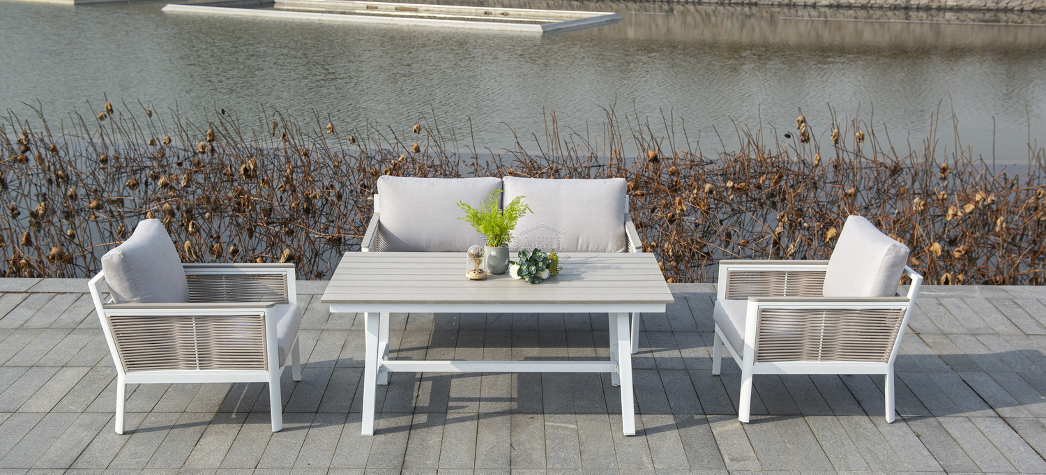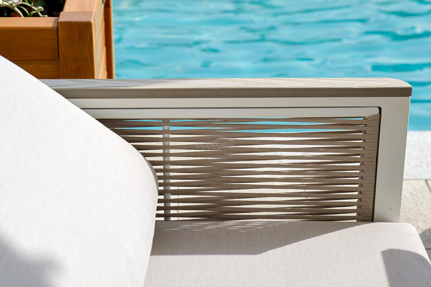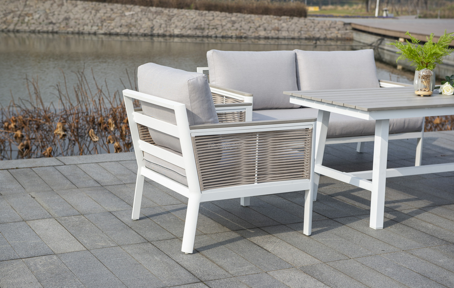 «Сан Ремо» лаунж-зона, алюминиевый каркас белого цвета, вручную оплетенный роупом серо-коричневого цвета.