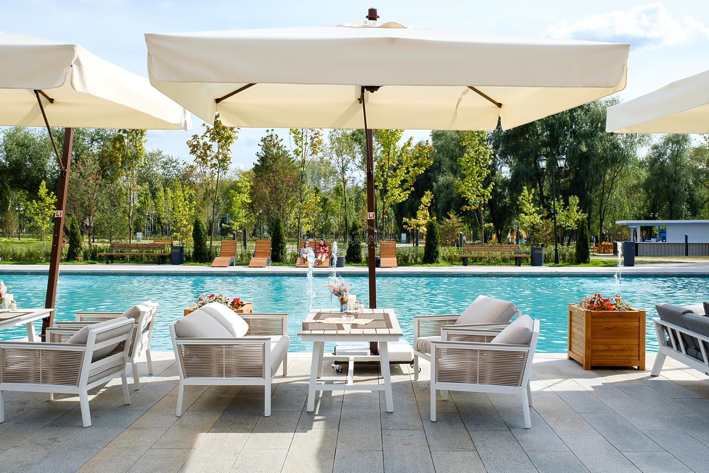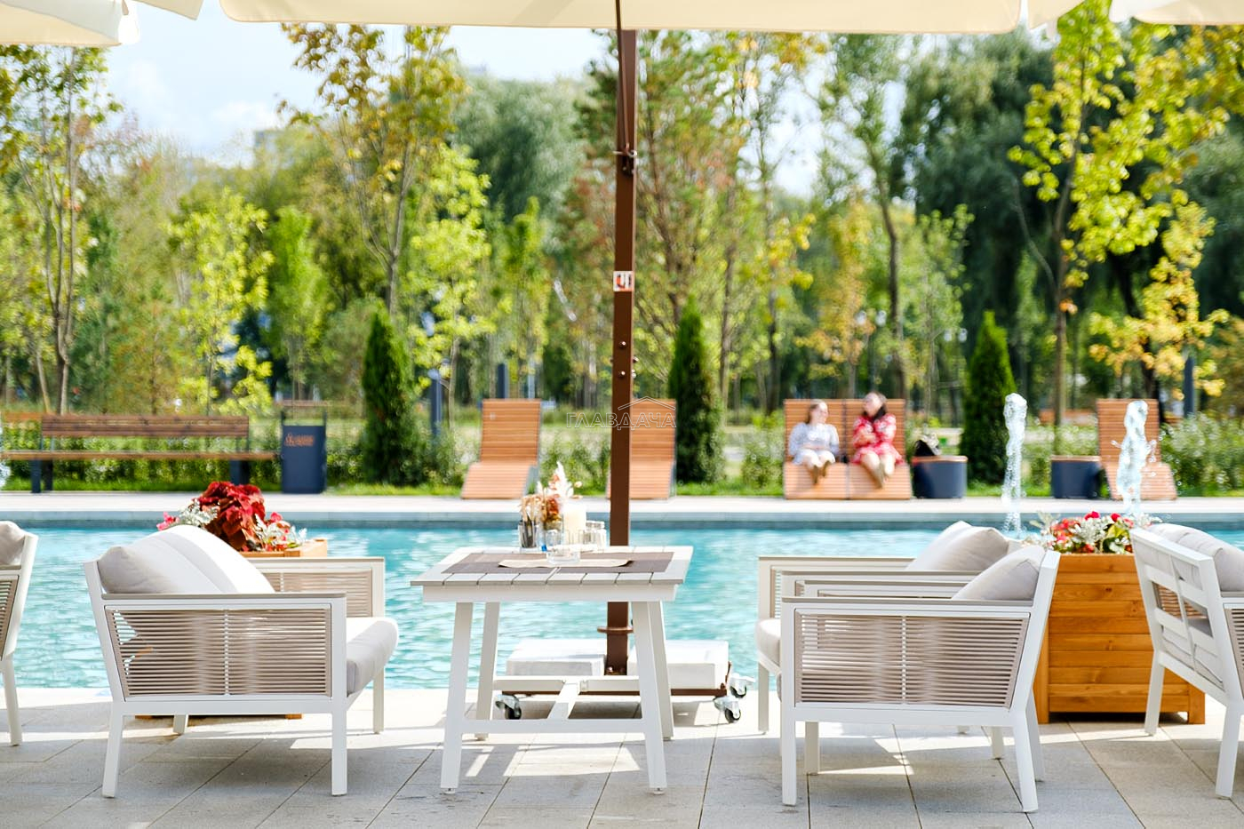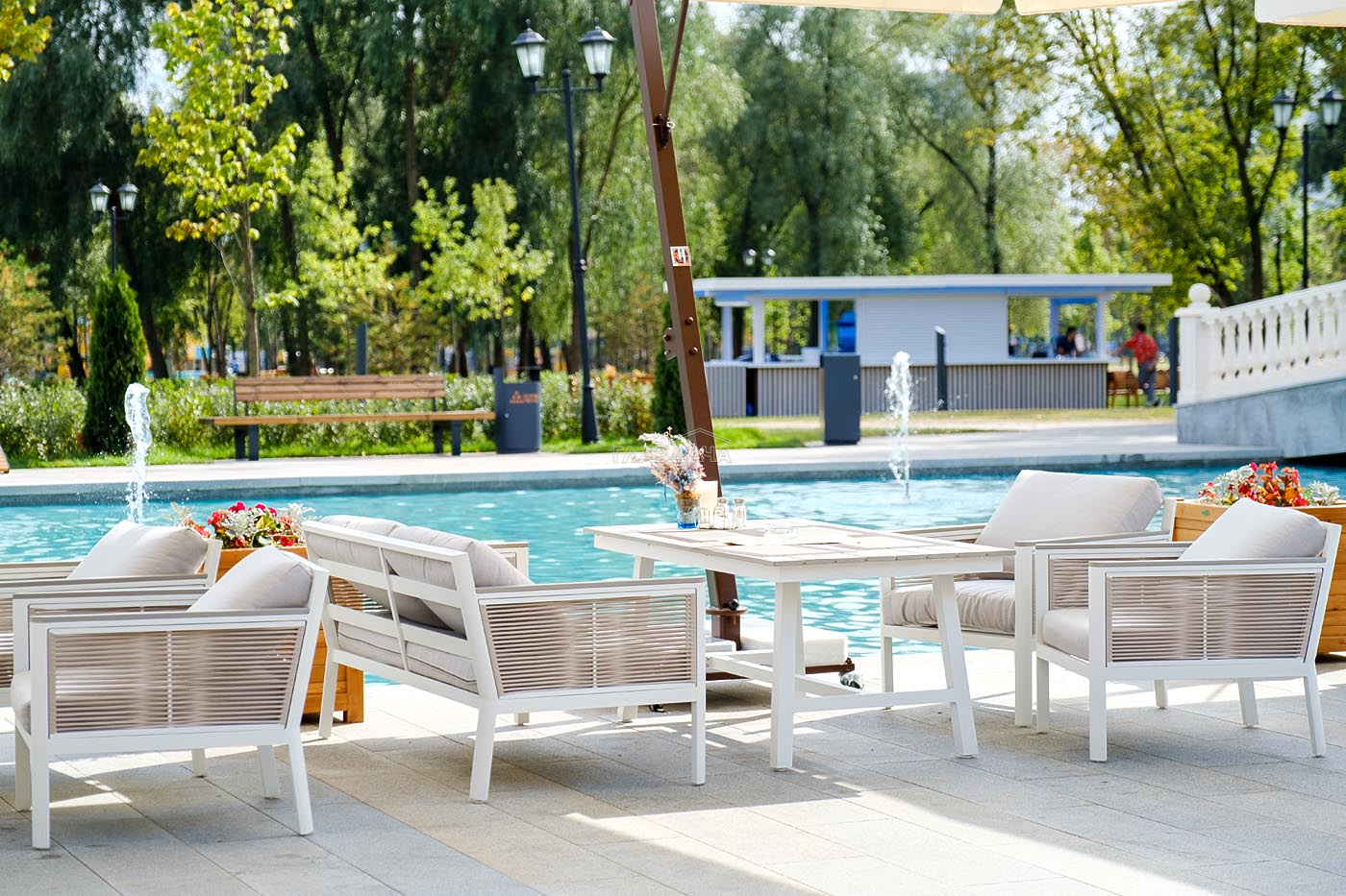 «Сан Ремо» лаунж-зона, алюминиевый каркас белого цвета, вручную оплетенный роупом серо-коричневого цвета.