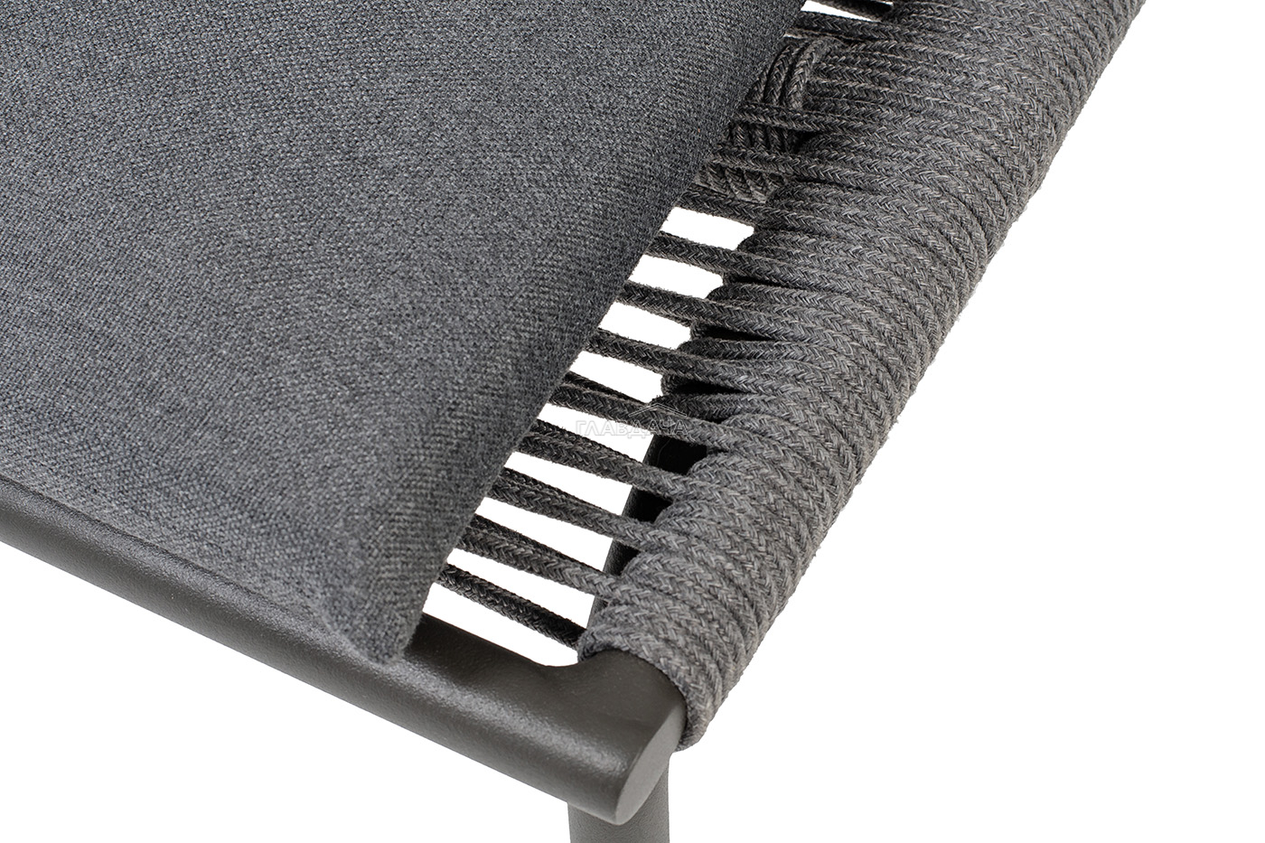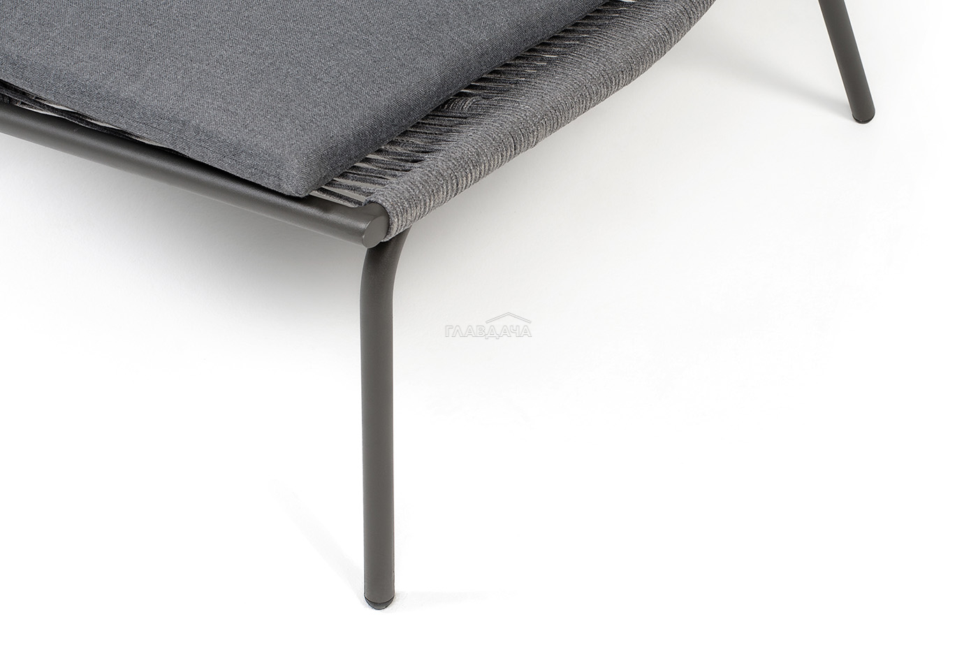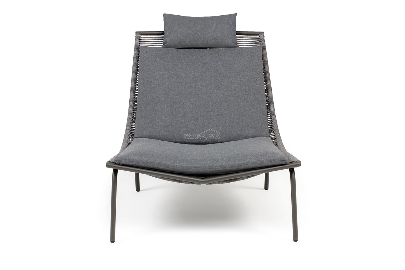 Каркас кресла изготовлен из прочного алюминиевого сплава и окрашен в серый (RAL7022) цвет, который предотвращает возникновение коррозии и обеспечивает долгий срок службы. Оплетка из роупа серого оттенка. Такое плетение обладает высокой стойкостью к износу и долговечностью, сохраняя свои свойства даже при активном использовании.