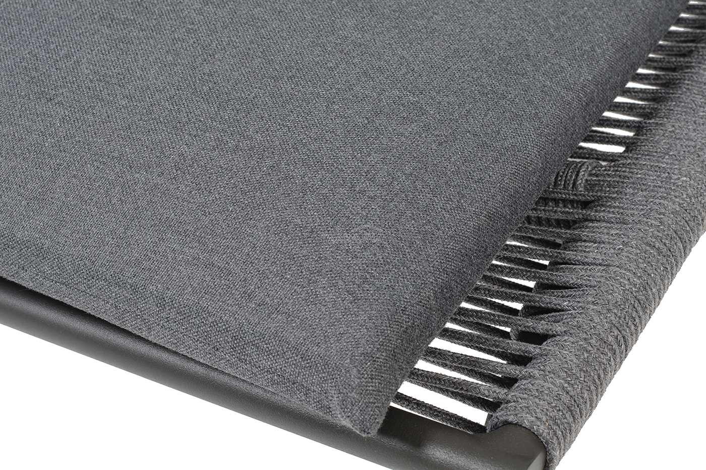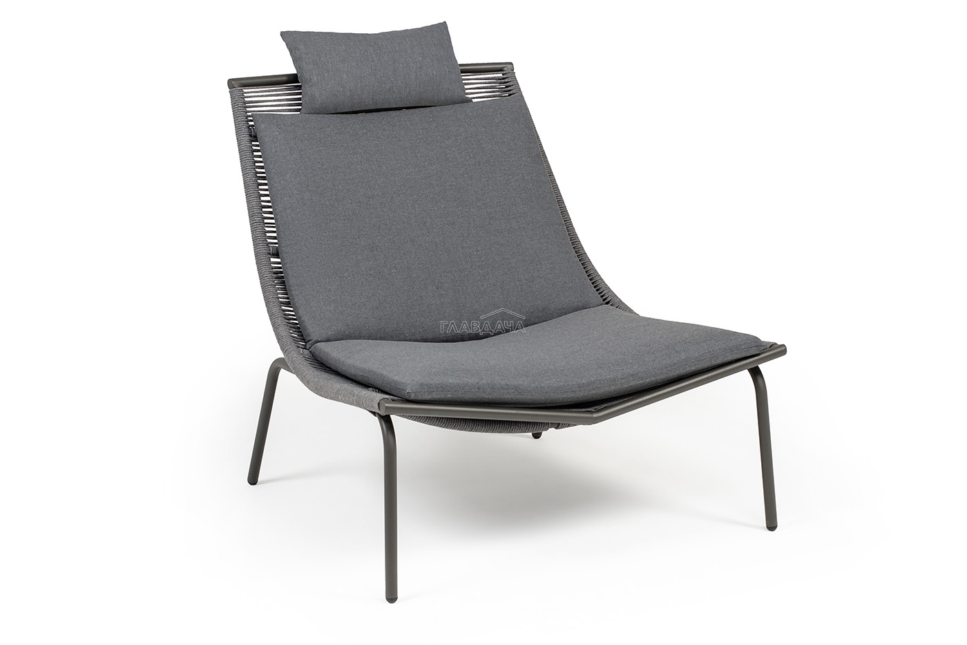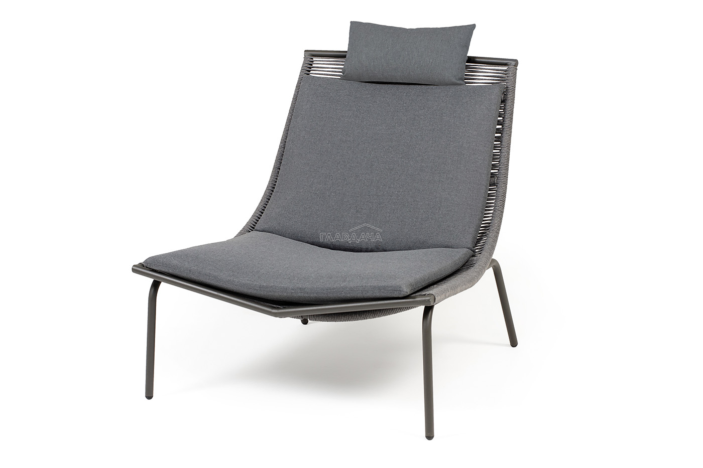 Каркас кресла изготовлен из прочного алюминиевого сплава и окрашен в серый (RAL7022) цвет, который предотвращает возникновение коррозии и обеспечивает долгий срок службы. Оплетка из роупа серого оттенка. Такое плетение обладает высокой стойкостью к износу и долговечностью, сохраняя свои свойства даже при активном использовании.