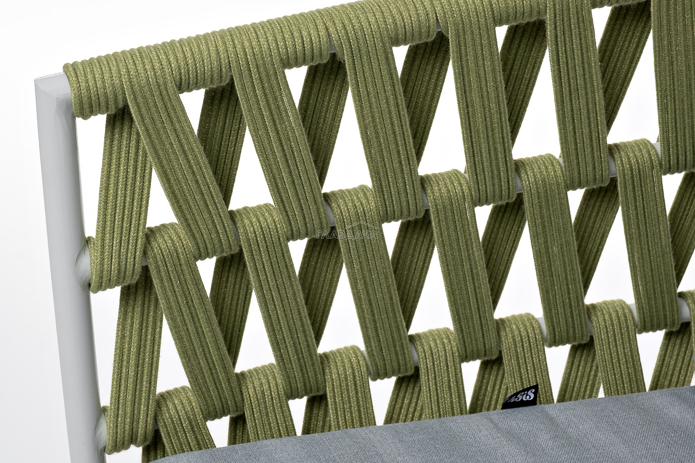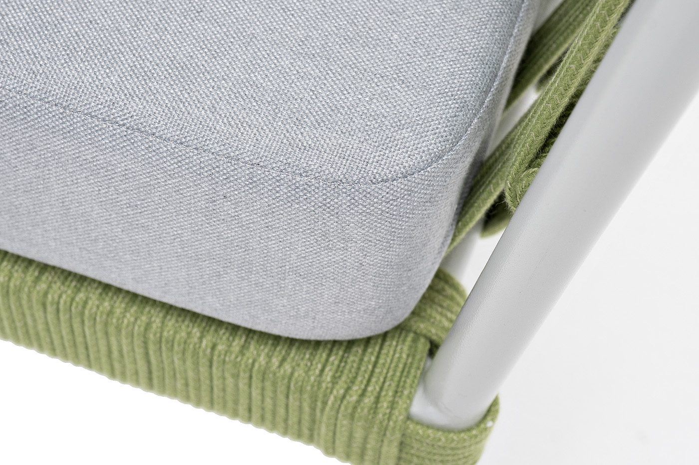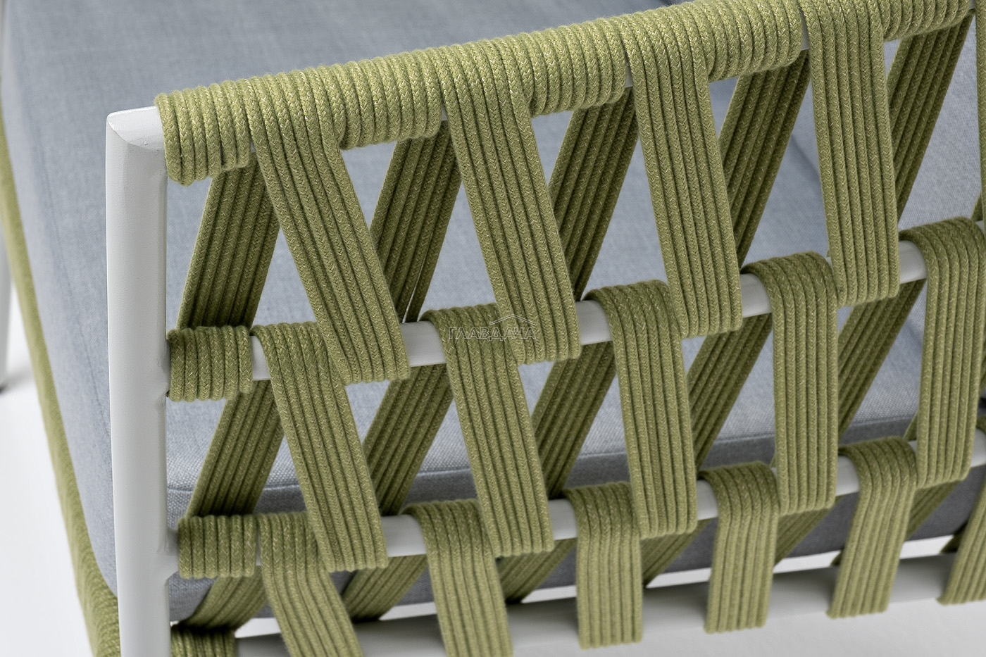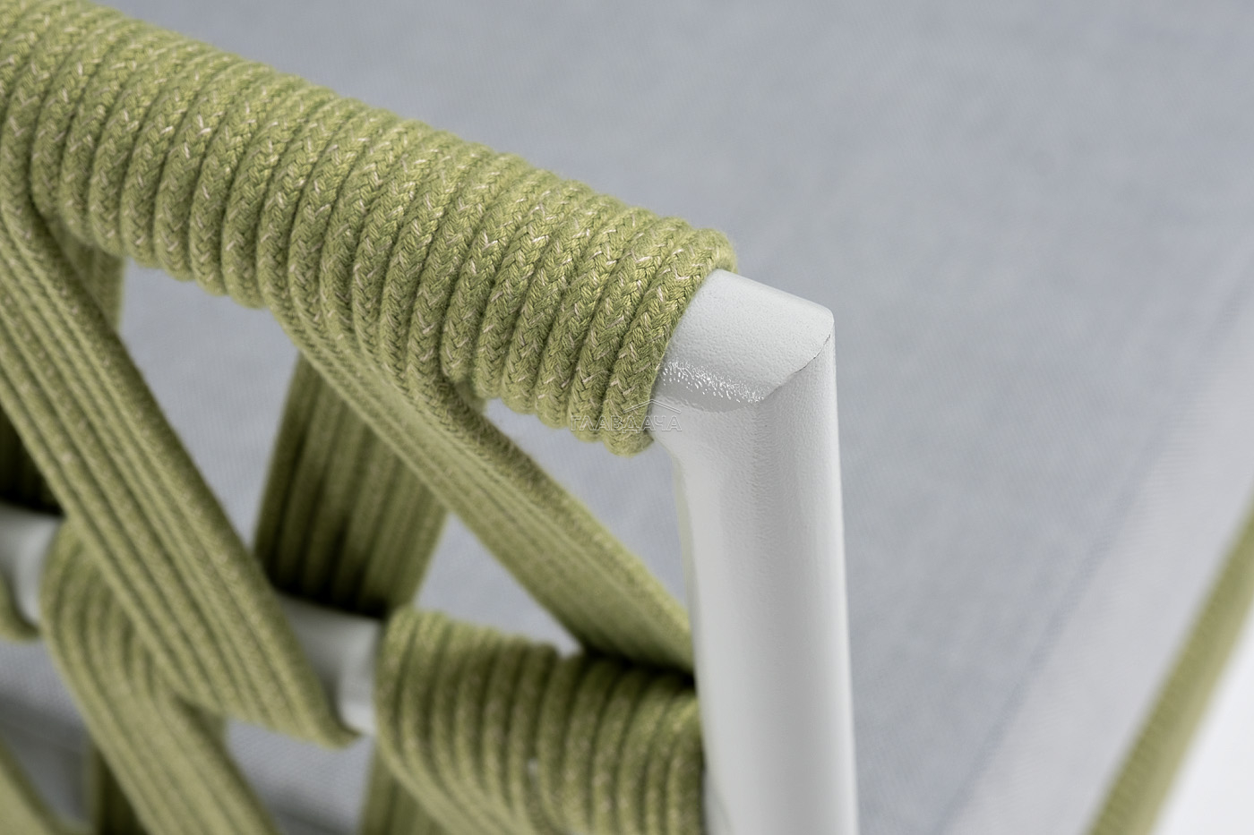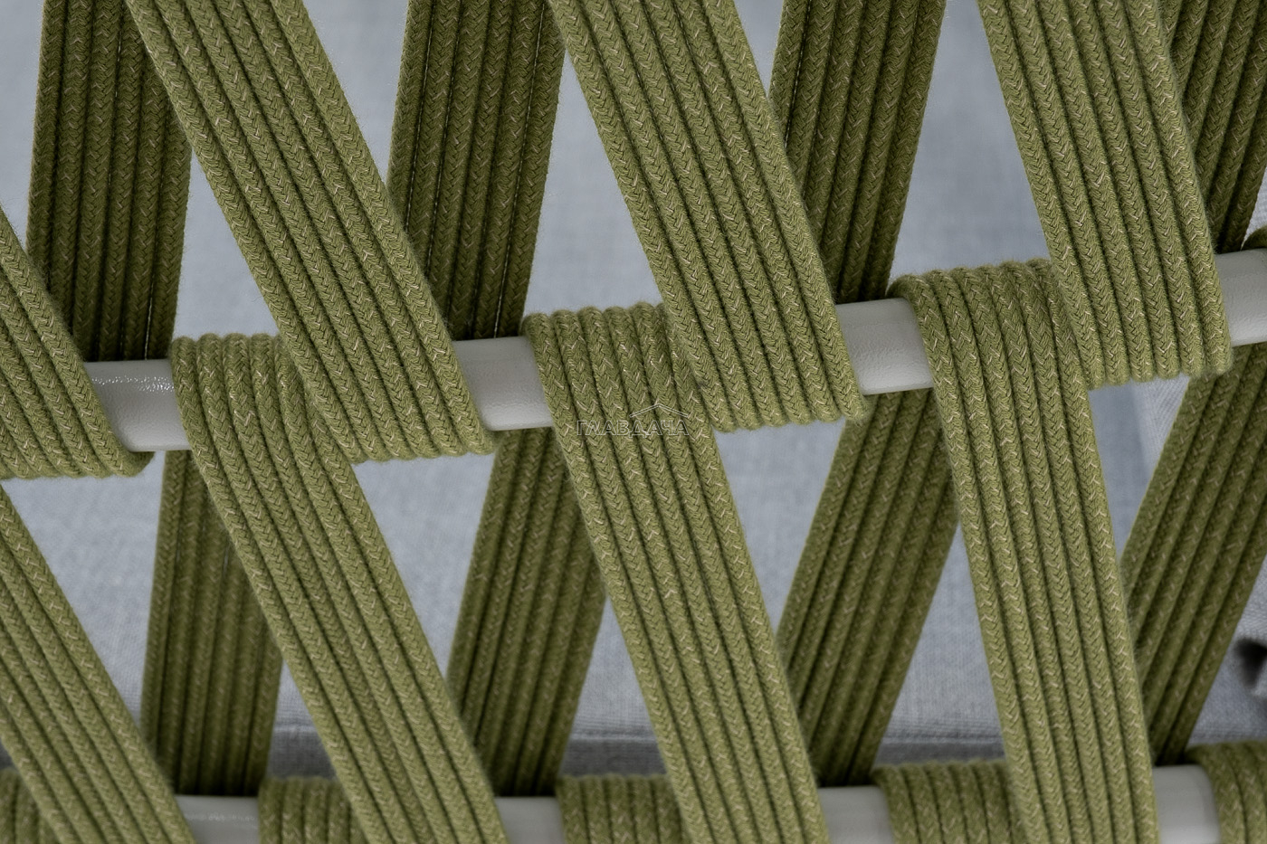 Кресло имеет алюминиевый каркас, окрашенный порошковой краской в светло-серый (RAL7035) цвет. Боковины каркаса вручную оплетены роупом - эластичными синтетическими лентами, изготовленными из высокопрочных полиэфирных волокон. Цвет оплетки - салатовый меланж.