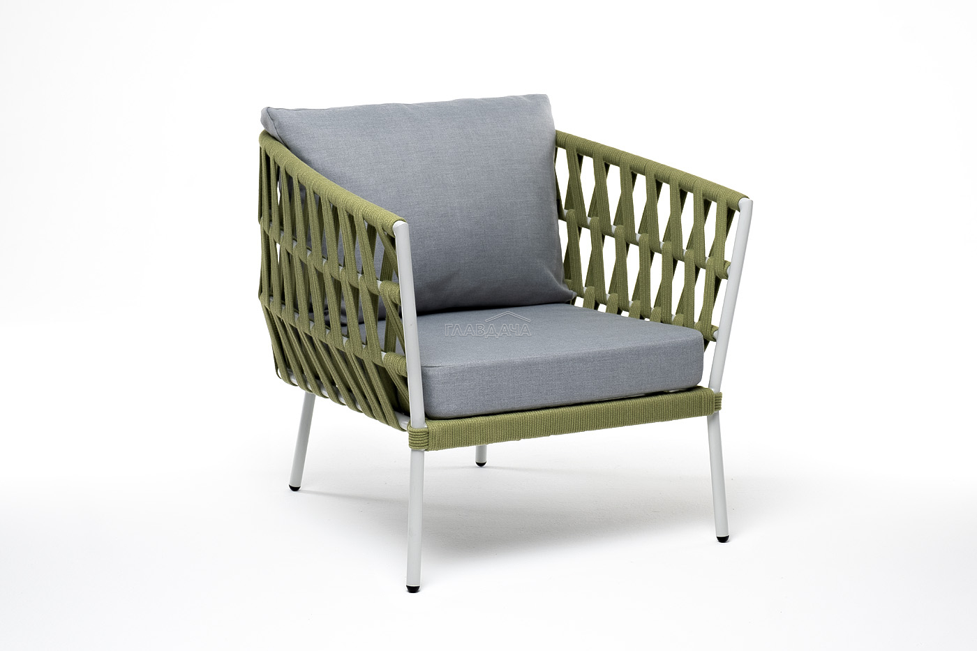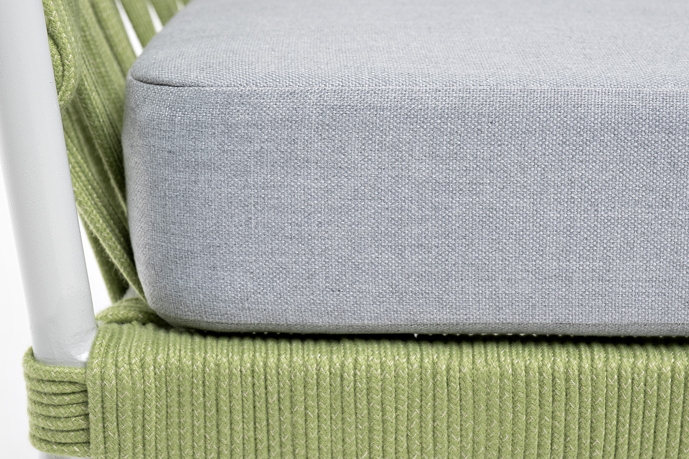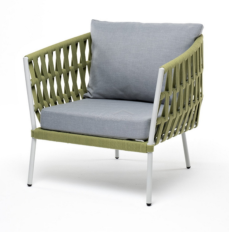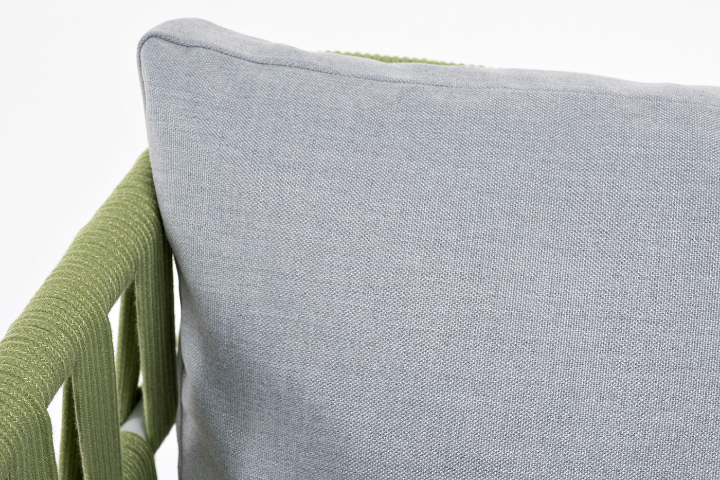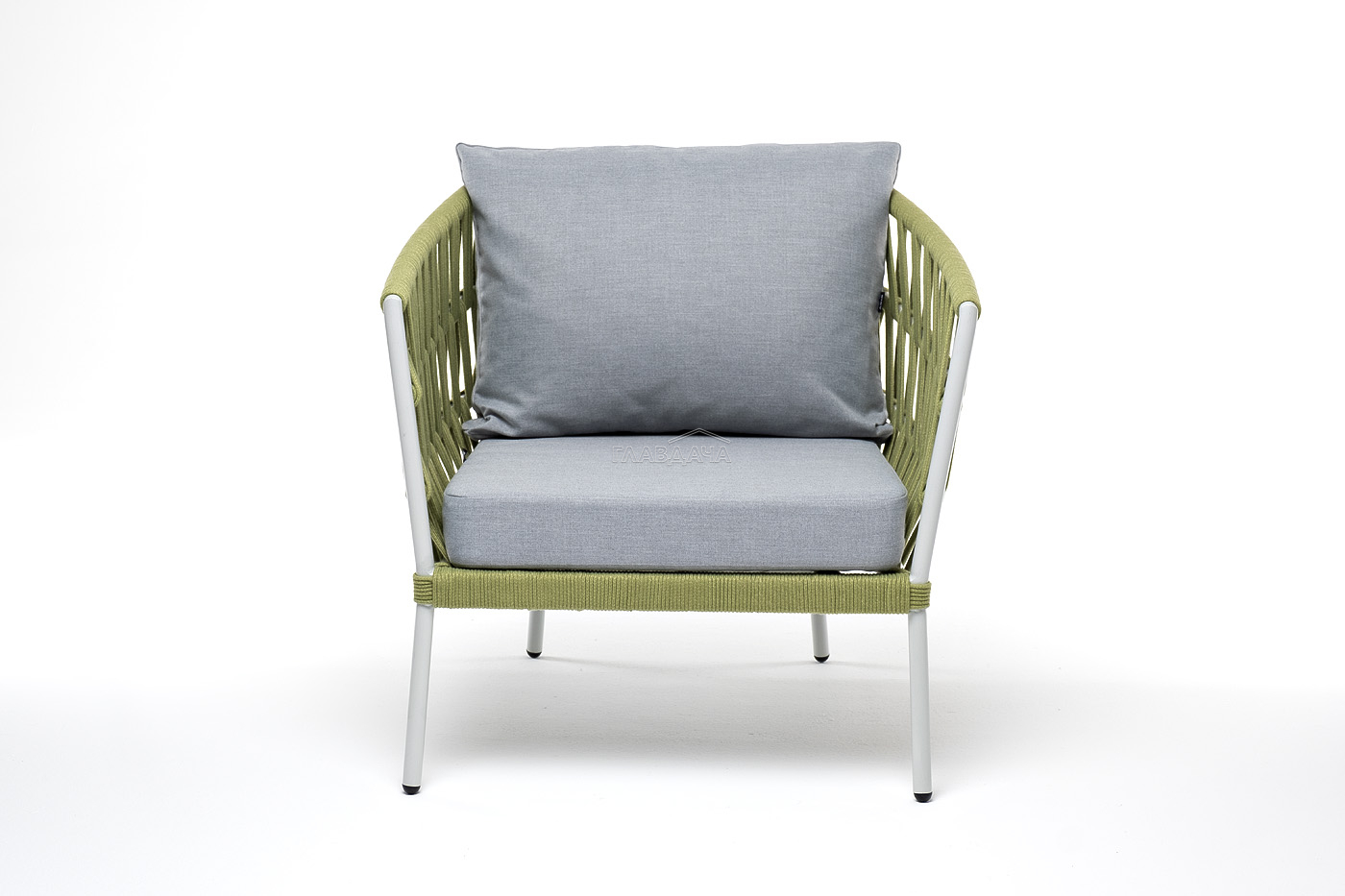 Кресло имеет алюминиевый каркас, окрашенный порошковой краской в светло-серый (RAL7035) цвет. Боковины каркаса вручную оплетены роупом - эластичными синтетическими лентами, изготовленными из высокопрочных полиэфирных волокон. Цвет оплетки - салатовый меланж.