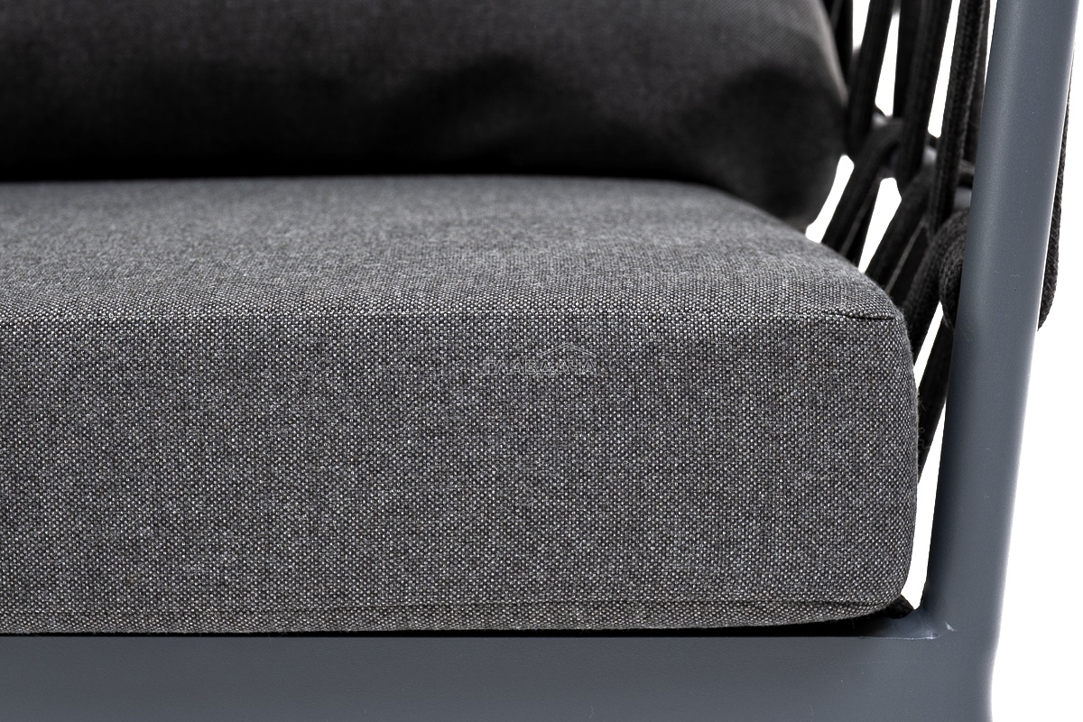 Кресло имеет алюминиевый каркас, окрашенный порошковой краской в темно-серый (RAL7024) цвет. Боковины каркаса вручную оплетены роупом - эластичными синтетическими лентами, изготовленными из высокопрочных полиэфирных волокон. Цвет оплетки - темно-серый.