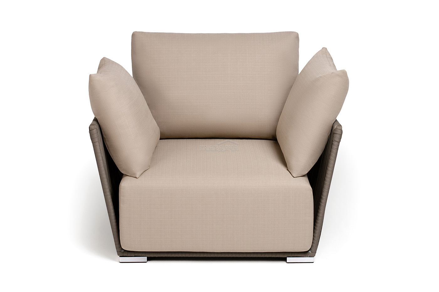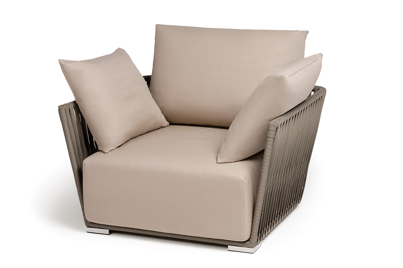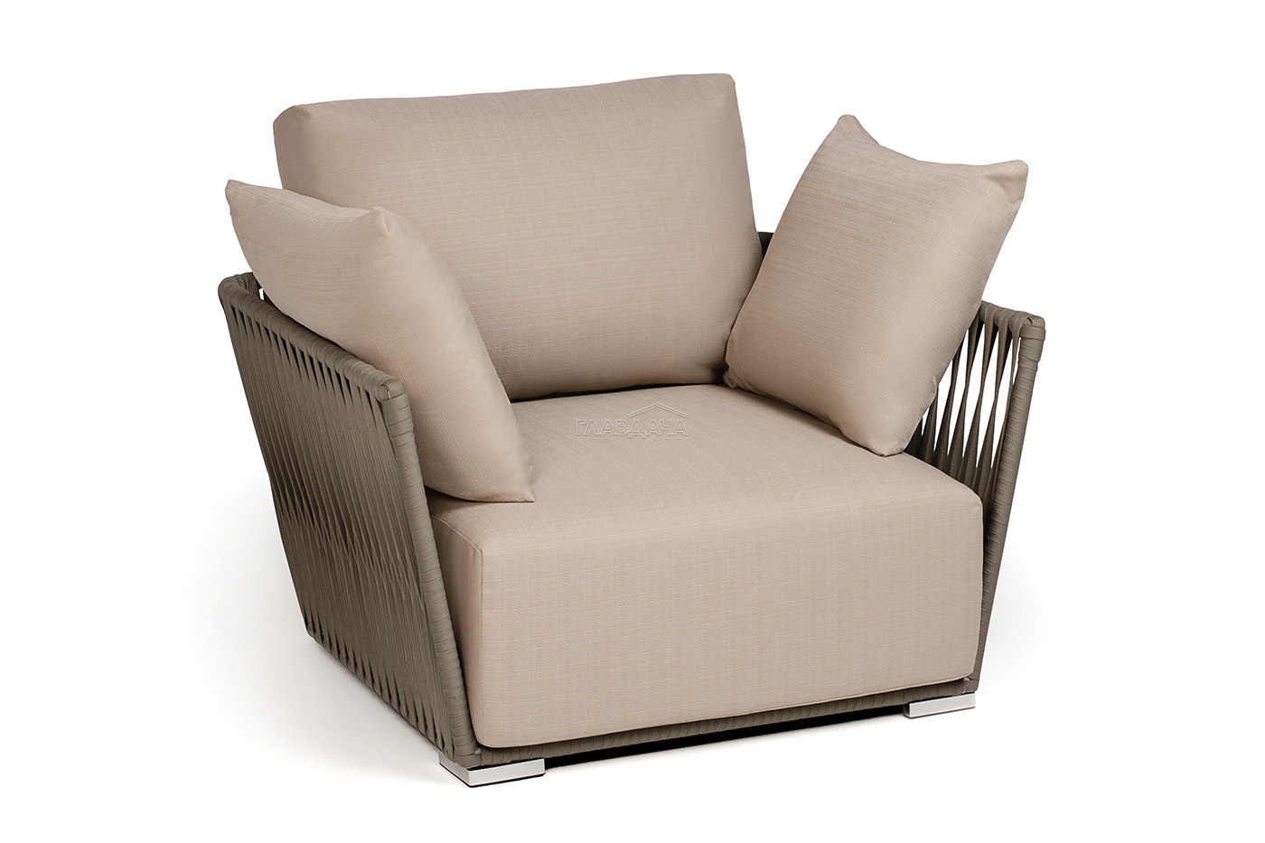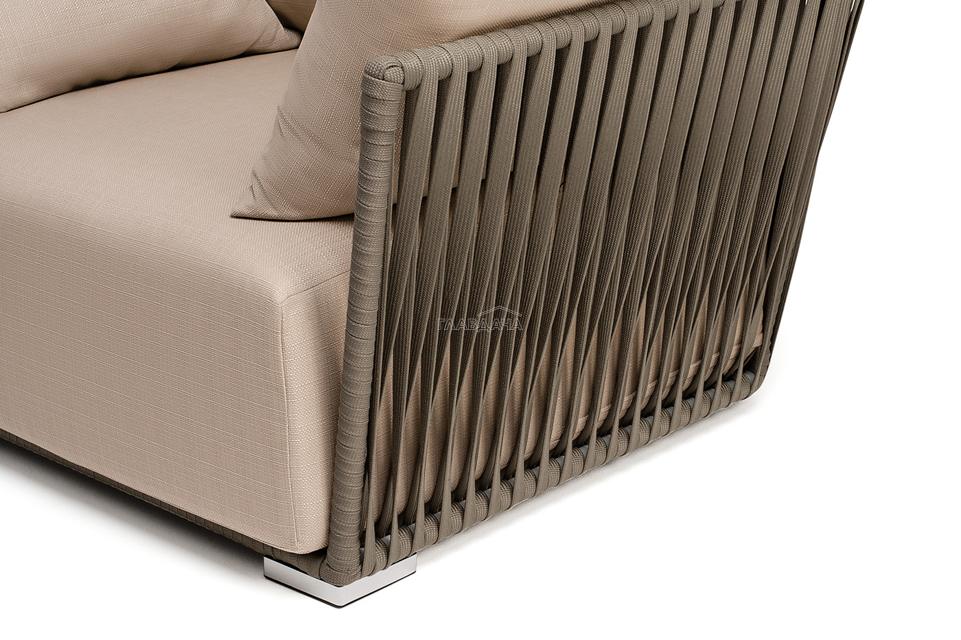 Кресло имеет алюминиевый каркас, окрашенный порошковой краской в светло-серый (RAL7035) цвет. Боковины каркаса вручную оплетены роупом - эластичными синтетическими лентами, изготовленными из высокопрочных полиэфирных волокон. Цвет оплетки - серо-коричневый.