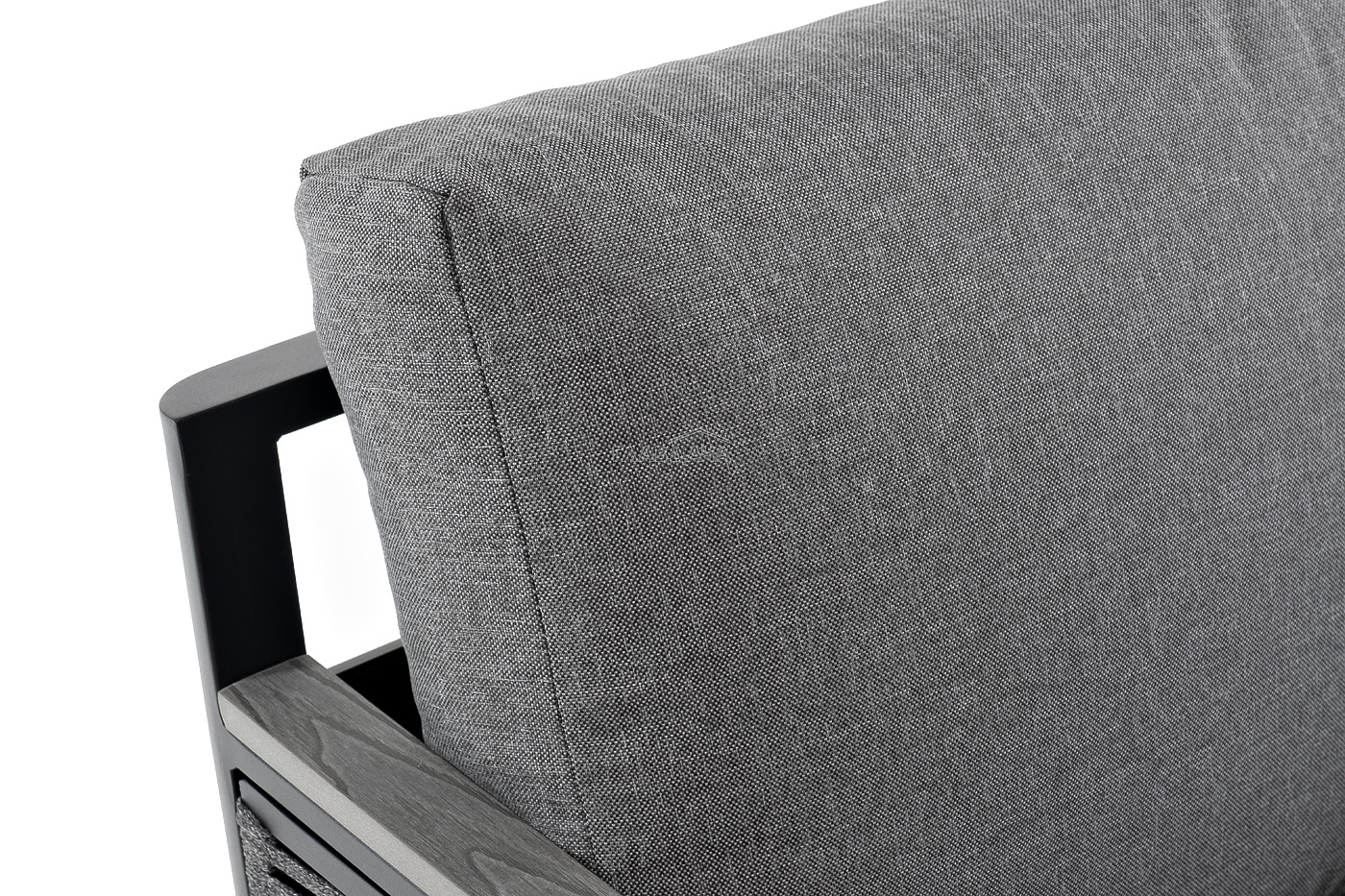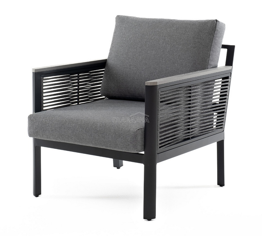 Садовое кресло идет в комплекте с двумя подушками со съёмными чехлами. Они выполнены в сером цвете. Изделия изготовлены из прочного полиэстера, плотностью 300гр/м2. Ткань имеет влагоотталкивающую пропитку.