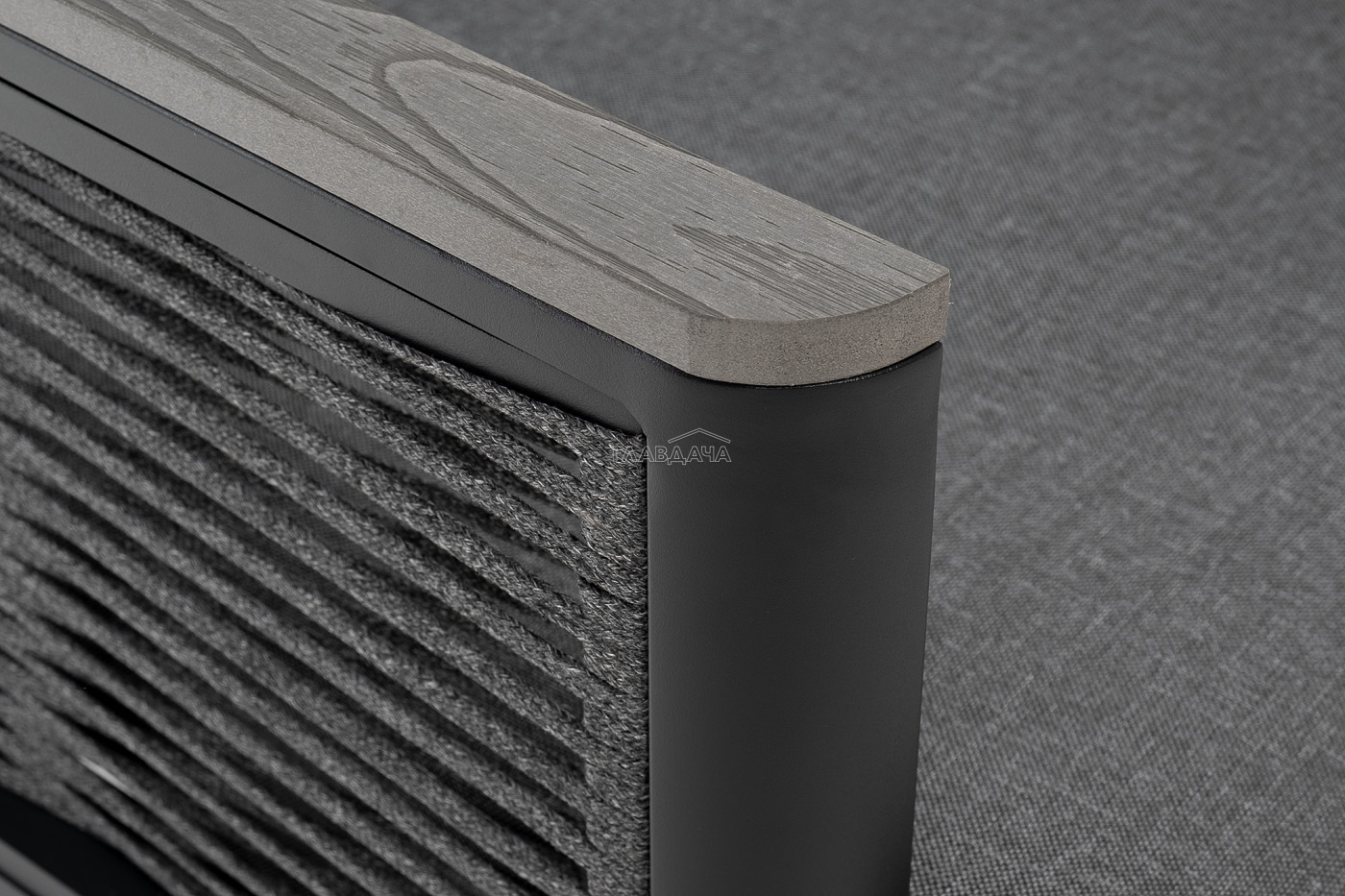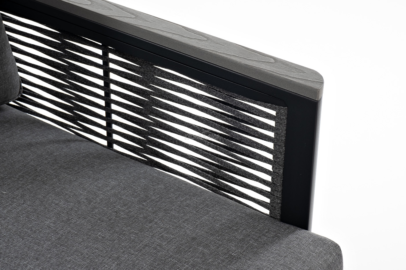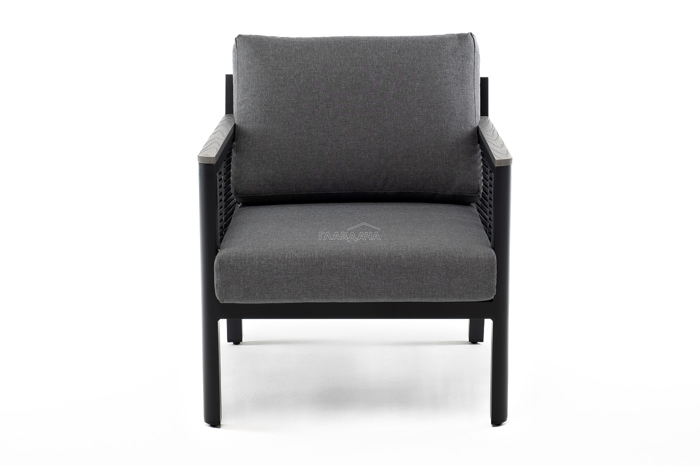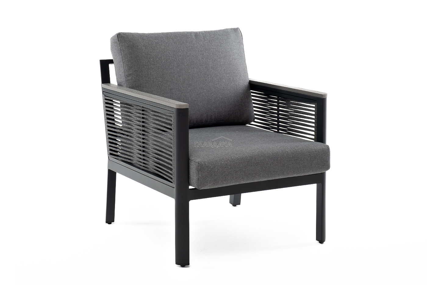 Размер модели – 680×780×700 мм. Ее каркас выполнен из высококачественного алюминия и окрашен порошковой краской в темно-серый цвет. Боковые стороны подлокотников вручную оплетены эластичными синтетическими лентами серого оттенка, состоящие из высокопрочных полиэфирных волокон.