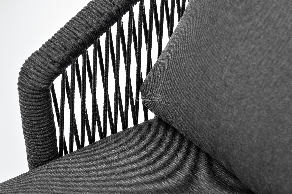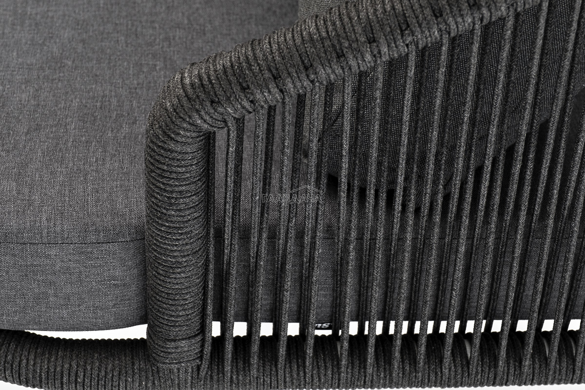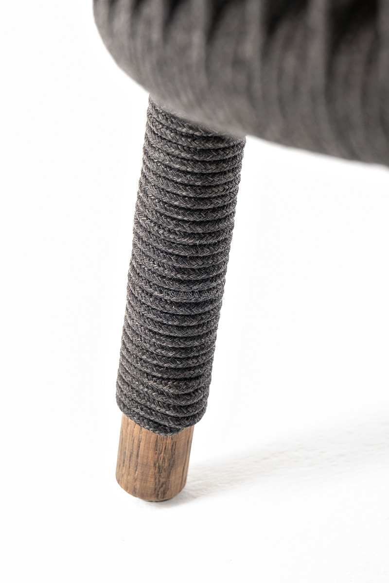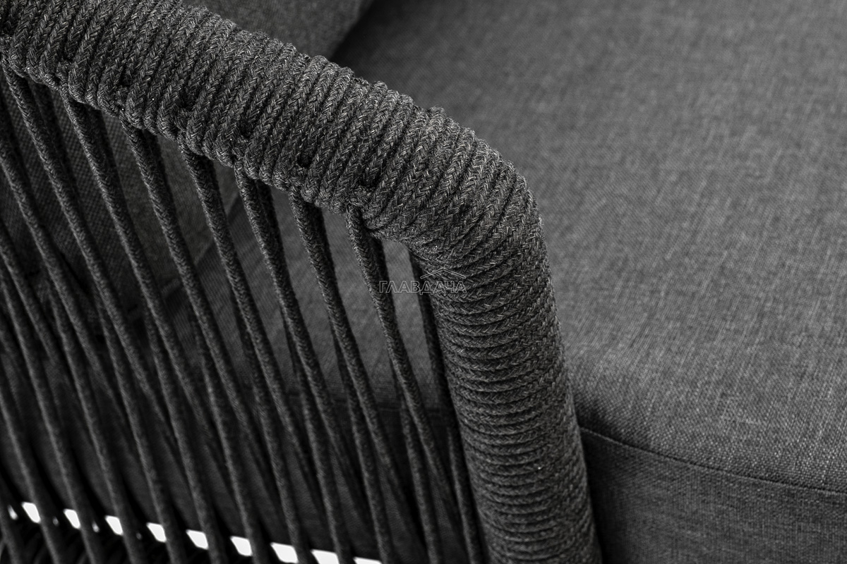 Кресло имеет алюминиевый каркас, окрашенный порошковой краской в темно-серый (RAL7024) цвет. Боковины каркаса вручную оплетены роупом - эластичными синтетическими лентами, изготовленными из высокопрочных полиэфирных волокон. Цвет оплетки - темно-серый. На ножках кресла идут дубовые наконечники (заглушки).